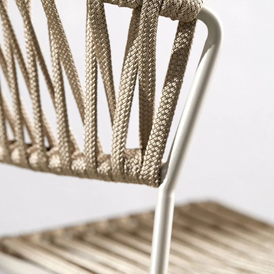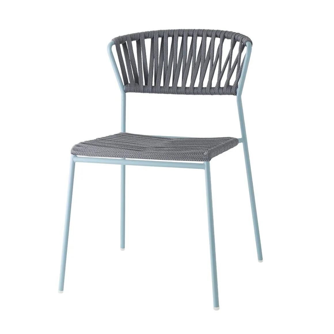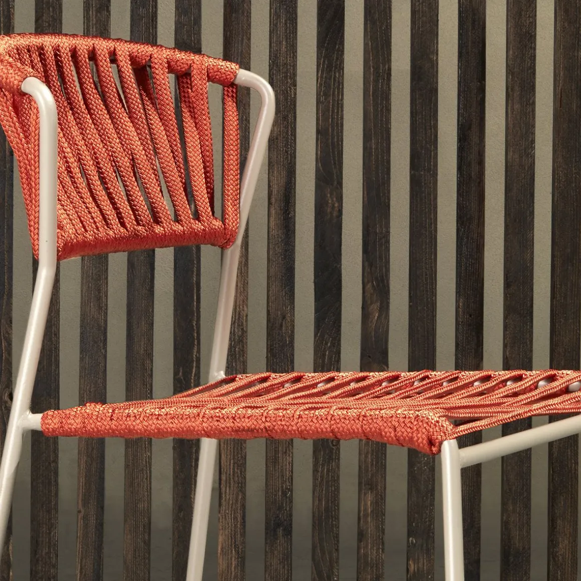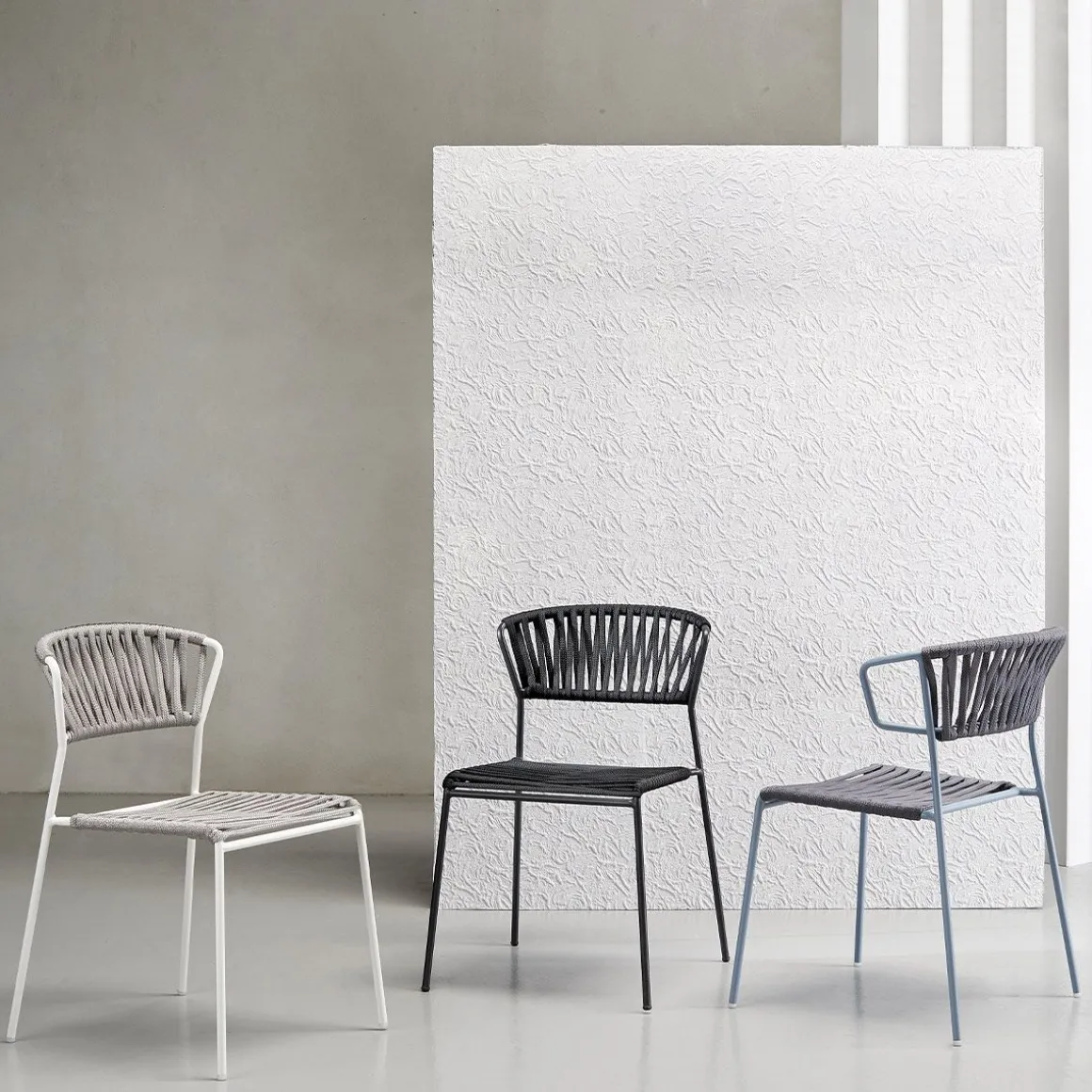 Les lacets de corde nautique rendent Lisa Filò résistante à la vie en plein air. La chaise et le fauteuil sont disponibles en cinq variantes de structure/couleur, afin de mettre en valeur les espaces publics et privés par leurs tissages.
