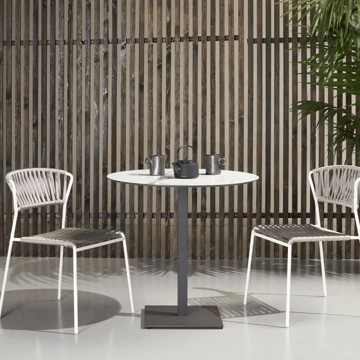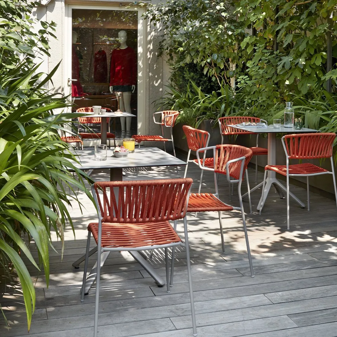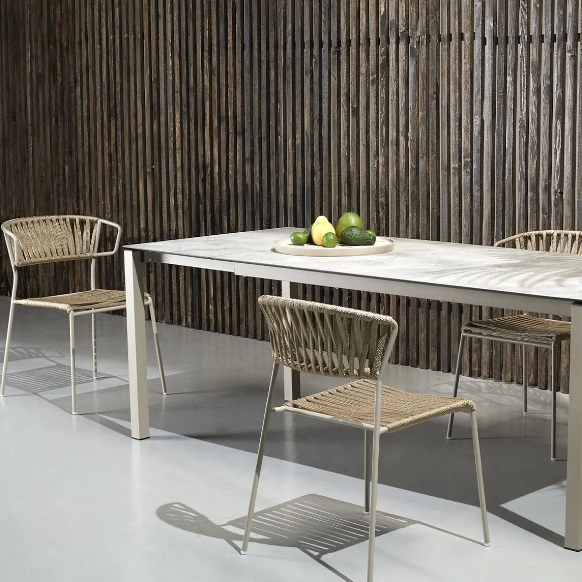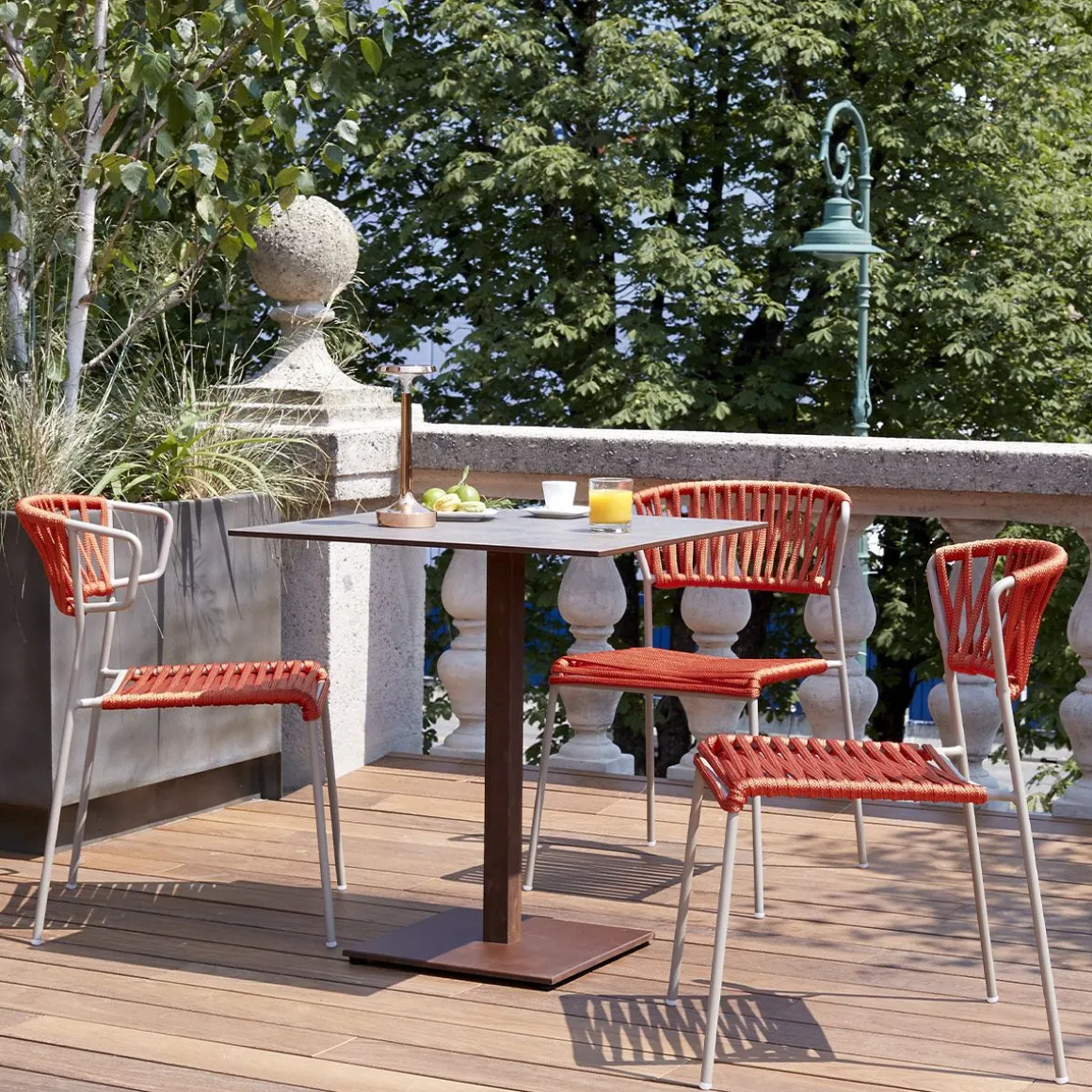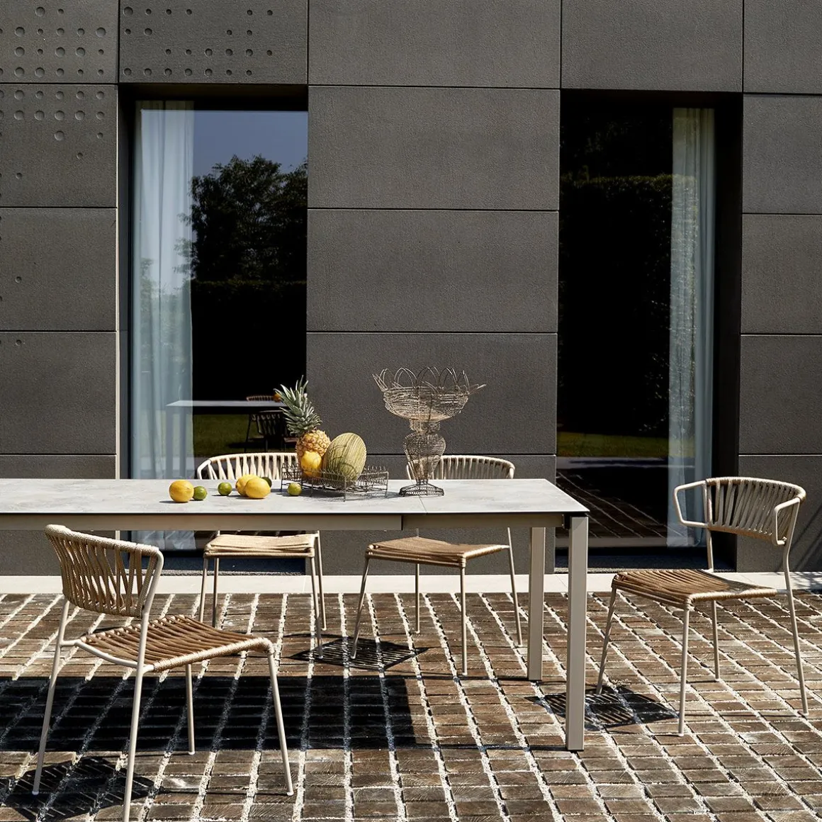 Les lacets de corde nautique rendent Lisa Filò résistante à la vie en plein air. La chaise et le fauteuil sont disponibles en cinq variantes de structure/couleur, afin de mettre en valeur les espaces publics et privés par leurs tissages.