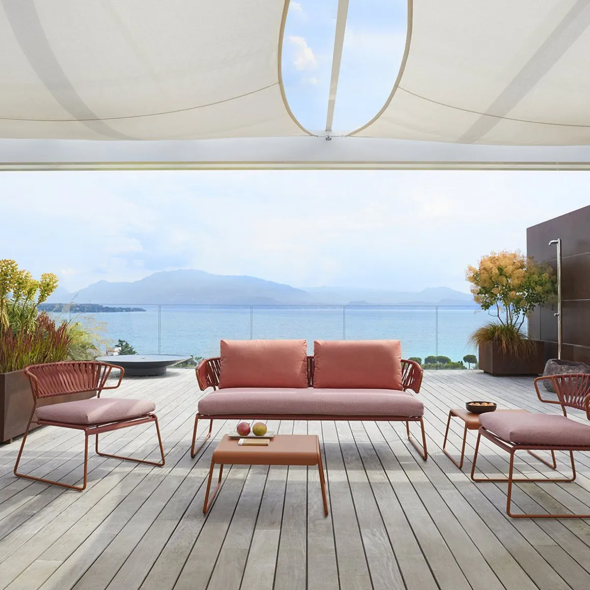 Robuste et accueillant, le canapé de jardin Lisa Sofa Club garantit solidité et sécurité grâce à la structure traîneau métallique. Le dossier tressé est en extrudé de PVC : les coussins généreux accueillent avec douceur et résistent sans problèmes aux intempéries et à l’usure du temps.
