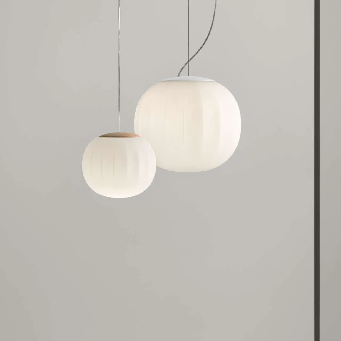 Son diffuseur en verre soufflé opalin, balayée par de légères verticales et combinée à une structure en bois, vous procure une lumière douce et tamisée. Un objet intemporel et séduisant par sa forme et sa matière.