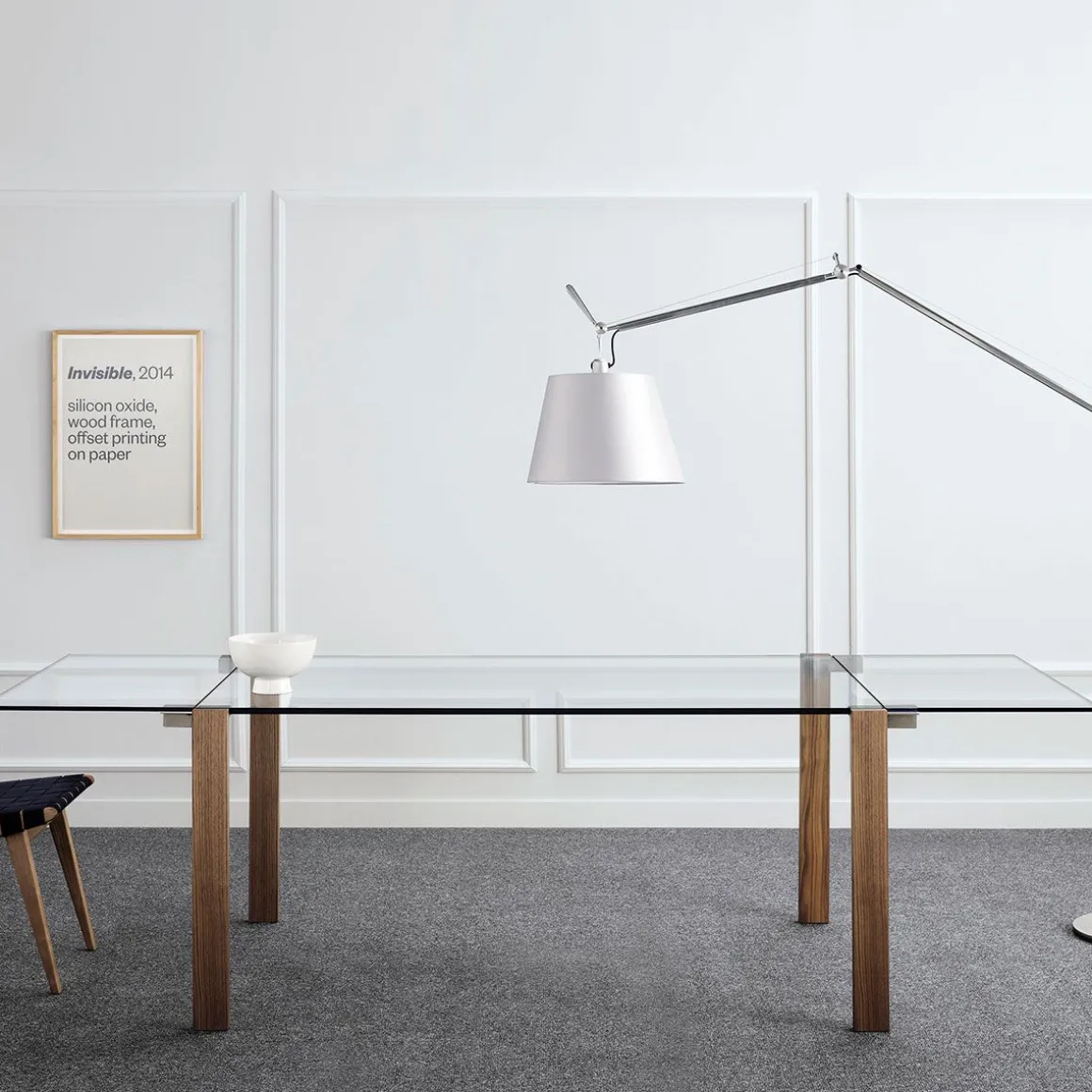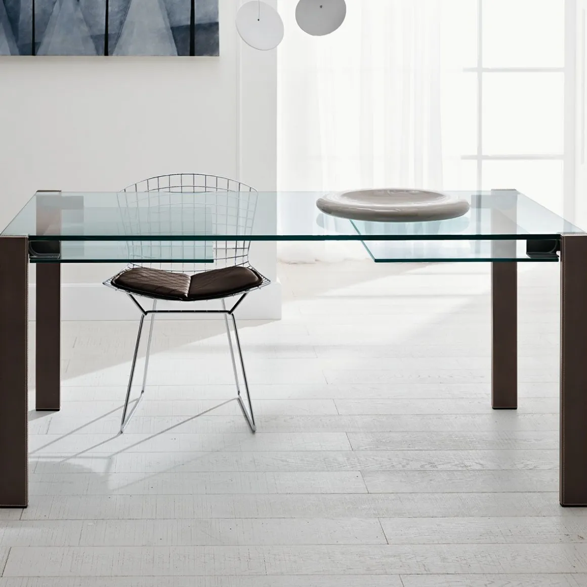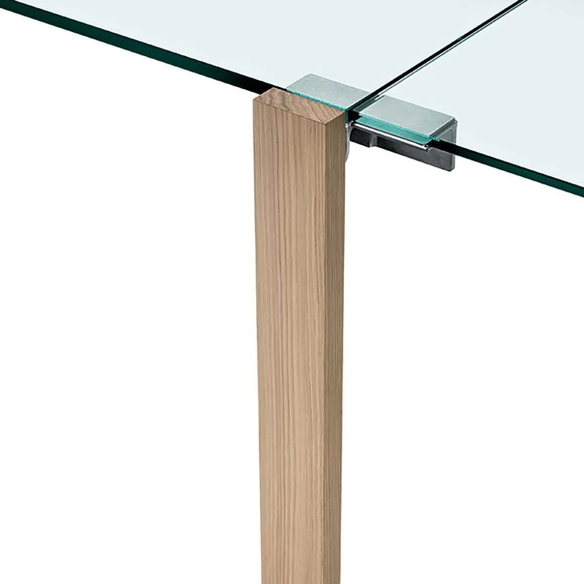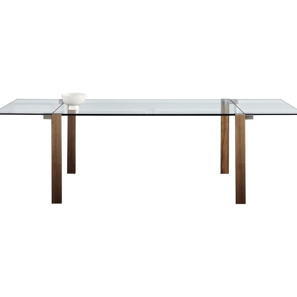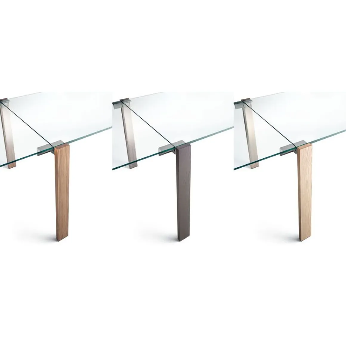 Matériaux : plateau en verre transparent avec rallonges transparentes et pieds en bois en noyer canaletto, chêne ou wengé