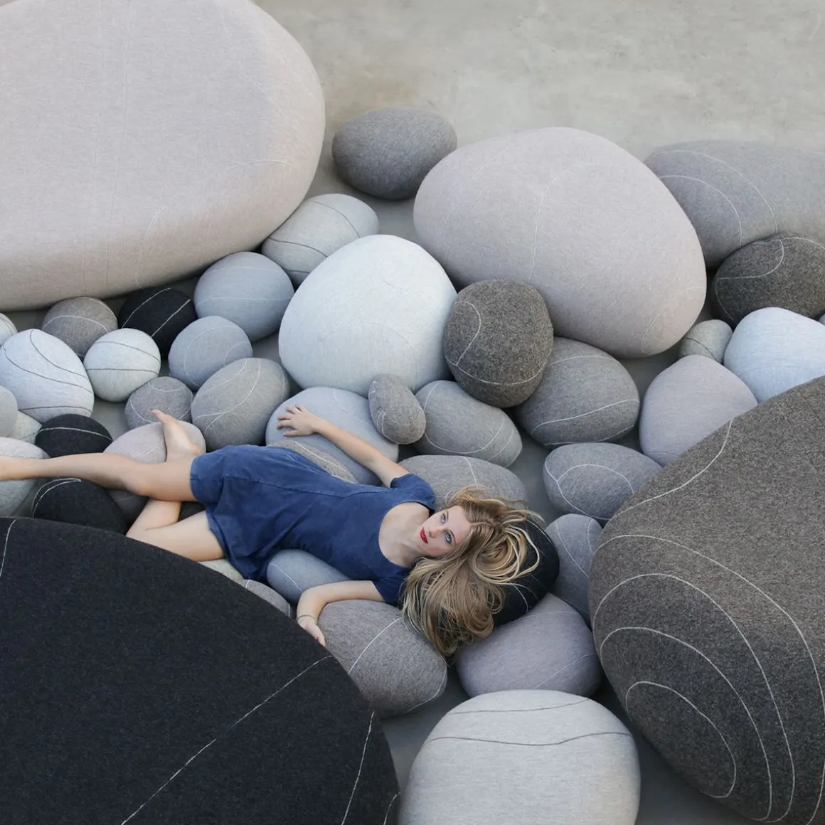 Livingstones de Smarin est un ensemble surréaliste de très belle qualité. Des galets surdimensionnés, une plage de repos à géométrie variable pour intérieur contemporain. Des galets comme paysage chimérique de vacances idéales, permanentes, transformés en jeu jouissif d’appartement. La palette des nuances, le choix des formes et volumes sont assez vastes pour permettre une composition unique, parfaitement adaptée à chaque intérieur, modulable à l’infini.