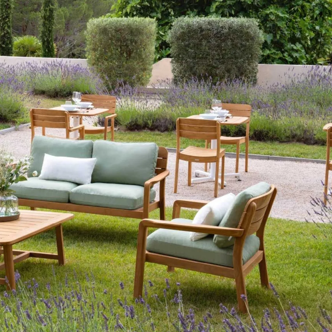 Matériaux : Structure teck massif, finition naturelle (non huilé), coussins habillage toile teint masse