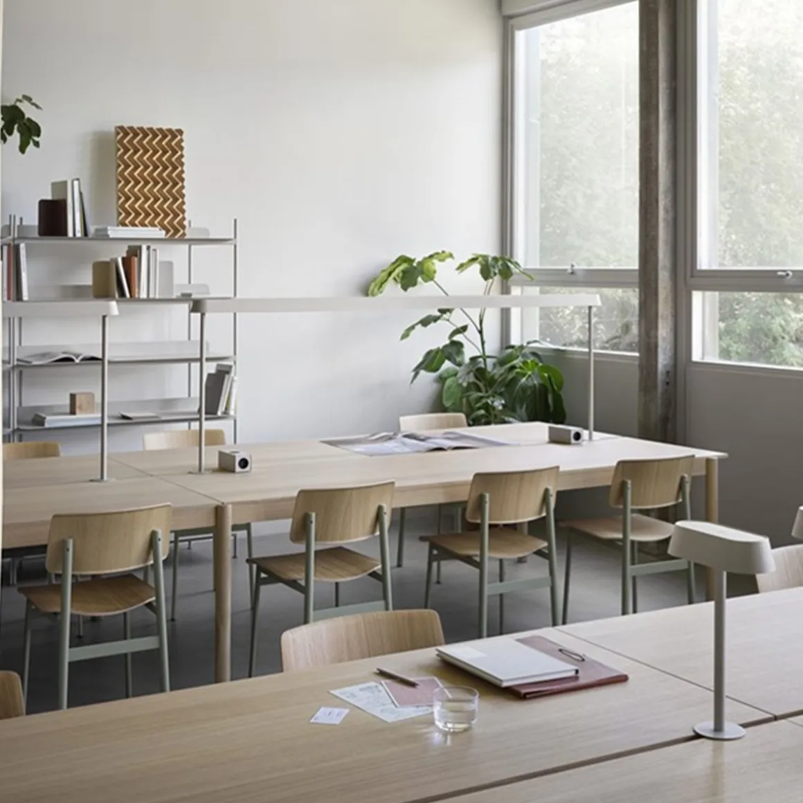 La chaise équilibre les matériaux chauds et froids avec son siège et dos en chêne, et la structure en acier enduit de poudre.
