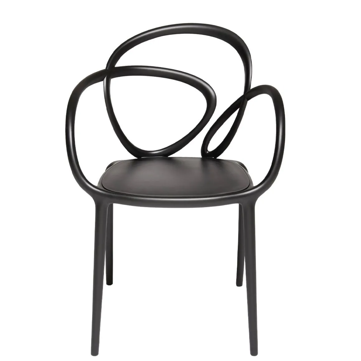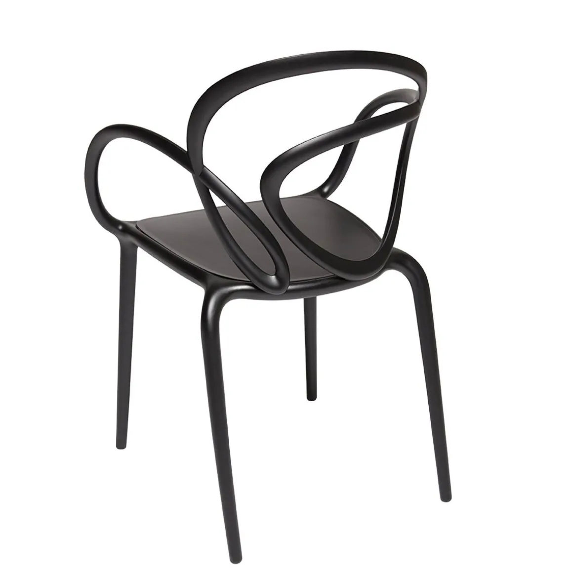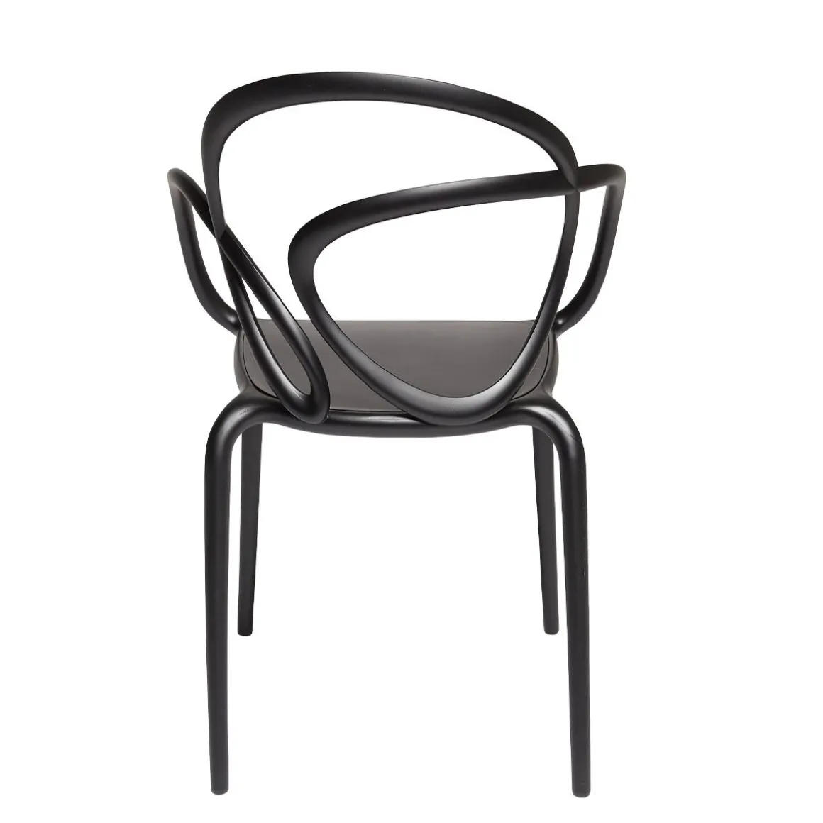Loop de Qeeboo par Front. Loop est une chaise conçue comme un enchevêtrement visuel. Avec un dossier à motif bouclé, comportant une seule ligne qui s’enroule sur elle-même, matérialisant le mouvement du crayon dans l’espace, tour par tour, la chaise Loop est proposée en lot de deux et peut être utilisée aussi bien en intérieur qu’en extérieur.