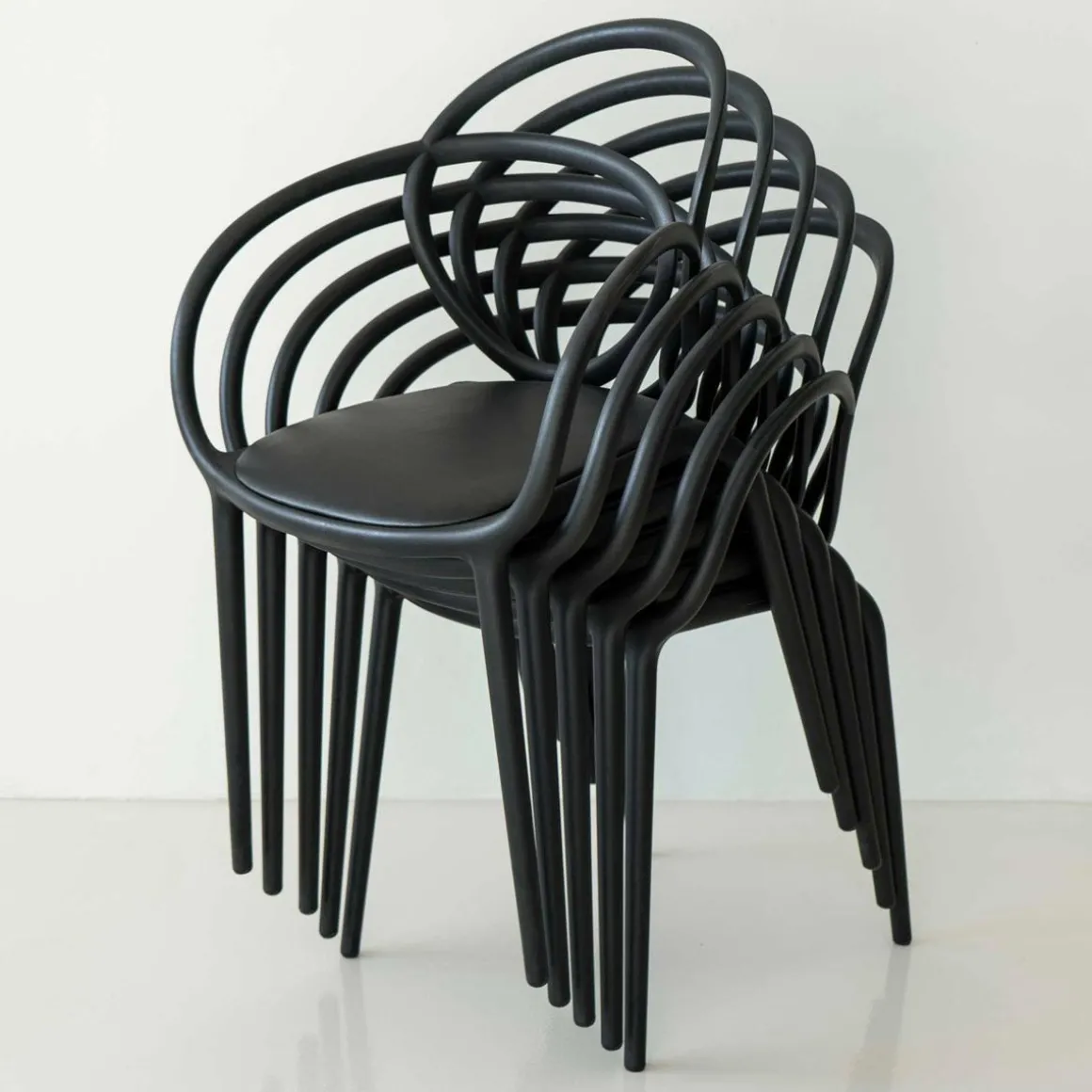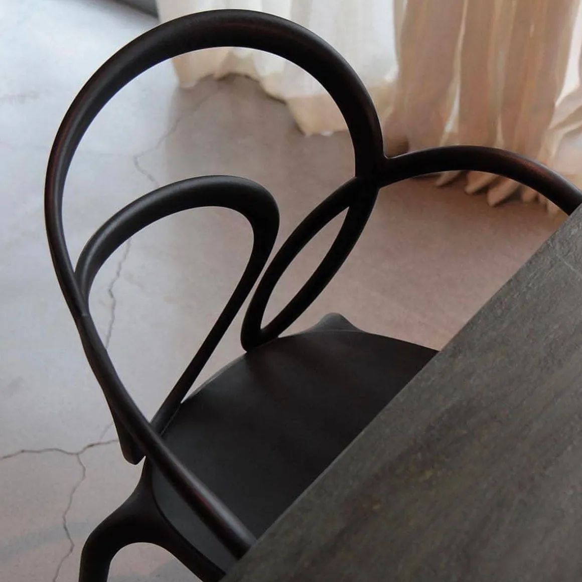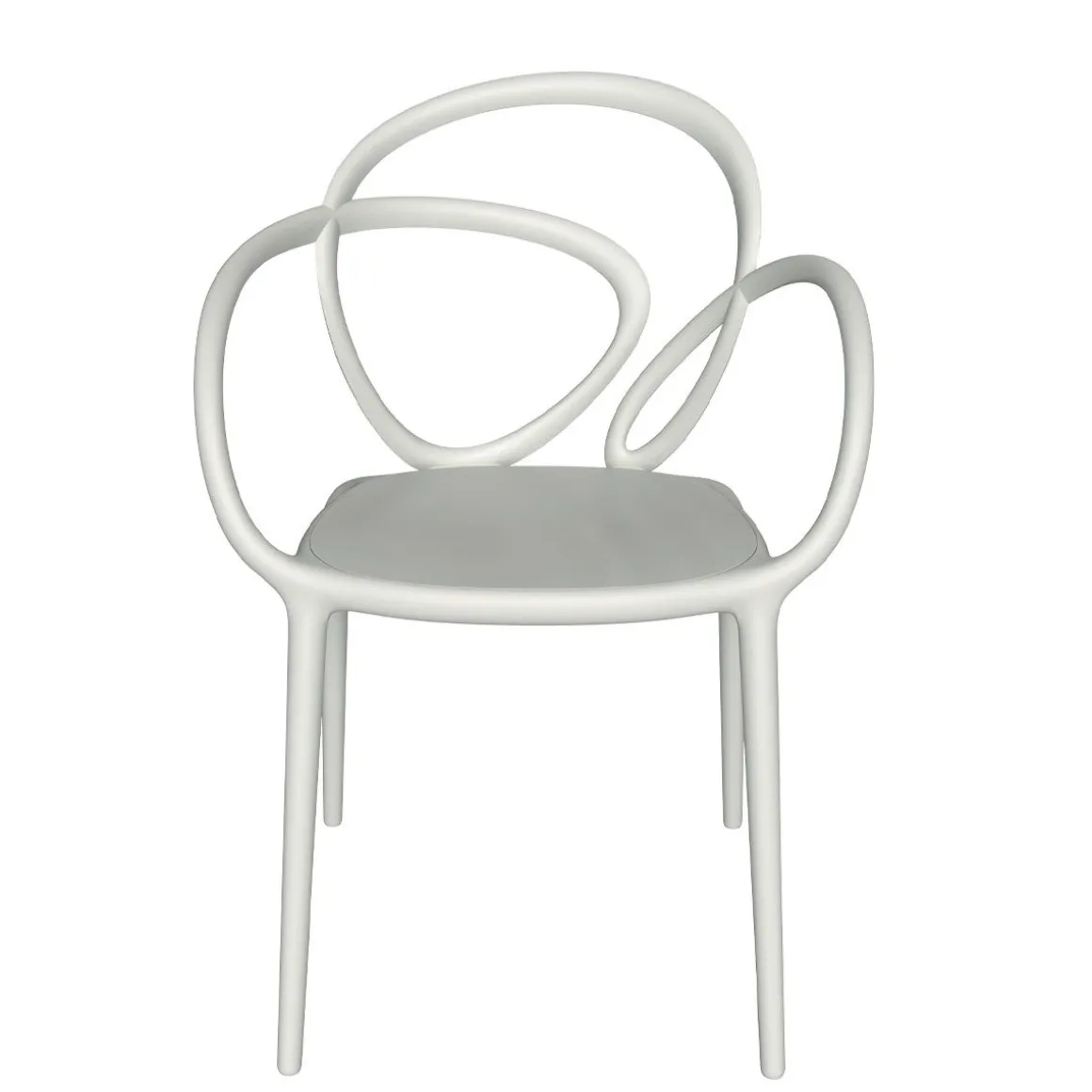 Loop de Qeeboo par Front. Loop est une chaise conçue comme un enchevêtrement visuel. Avec un dossier à motif bouclé, comportant une seule ligne qui s’enroule sur elle-même, matérialisant le mouvement du crayon dans l’espace, tour par tour, la chaise Loop est proposée en lot de deux et peut être utilisée aussi bien en intérieur qu’en extérieur.