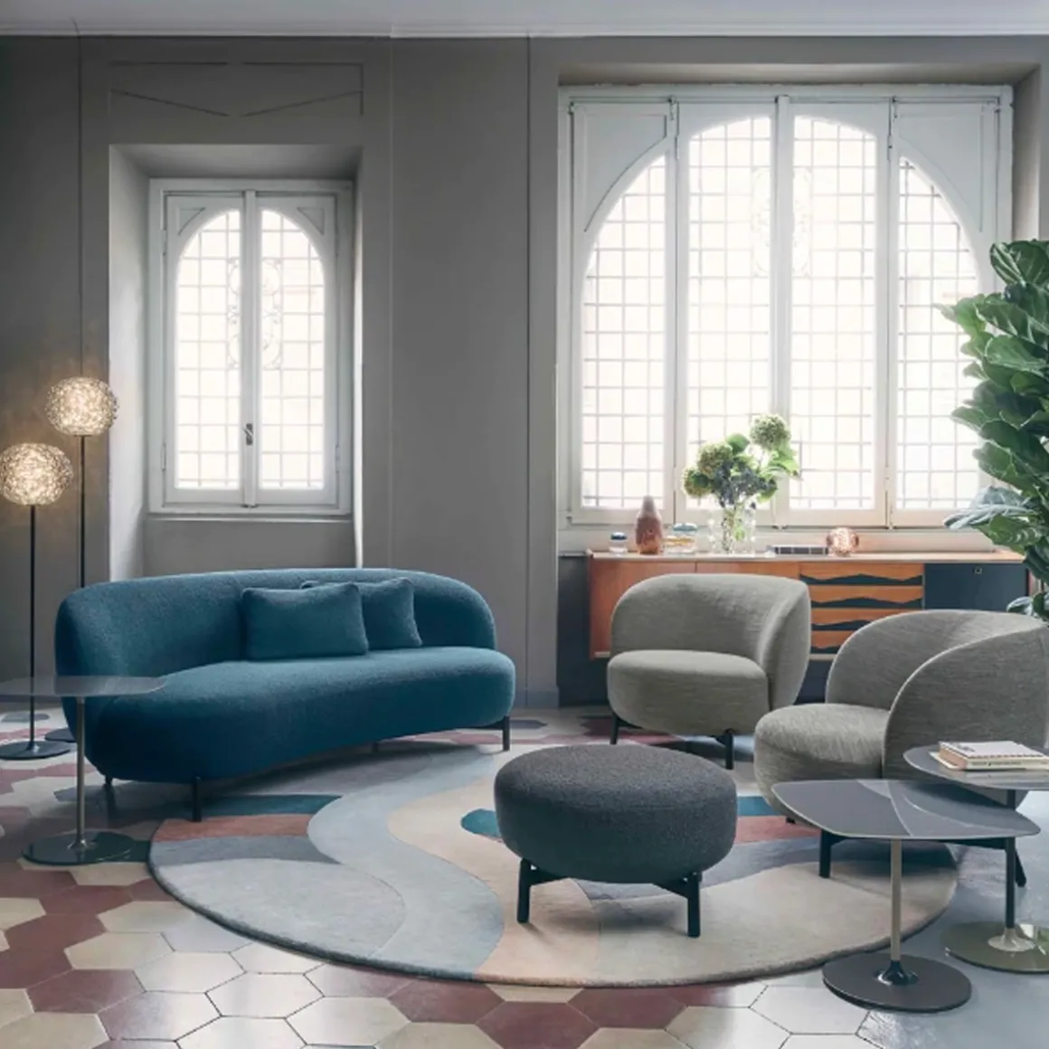 LUNAM est une collection imaginée pour la pièce de vie qui raconte les atmosphères oniriques des paysages lunaires. Une structure essentielle en métal peint soutient les volumes généreux des assises rembourrées.