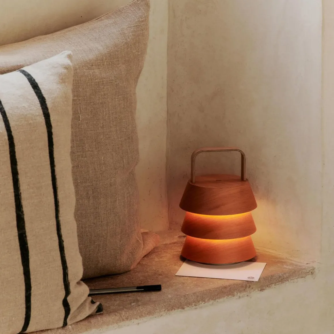 Luver de Ferm Living. La Lampe portative Luver allie élégance et portabilité. La structure empilée des trois abat-jours coniques en sapin de Douglas met en valeur la précision du travail artisanal de la lampe. La poignée en bois courbé à la vapeur ajoute une touche artisanale et humaine, tandis que la lampe design apporte une lumière diffuse qui crée une atmosphère chaleureuse. Avec un variateur tactile et trois niveaux d’éclairage, elle est idéale pour une utilisation à l’intérieur et à l’extérieur par temps sec. Cette lampe polyvalente et au design élégant ajoute de la chaleur et de la sophistication à n’importe quel espace.
