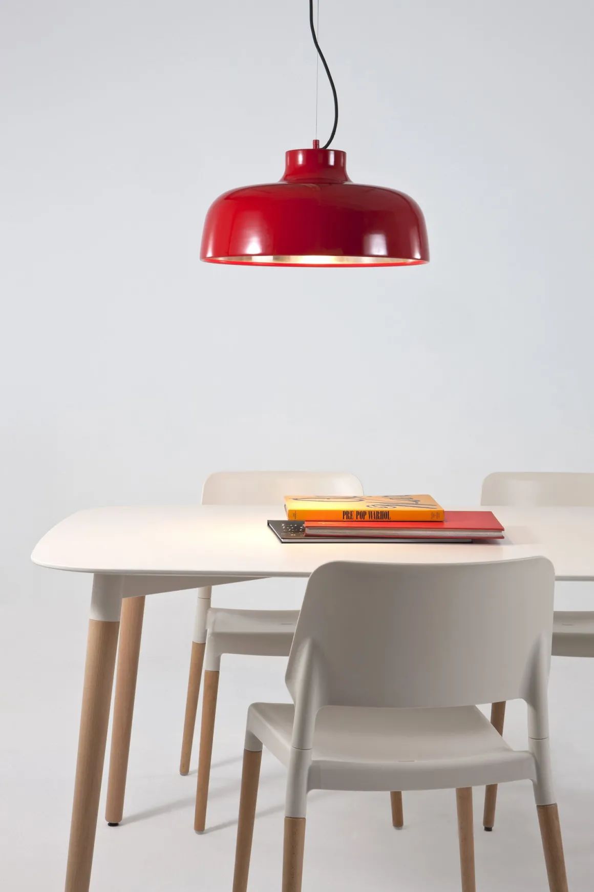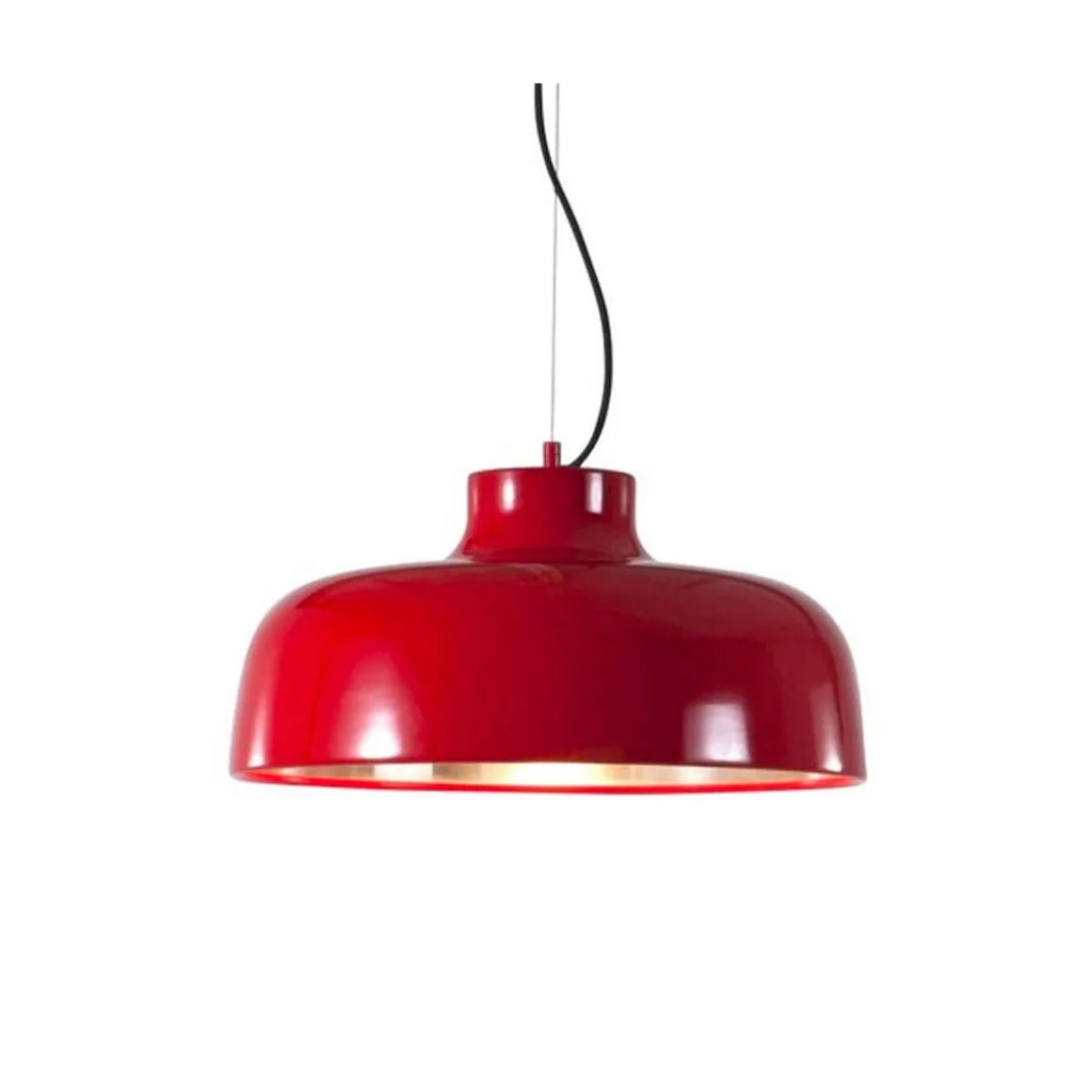 Abat-jour et rosette plafond en aluminium laqué brillant coloris rouge.
