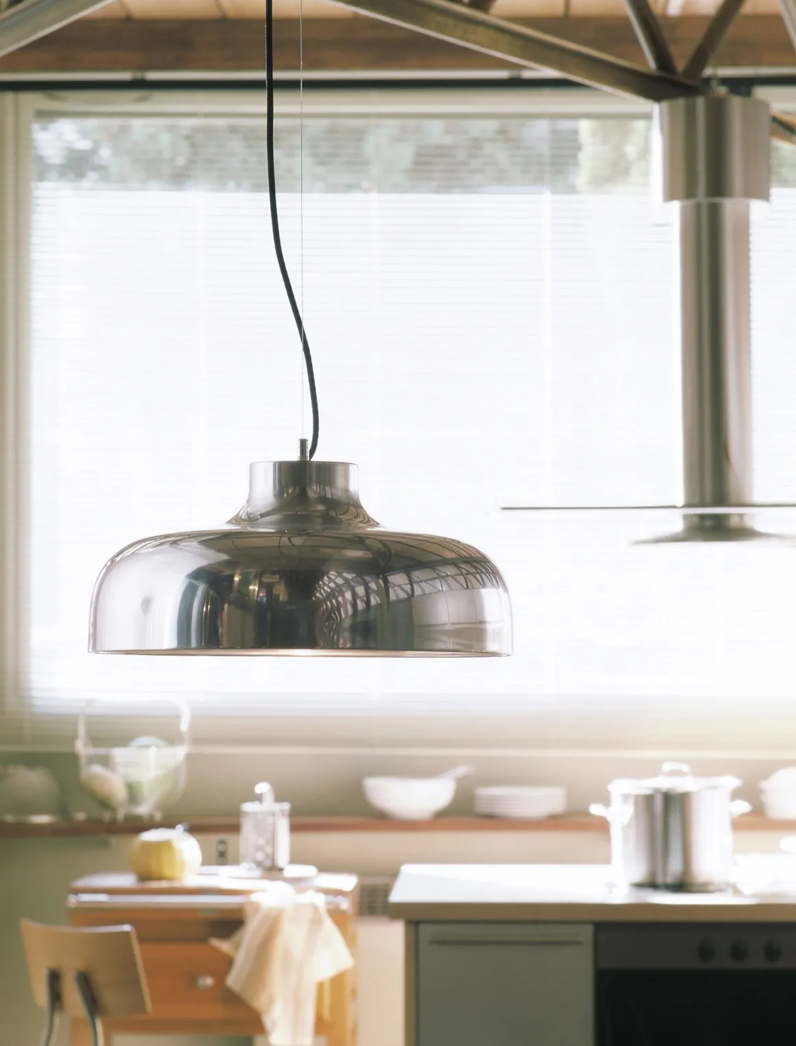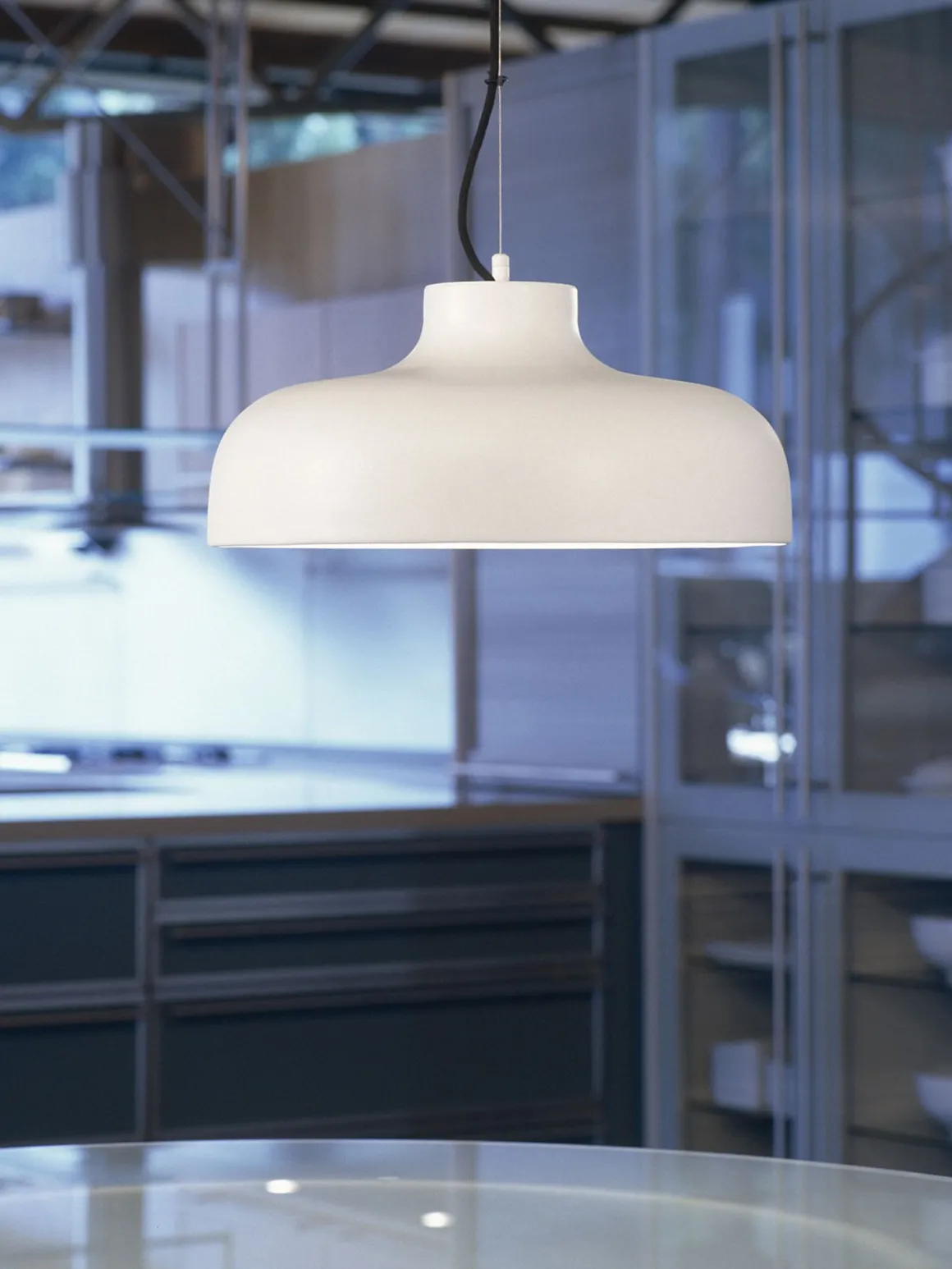 Lampe de suspension qui immortalise la silhouette des épaules d’une femme. Elle consiste en un grand réflecteur d’aluminium, du centre supérieur duquel part le câble électrique à partir d’ un petit cylindre métallique, qui réalise la transition entre le réflecteur et le fin fil d’acier assurant la suspension.