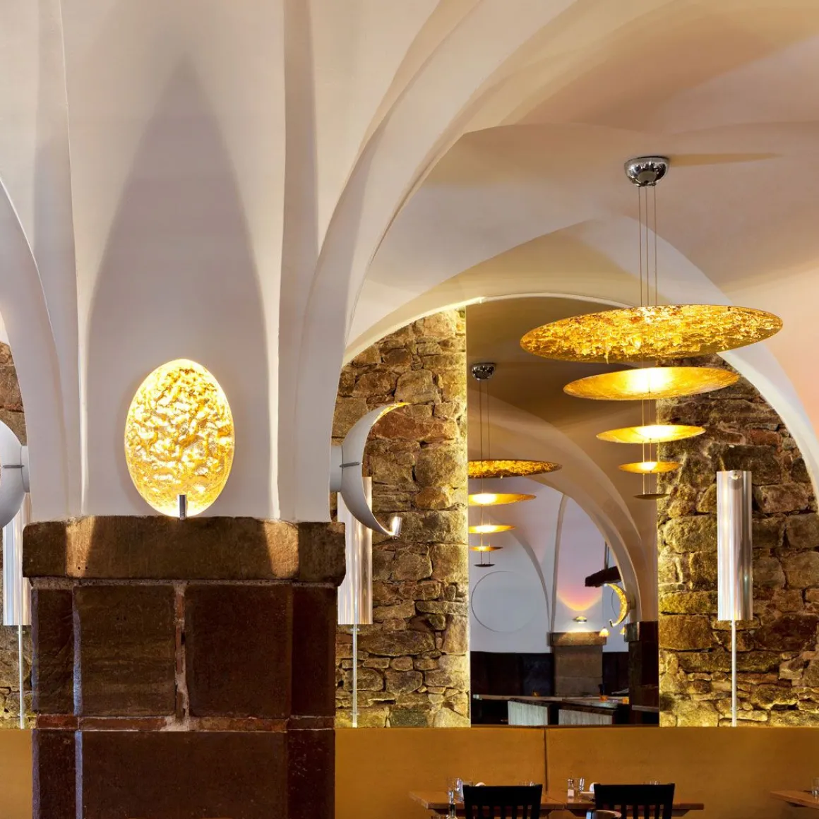 Macchina della Luce a émergé de la collection Luci d’Oro, et a également été développée après réflexion sur la couleur de la lumière : la lumière dorée du soleil et du feu, lumière chaude, dans laquelle le concept de réfraction a commencé à prendre forme dans l’esprit d’Enzo Catellani et qu’il a utilisé plus tard dans d’autres créations.