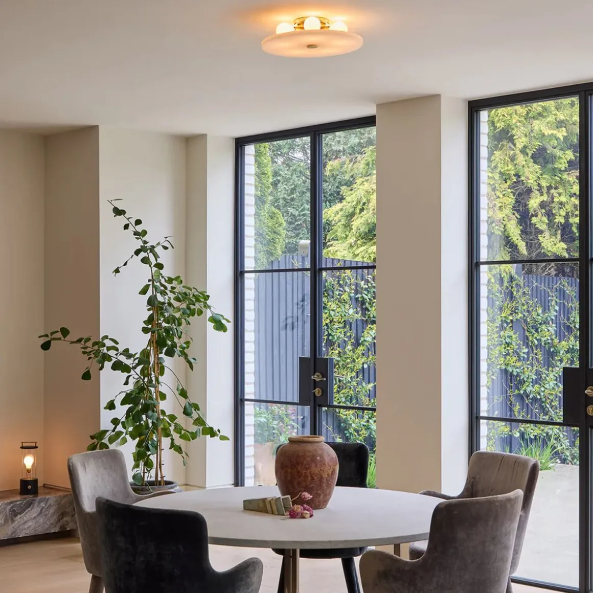 Magma est une série de luminaires innovante de Tala, réputée pour son diffuseur décoratif en forme de disque de verre fabriqué à partir de panneaux solaires recyclés. Monté en surface pour un profil élégant et subtil, le Magma Flush Mount est doté d’un cadre en laiton massif et de cinq ampoules G70 blanc mat. Protégée par un disque de verre de 425 mm de diamètre, la lumière diffuse crée une ambiance subtile dans les espaces liminaires.