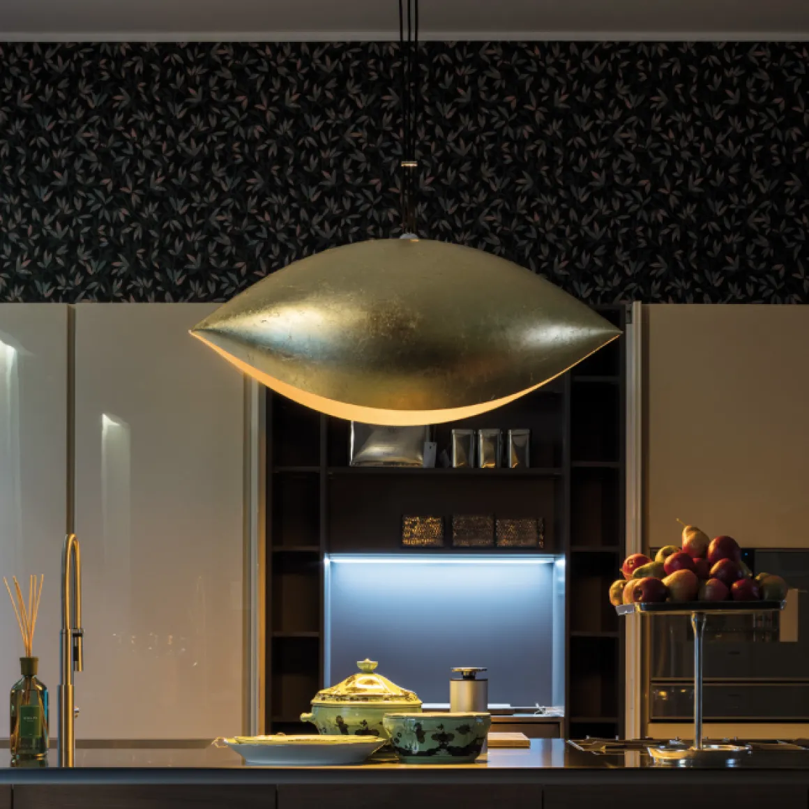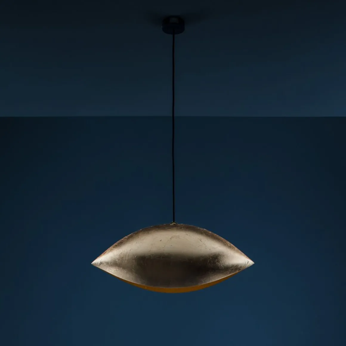 Luci d’Oro naît comme une réflexion sur la couleur de la lumière : la lumière dorée du soleil, du feu ; des lumières chaudes, où le concept de réfraction commence à prendre forme dans l’esprit d’Enzo Catellani, qui l’appliquera souvent à d’autres créations.