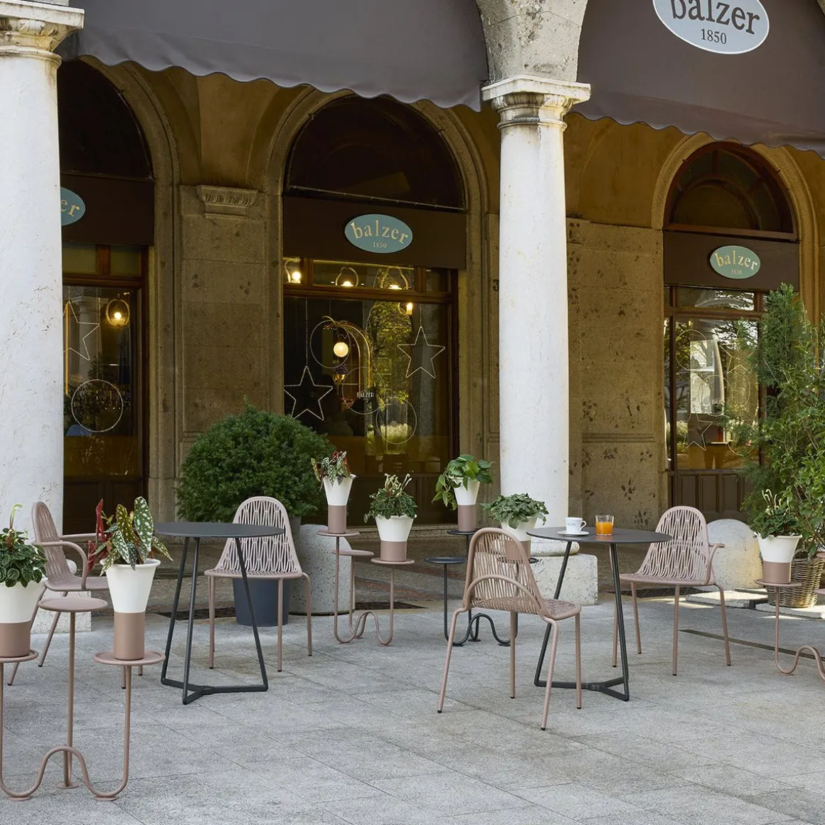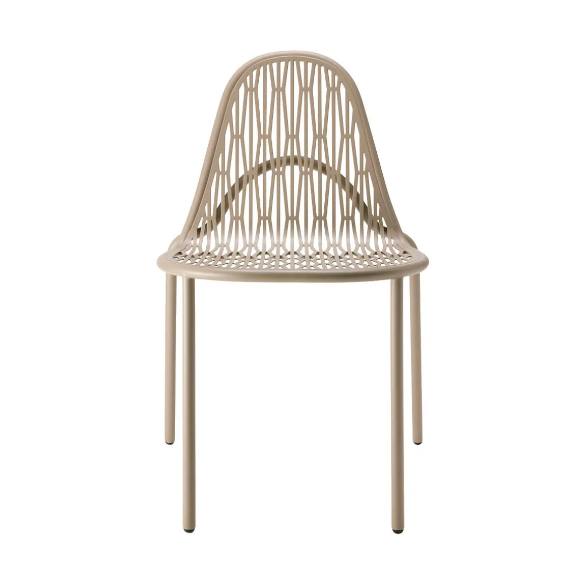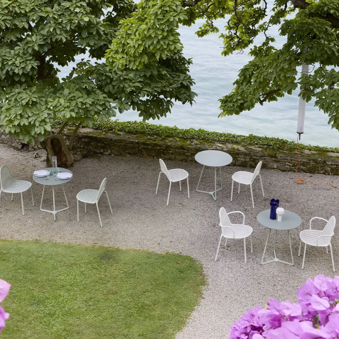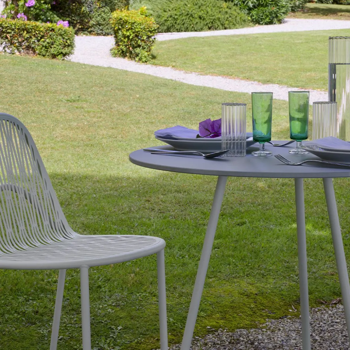 Malgré son apparente simplicité, sa conception exprime un véritable défi de production : celui d’extrapoler le dossier et l’assise à partir d’une seule pièce perforée et calandrée, puis de les souder de manière presque invisible au cadre tubulaire. Un traitement particulièrement complexe qui rapproche le métal de sa limite de flexibilité et adoucit sa froideur impénétrable. Évoquant la chaîne et la trame d’un tissu, ainsi que le jeu d’ombre d’un feuillage d’arbre, Malvasia est un siège qui se prête à l’animation de tout espace extérieur, qu’il s’agisse d’un extérieur, d’une terrasse ou d’un jardin. Les pieds, caractérisés par une double courbure, confèrent une légèreté poétique au meuble, dont le profil minimal est complété par l’ajout d’accoudoirs et de coussins moelleux.