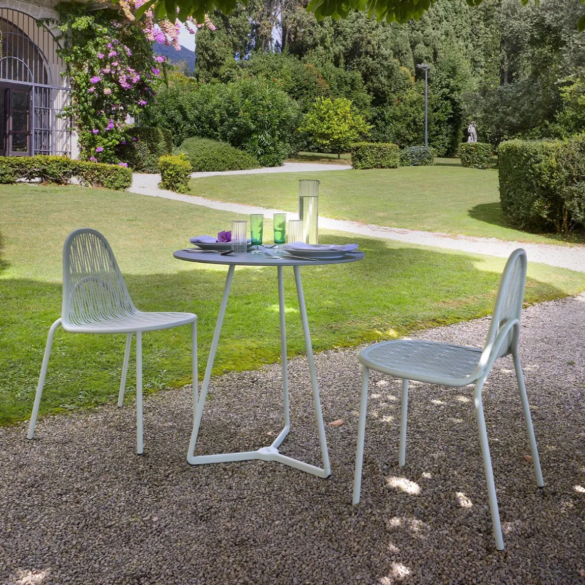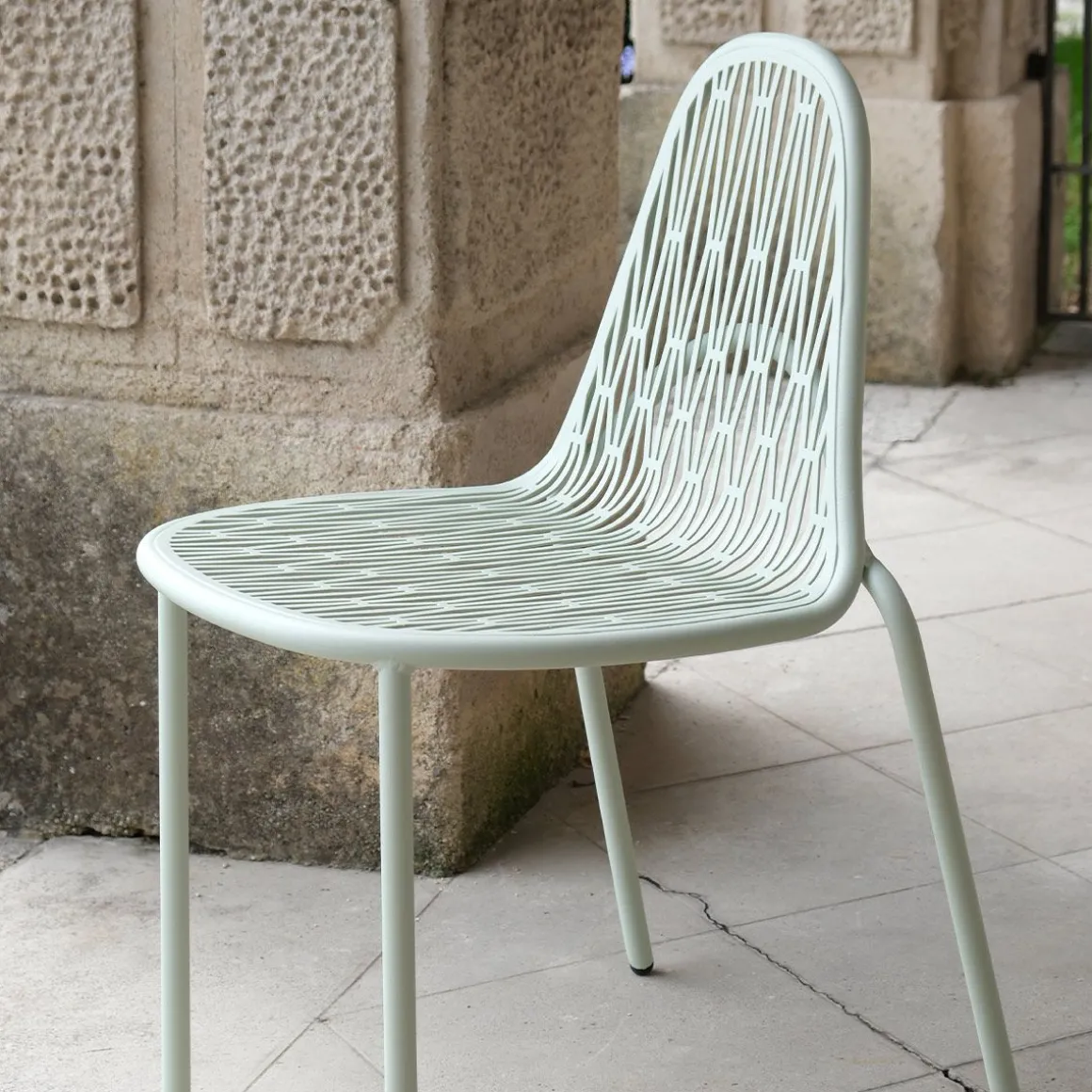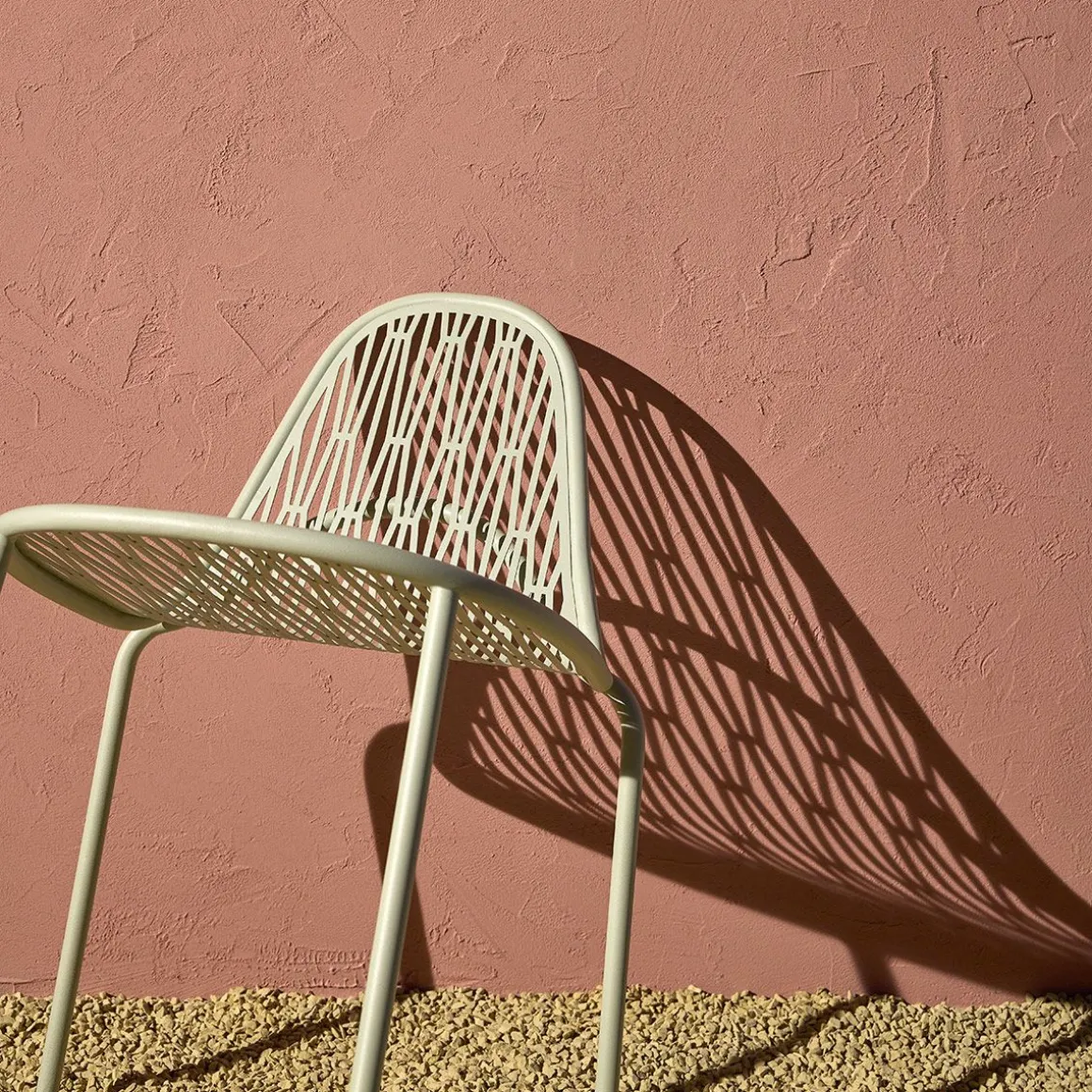 Malvasia est une chaise d’extérieur qui projette des jeux d’ombre et de lumière gracieux et rigoureux à travers son tissage métallique.