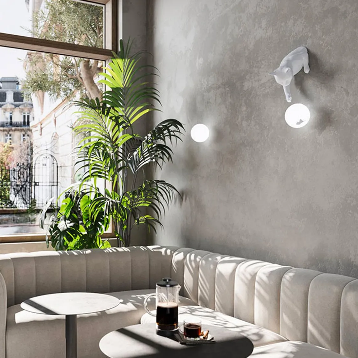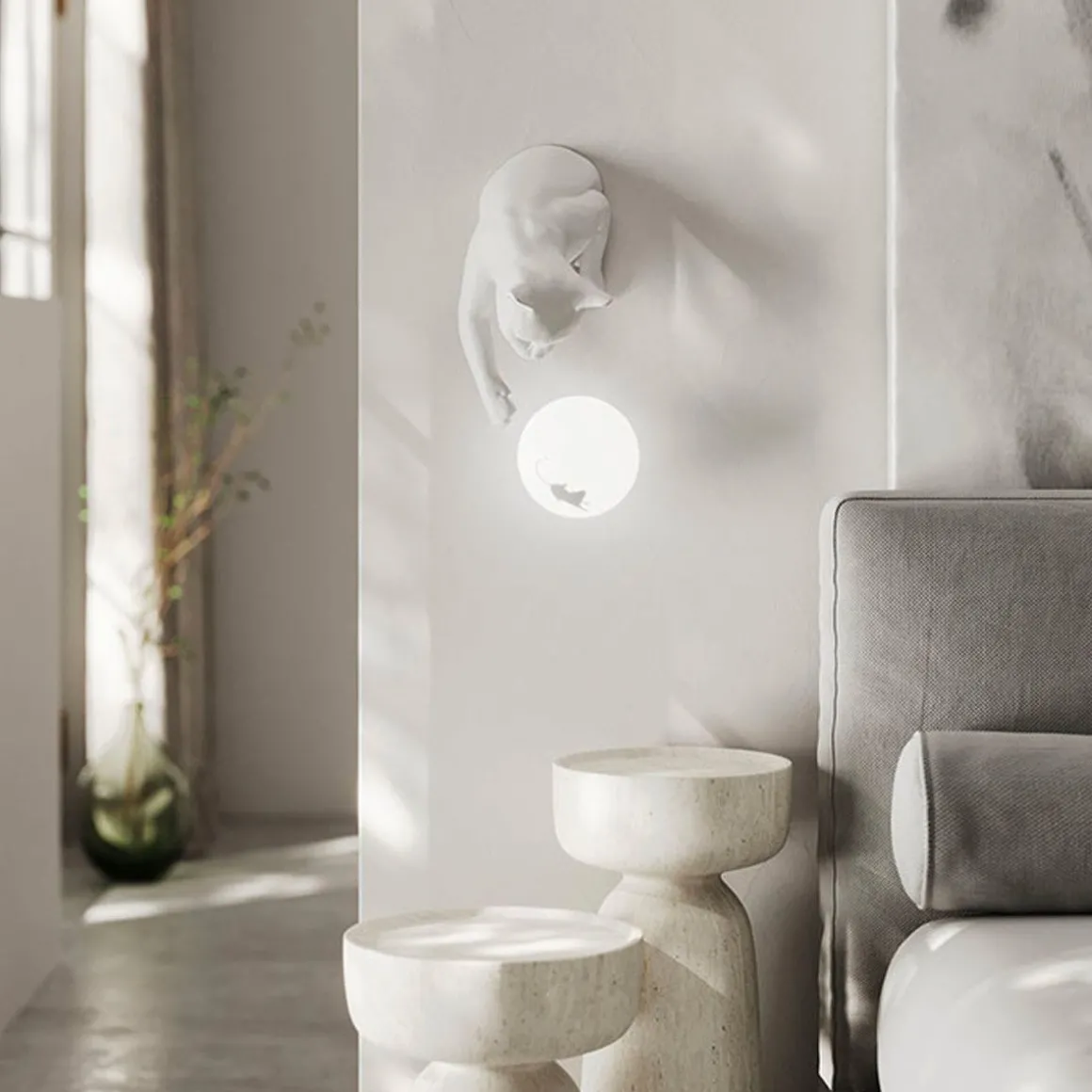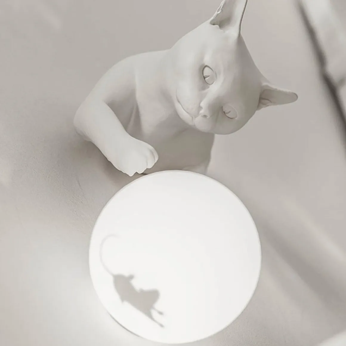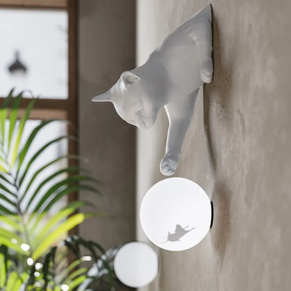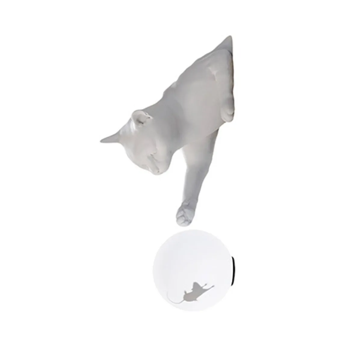 Maoo de Karman par Matteo Ugolini. Le chat semble sauter du mur ou de la table et taquiner de manière ludique la souris avec ses pattes à l’intérieur de la sphère lumineuse. Composé de deux éléments, un corps de chat en céramique blanc mat et céramique noir anthracite, une sphère en verre avec autocollant intérieur en forme de souris, MAOO peut être accroché au mur.