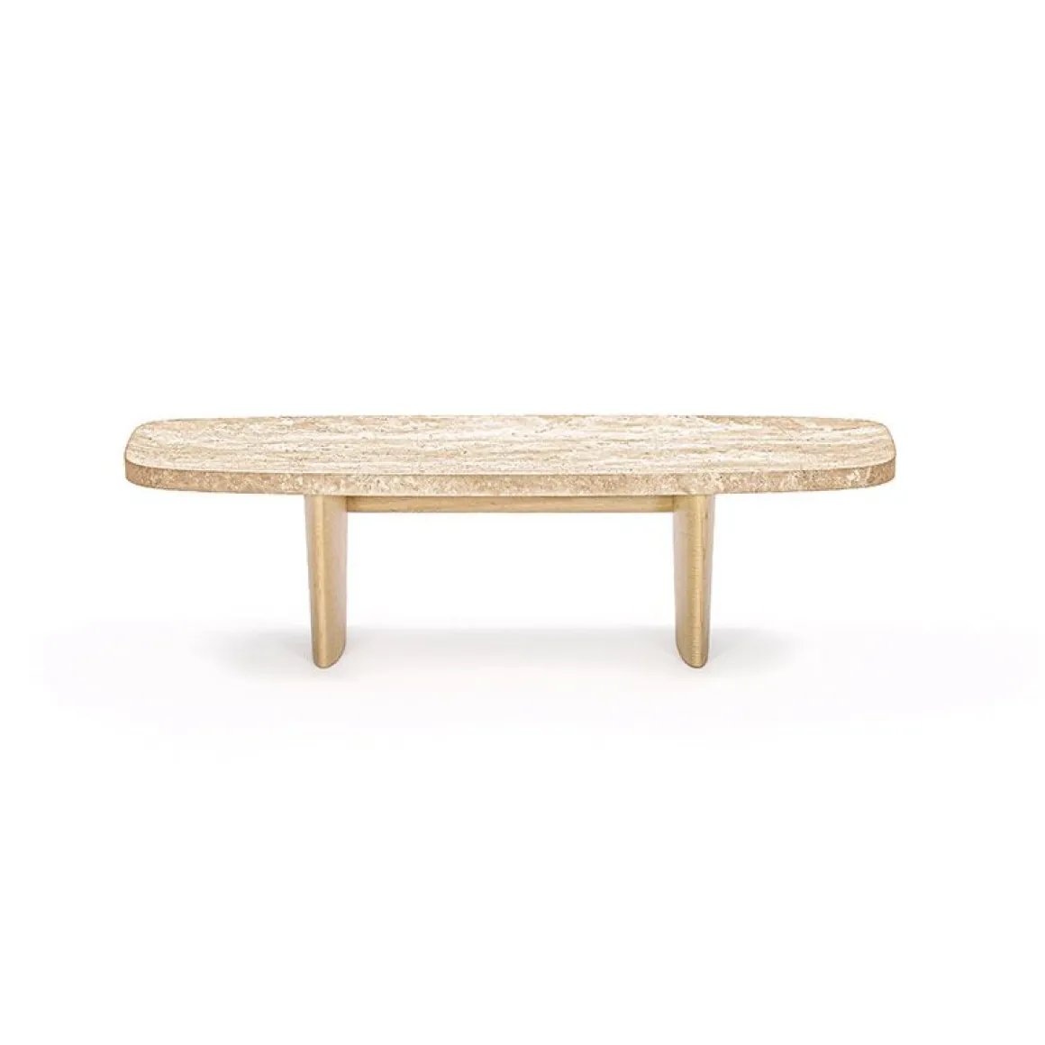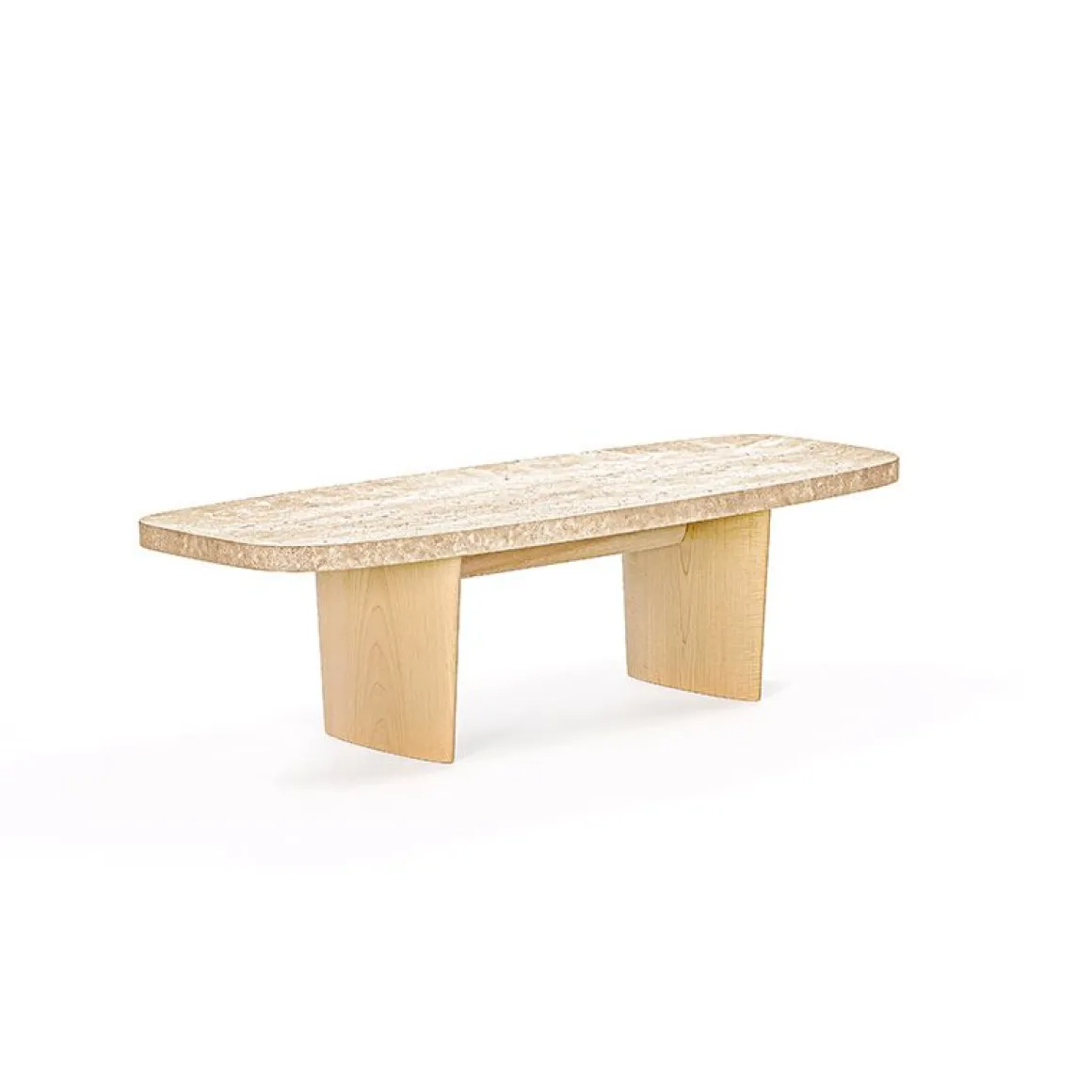 À y regarder de plus près, l’aspect presque monochrome se révèle comme un jeu de pierre de travertin à pores ouverts et de bois.
