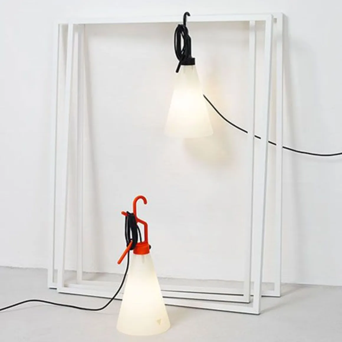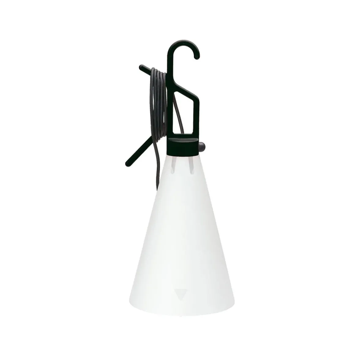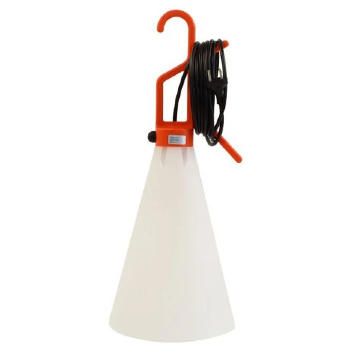 May Day est une lampe iconique et balladeuse. Elle comporte un diffuseur conique en polypropylène opalin moulé par injection, une poignée qui sert également à enrouler le câble, en polypropylène moulé par injection et un bouton interrupteur sur la poignée recouvert d’élastomère moulé par injection.