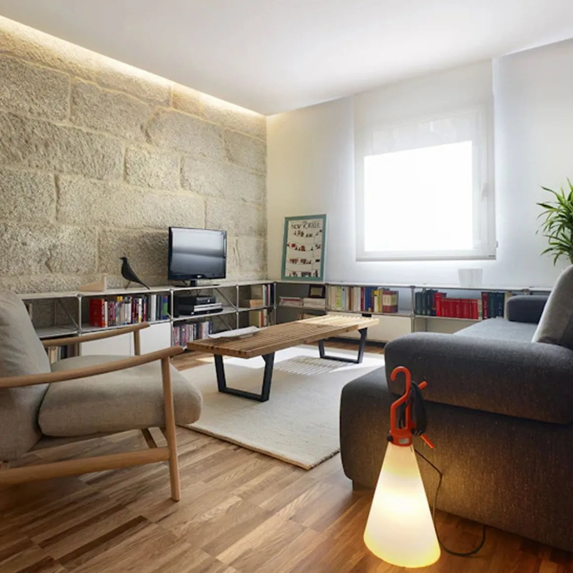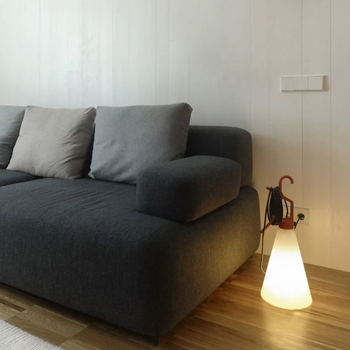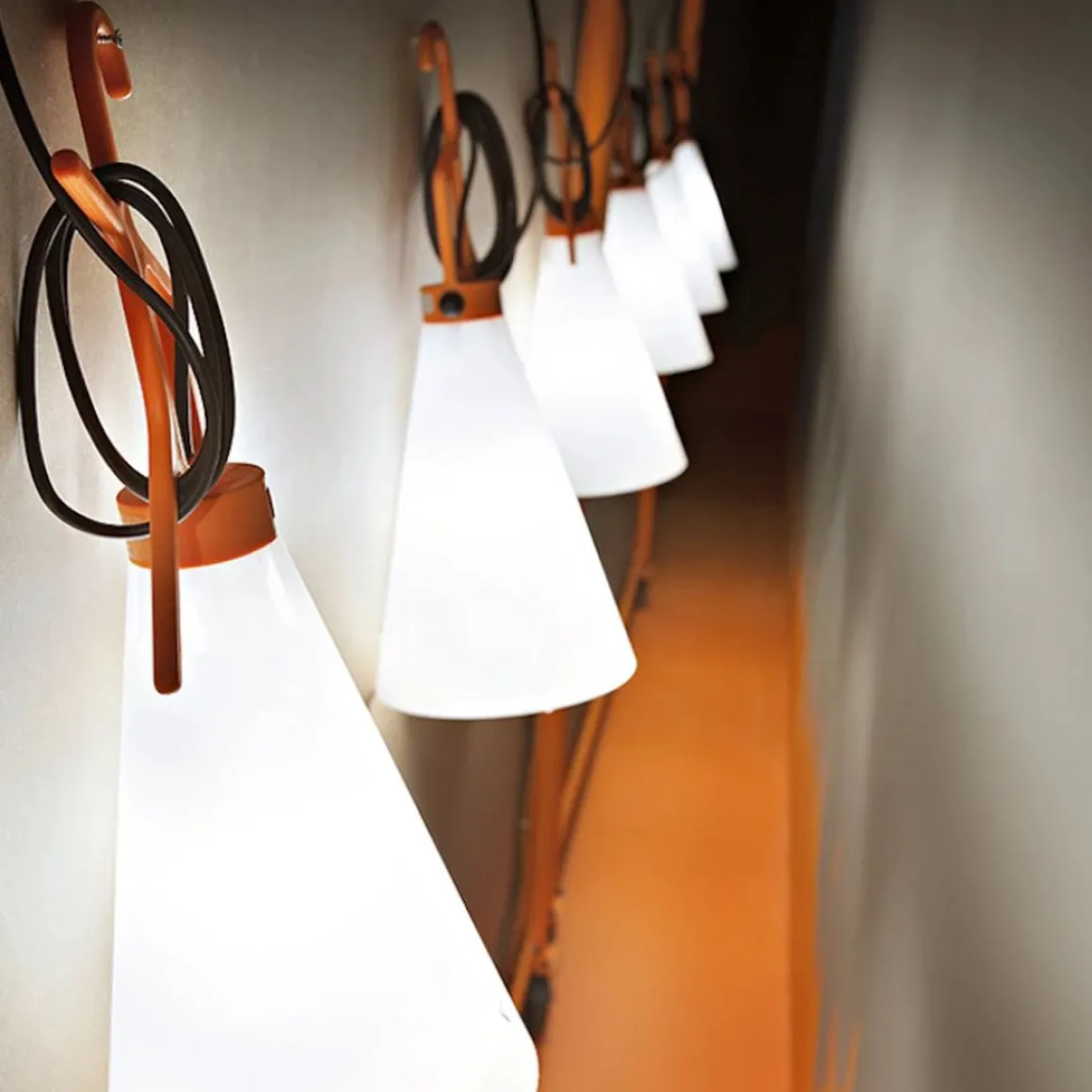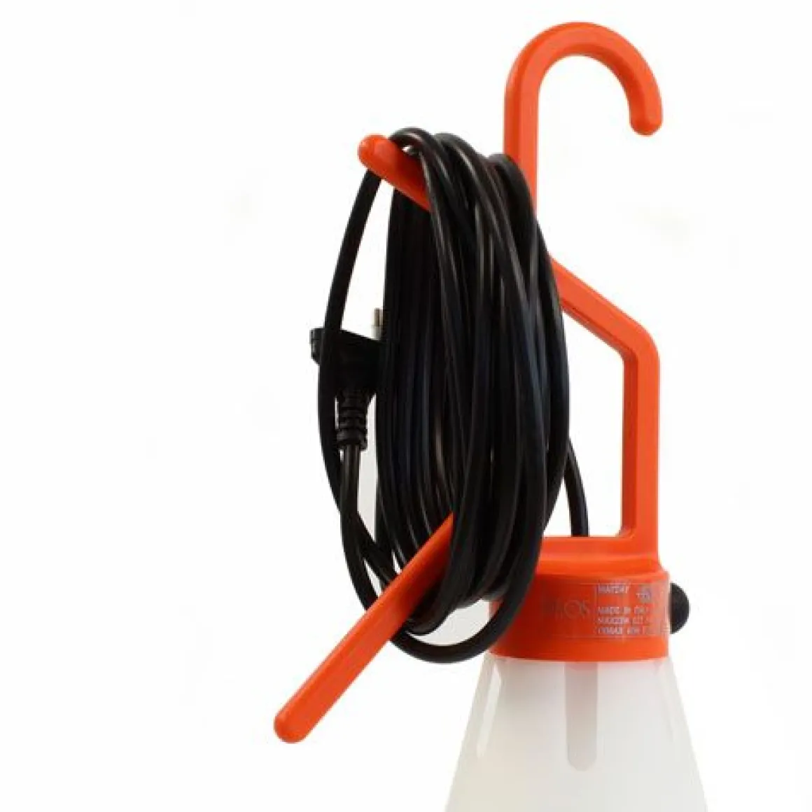 May Day est une lampe iconique et balladeuse. Elle comporte un diffuseur conique en polypropylène opalin moulé par injection, une poignée qui sert également à enrouler le câble, en polypropylène moulé par injection et un bouton interrupteur sur la poignée recouvert d’élastomère moulé par injection.