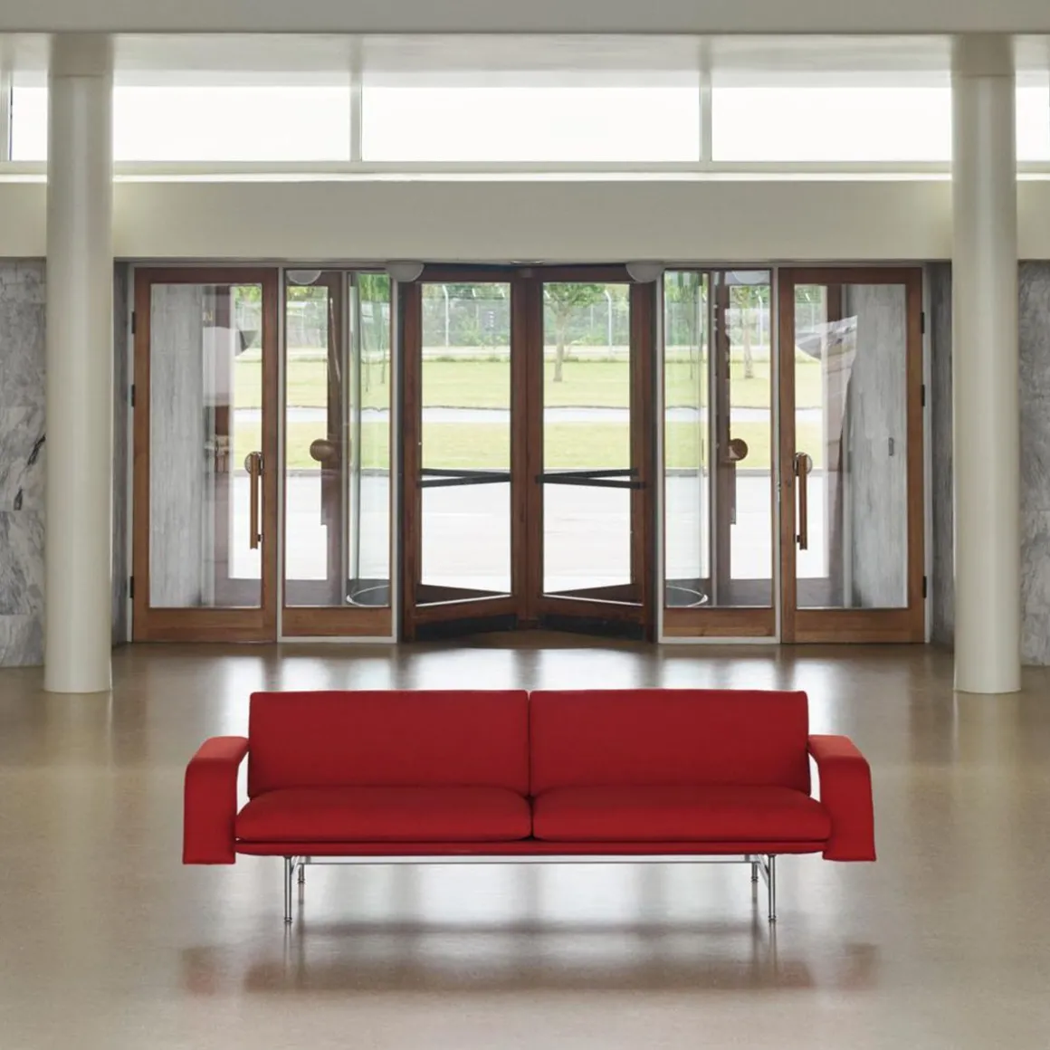 Le canapé Meantime d’Anderssen & Voll allie une silhouette distinguée à un confort chaleureux. Doté de larges accoudoirs élancés mais fins, la forme de Meantime rappelle les meubles que l’on trouve dans les espaces liminaires des salles d’attente des transports. Grâce à des proportions soigneusement étudiées, une sensation d’apesanteur optique est obtenue, ce qui donne un design qui équilibre l’impact visuel avec un siège offrant un bon maintien.