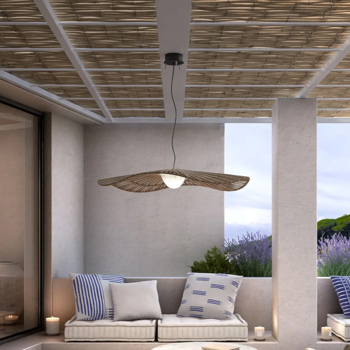 La lampe Mediterrània est une ode à la lumière, à la brise et à l’odeur méditerranéennes. Une onde douce qui rend hommage à notre lumière méditerranéenne, si hétérogène tout au long de la journée, cette lumière qui associe toujours des éclats lumineux à des faisceaux très chauds, notamment au lever et au coucher du soleil. Dans cette version extérieure, nous remplaçons l’abat-jour ruban par la fibre synthétique pour lui donner une plus grande résistance et présence dans les environnements extérieurs.