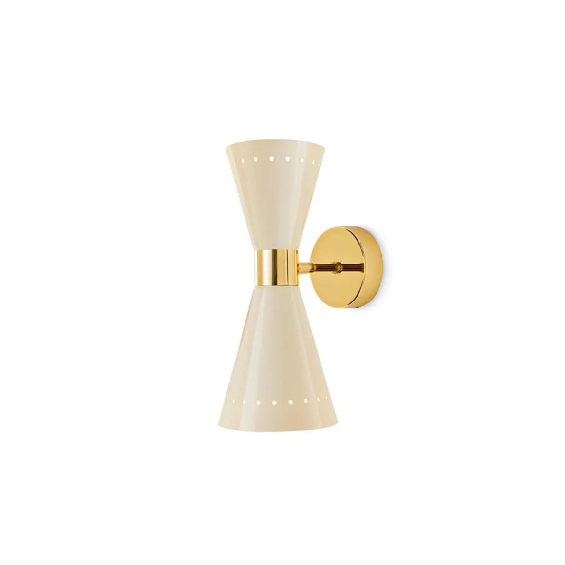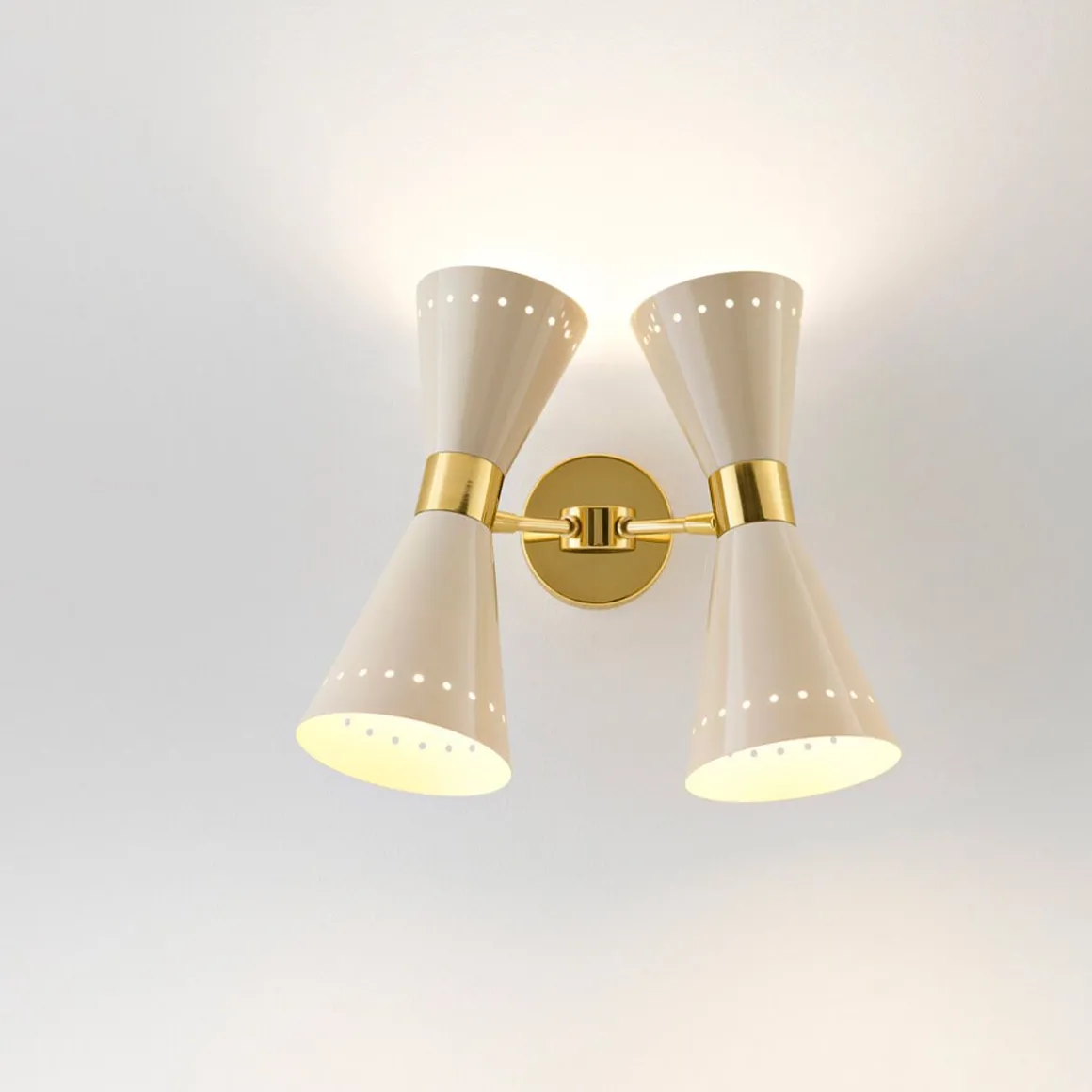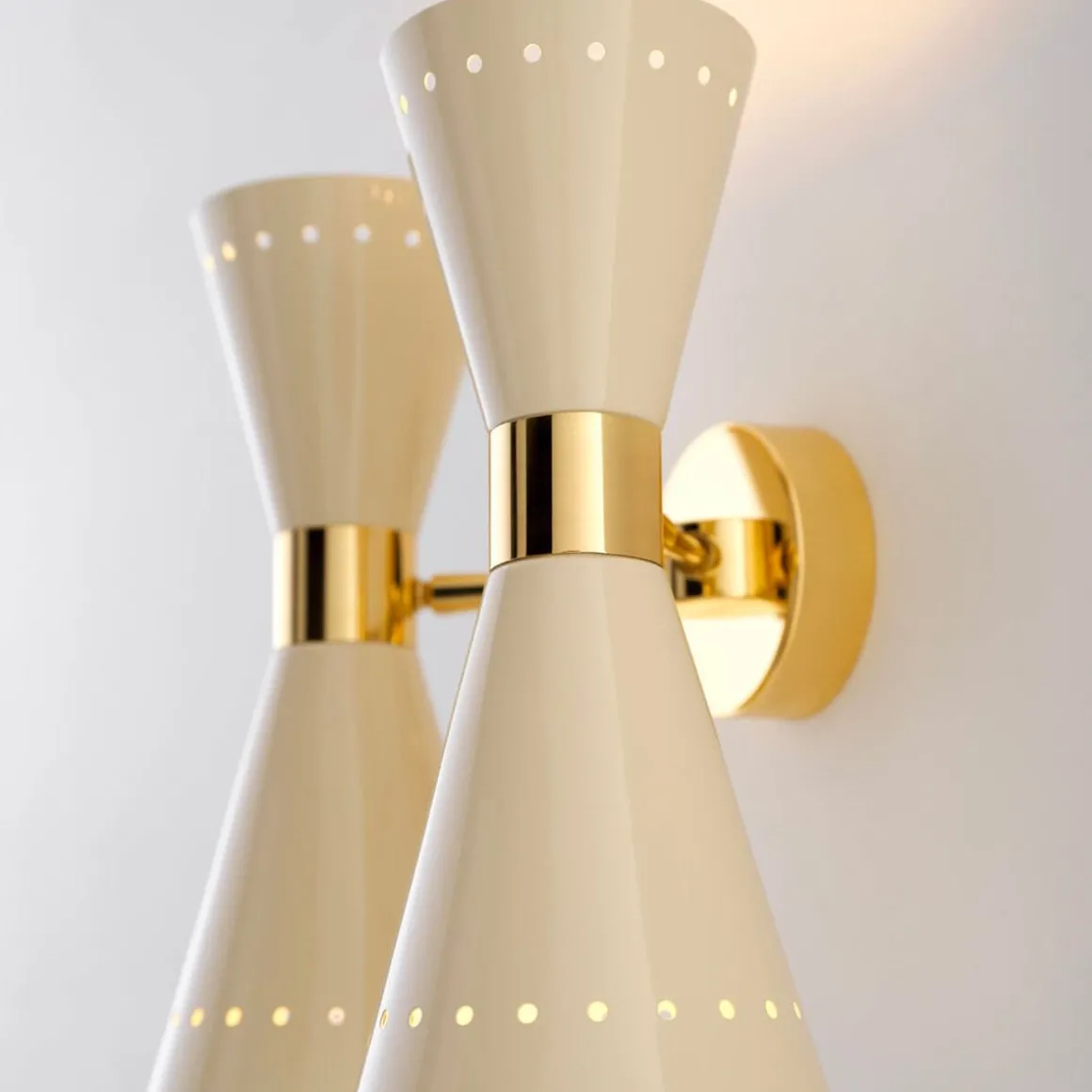 Megafono est une lampe emblématique des années 1950 avec une lumière directe et indirecte. Elle associe une précieuse structure en laiton avec dorure galvanique les abat-jour coniques en finition ivoire ou noir brillant, éclairant la pièce avec élégance.