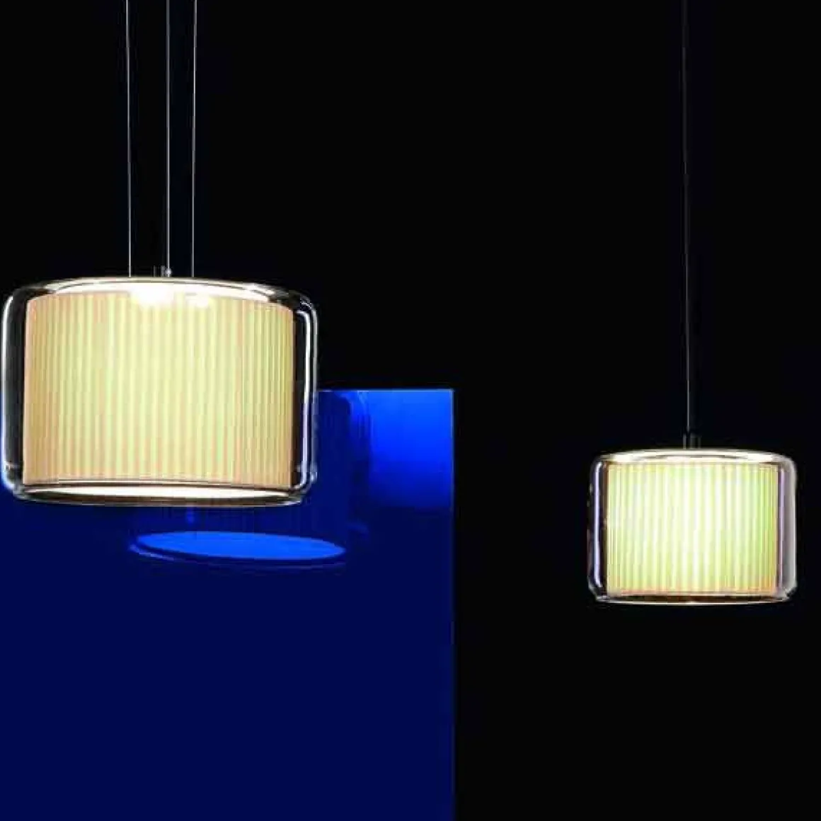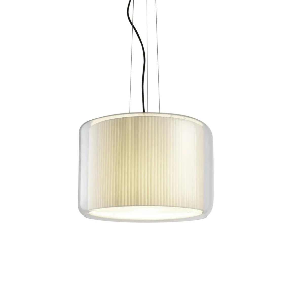 Matériaux : Nuance textile qui flotte à l’intérieur d’une structure en verre soufflé transparent. Disque diffuseur opale sur la partie inférieure de la version 44.