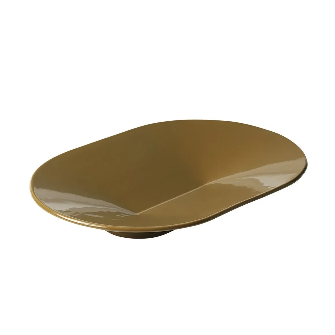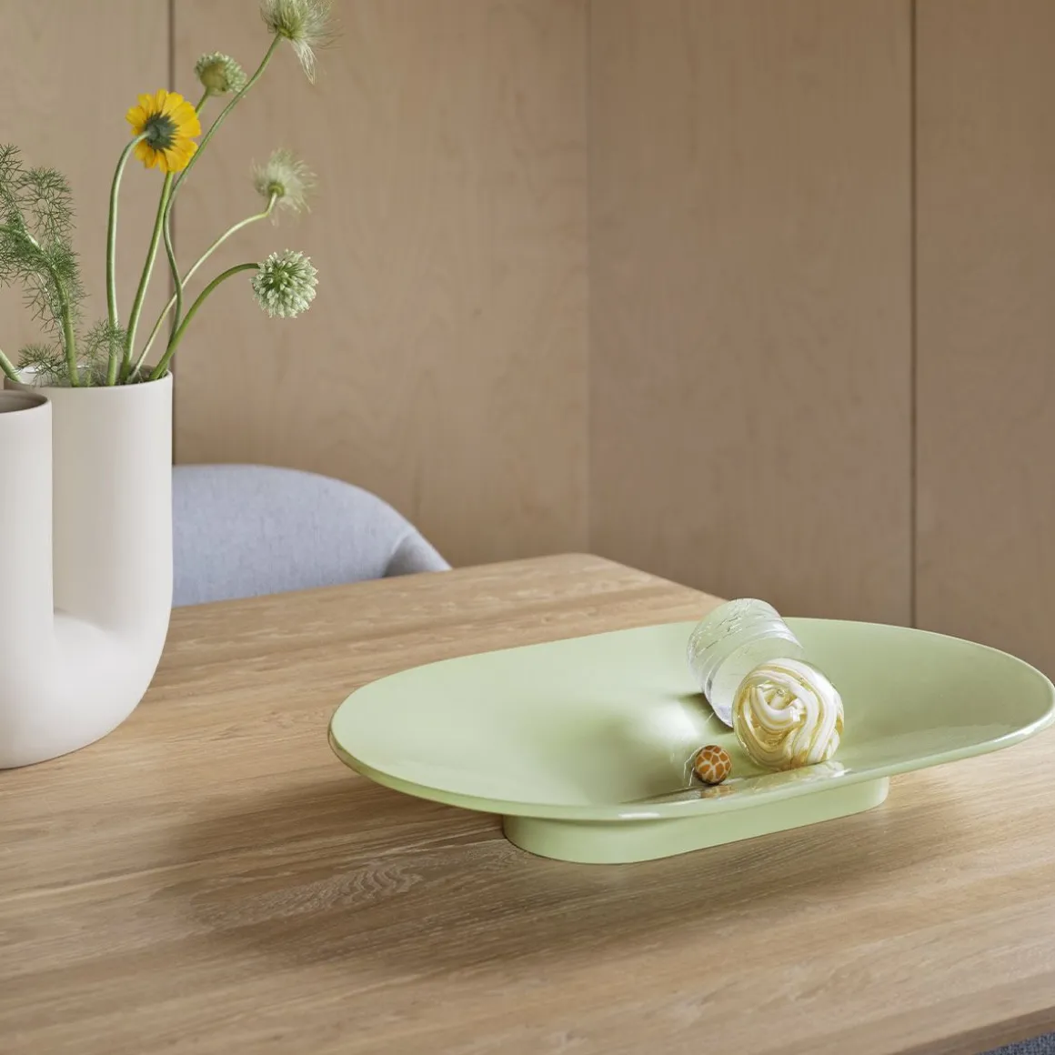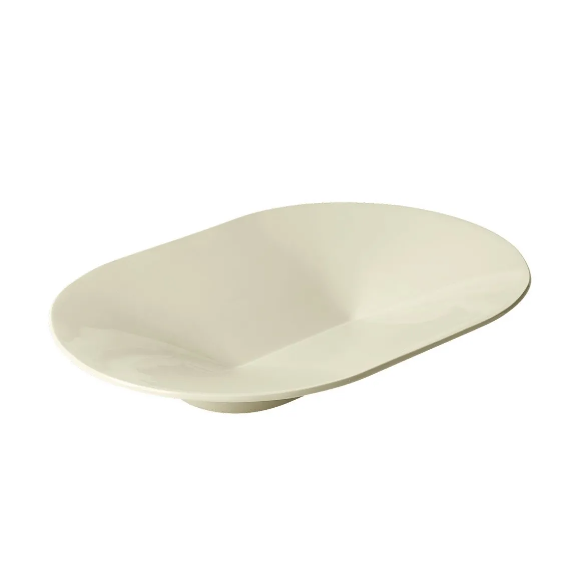 Le Mere Bowl est une pièce maîtresse sculpturale, qui est magnifique dans une table ou un espace, qu’il soit utilisé ou non. Sa forme caractéristique est simple mais ingénieuse, puisqu’une ligne en son milieu se déplie sur les côtés pour former un bol. Surélevée par un pied discret, elle semble flotter. Fabriqué en grès céramique tactile, il a été recouvert d’un vernis brillant qui rehausse les ombres qui se forment le long du pli de Mere Bowl. Ce traitement de surface rend le bol sans danger pour les aliments.