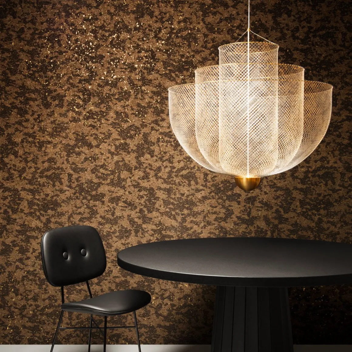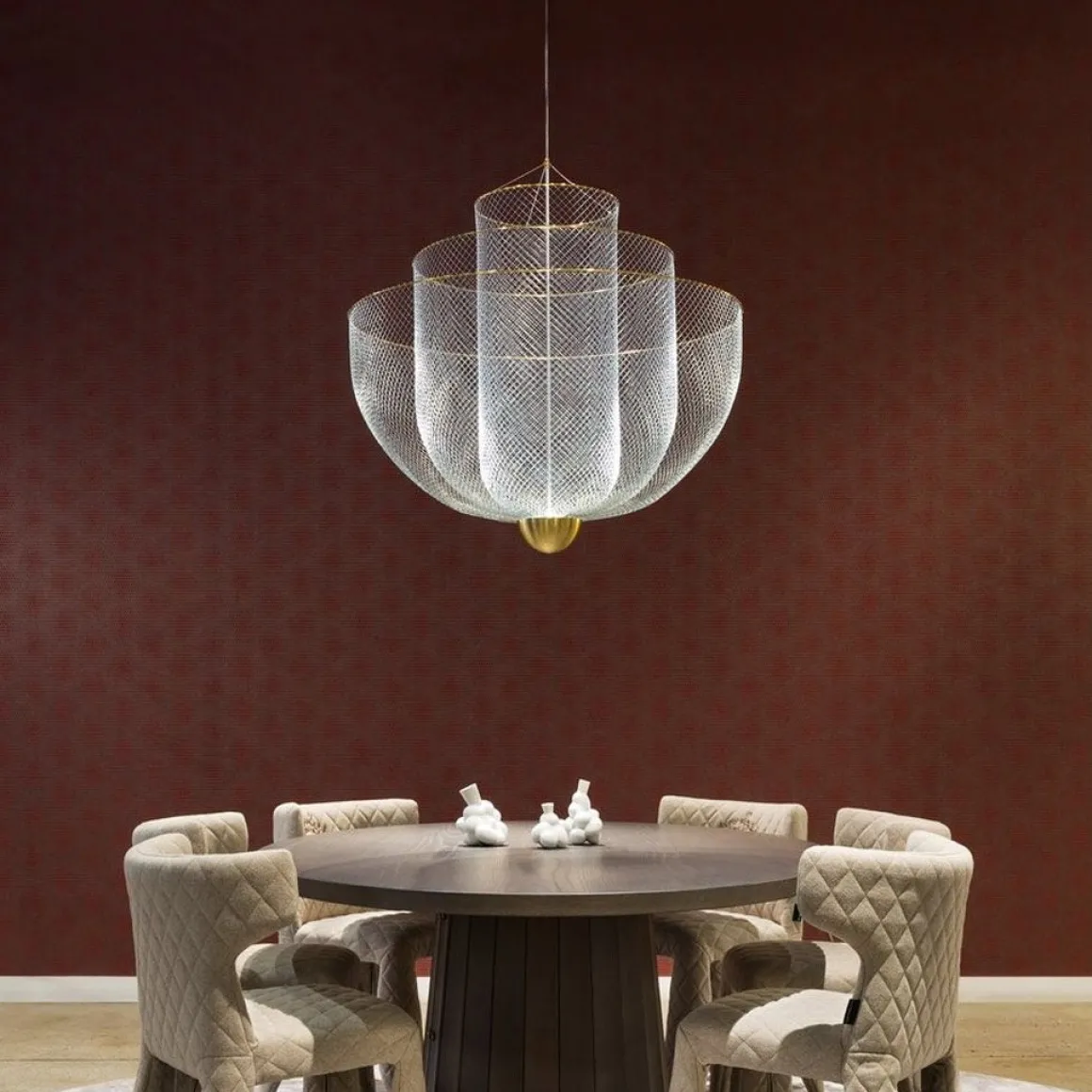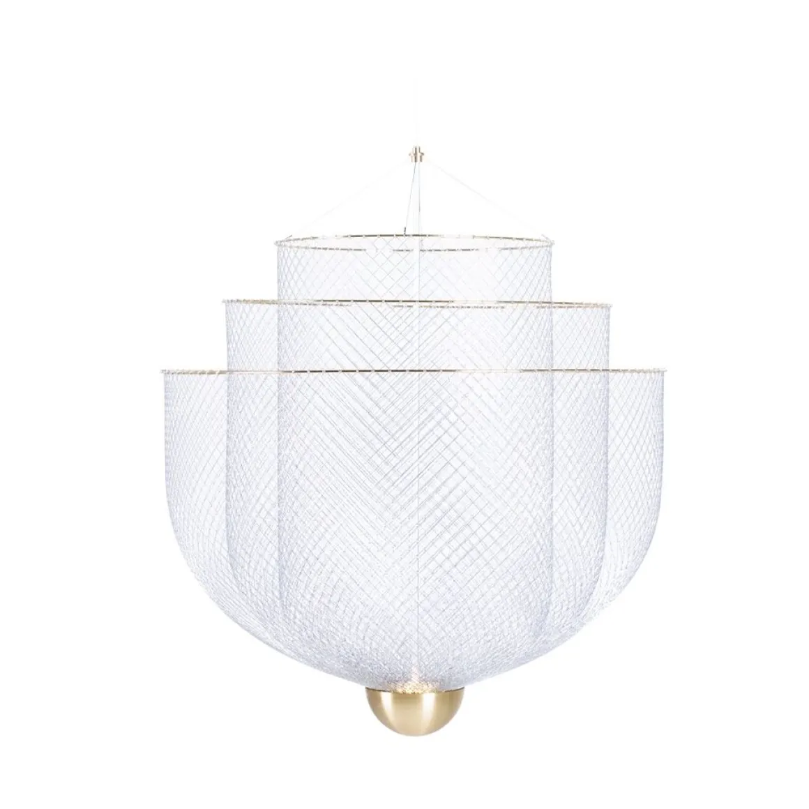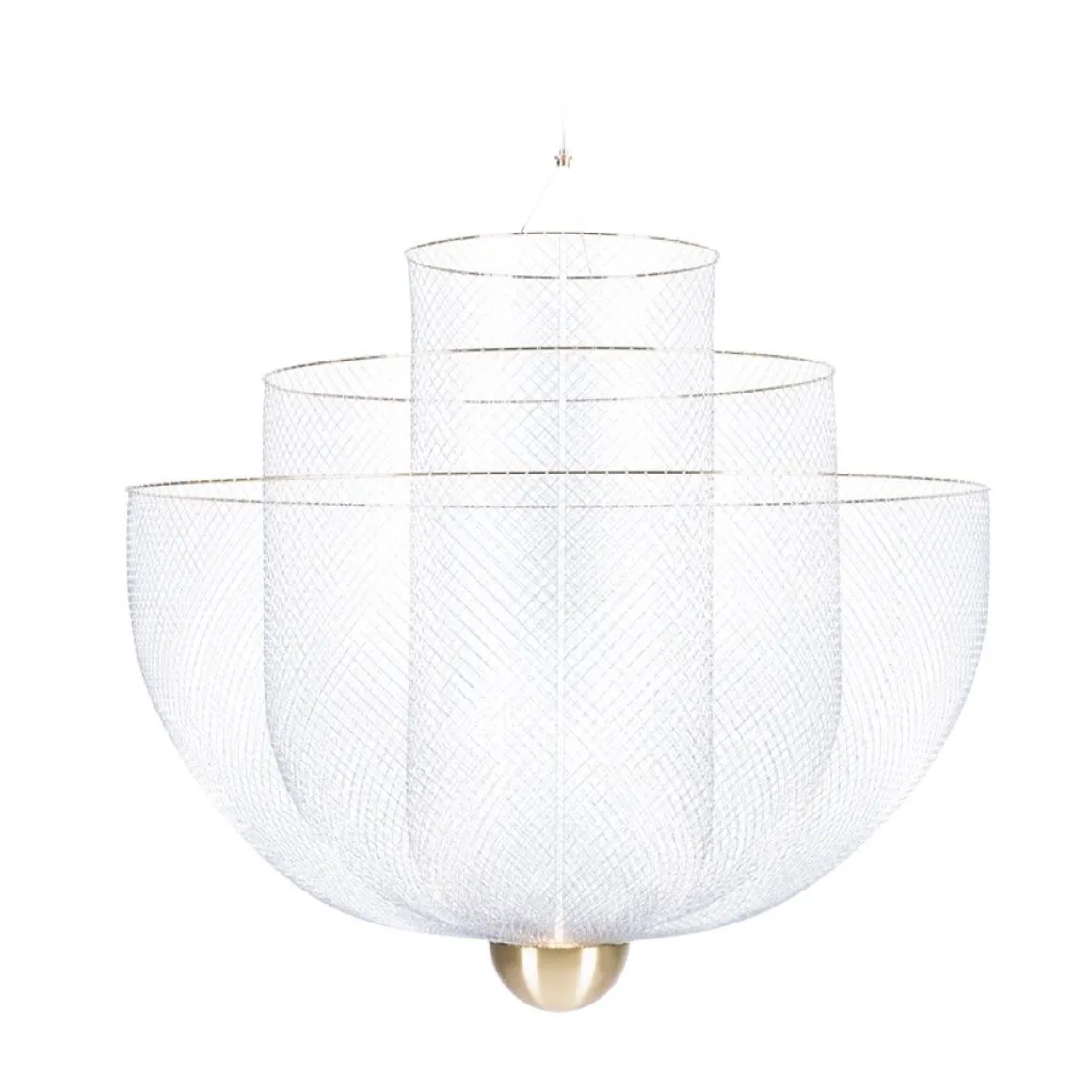 Celui qui jette son regard sur le lustre Meshmatics ne devinera jamais ce qui se cache derrière son extérieur sophistiqué … Inspiré, Rick Tegelaar relève la nature de la matière de l’humble grillage développé à l’aide de machines et d’un ensemble d’outils pour modéliser avec précision. Toute le potentiel de ce matériau flexible, réside dans la façon de l’étirer et le modéliser en trois couches élégantes. L’intelligence de la structure de treillis métallique reflète et diffuse la lumière de la LED intégrée avec une grâce poétique, pour contribuer à maintenir la source lumineuse fraîche en absorbant une partie de sa chaleur.