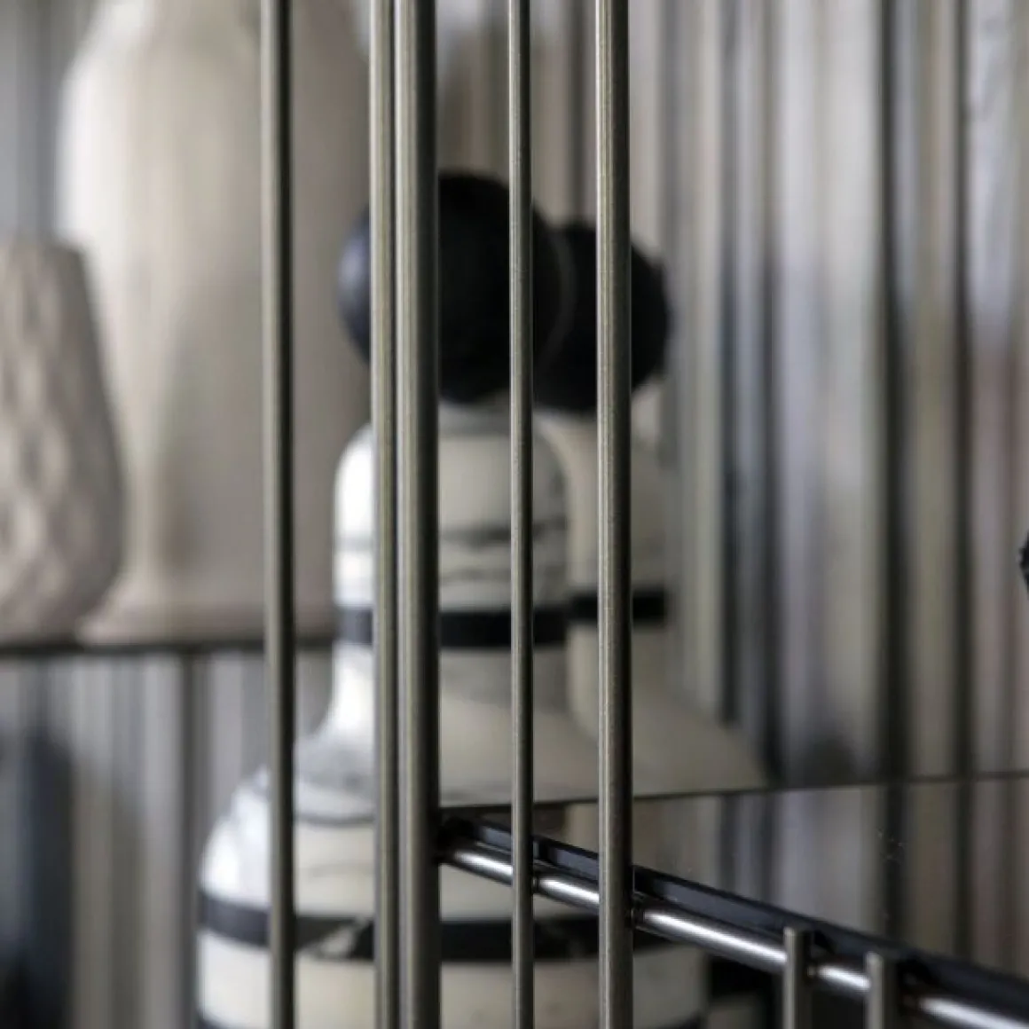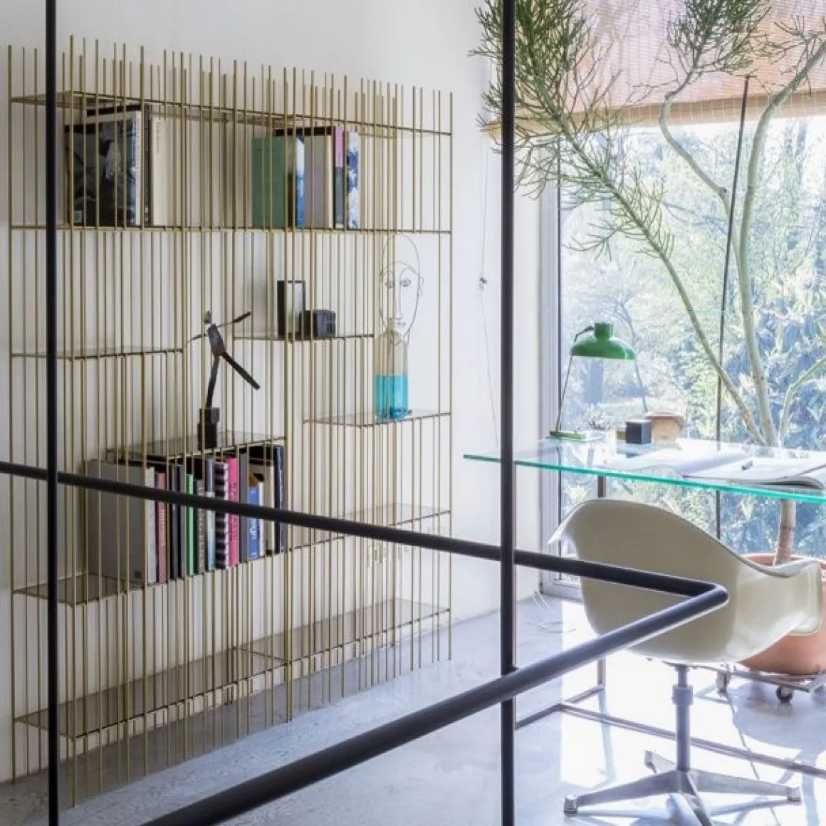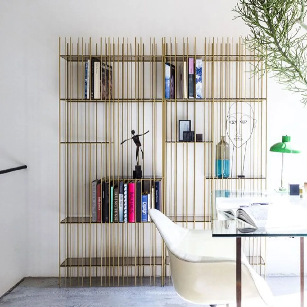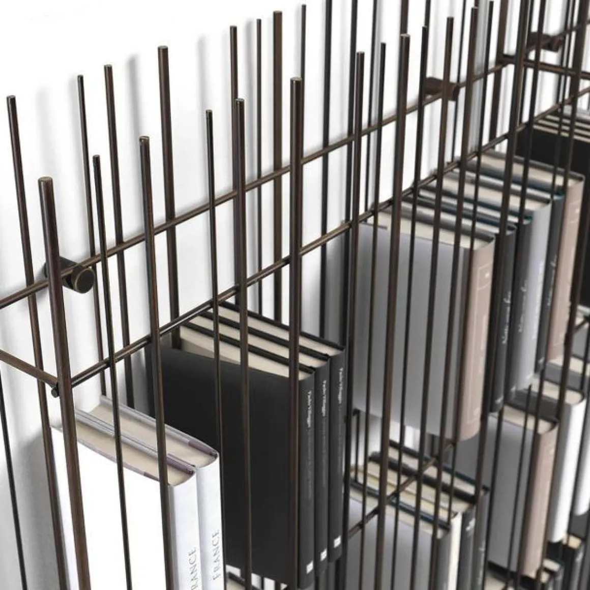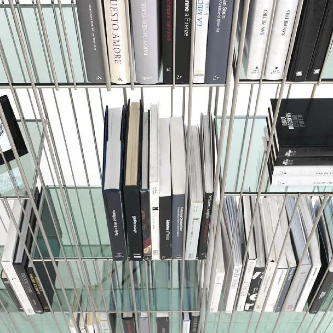Metrica est une bibliothèque en métal disponible dans les finitions titane, bruni et or avec des étagères en cristal transparent. La structure est simple, le rythme est marqué par les tiges de fer fixées à différents intervalles sur une structure ouvertement rigoureuse à l’intérieur de laquelle les livres et objets insérés complètent la forme en écrivant de temps en temps de nouvelles compositions.
