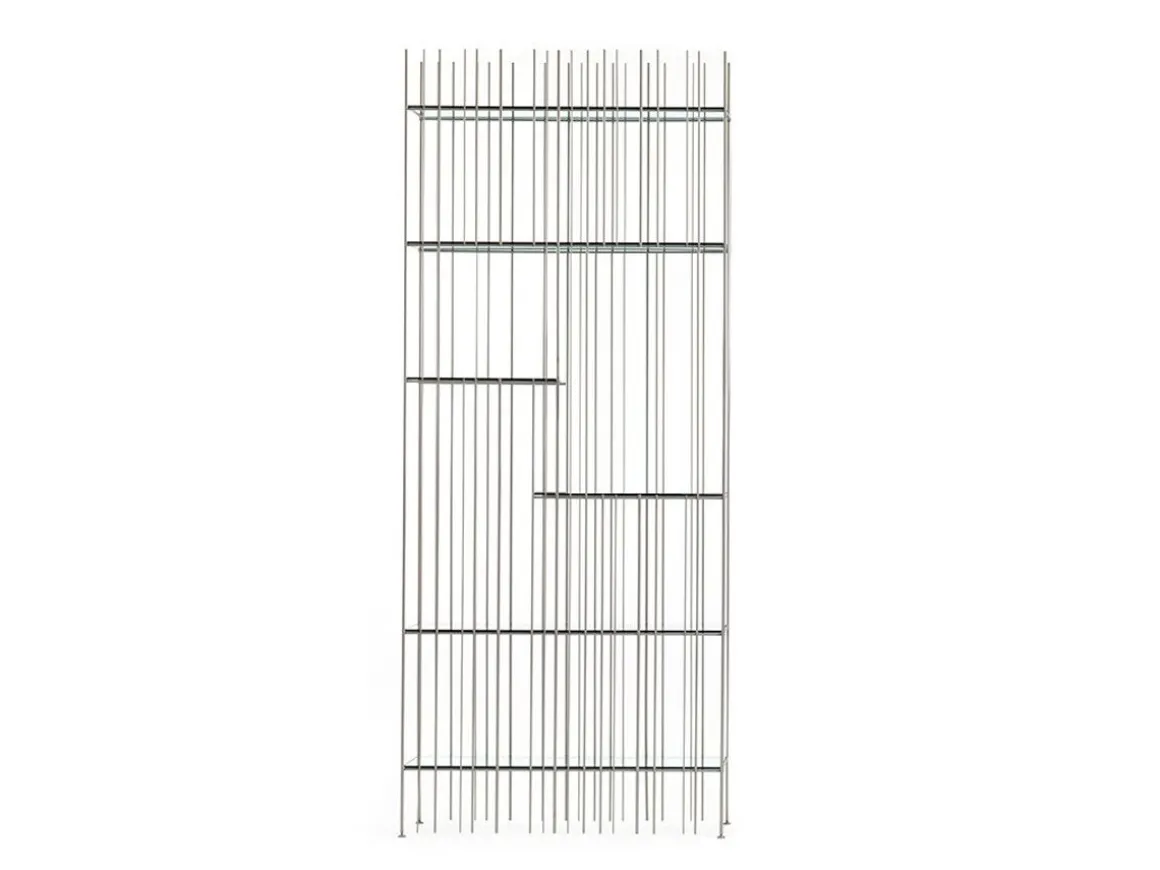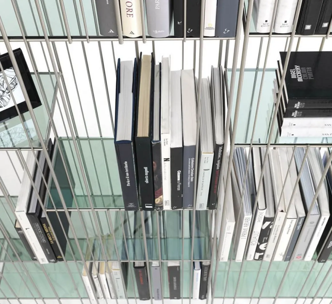 Metrica est une bibliothèque murale en métal avec des étagères en verre, conçue par CtrlZak pour la marque Mogg. Elle est faite de tiges d’acier avec finition titane ou bronze ainsi que d’étagères (deux finitions verre vert ou verre brun) dans un cristal transparent. La structure simple exploite le traitement industriel de la barre ronde dans différents diamètres et selon une cloison irrégulière.