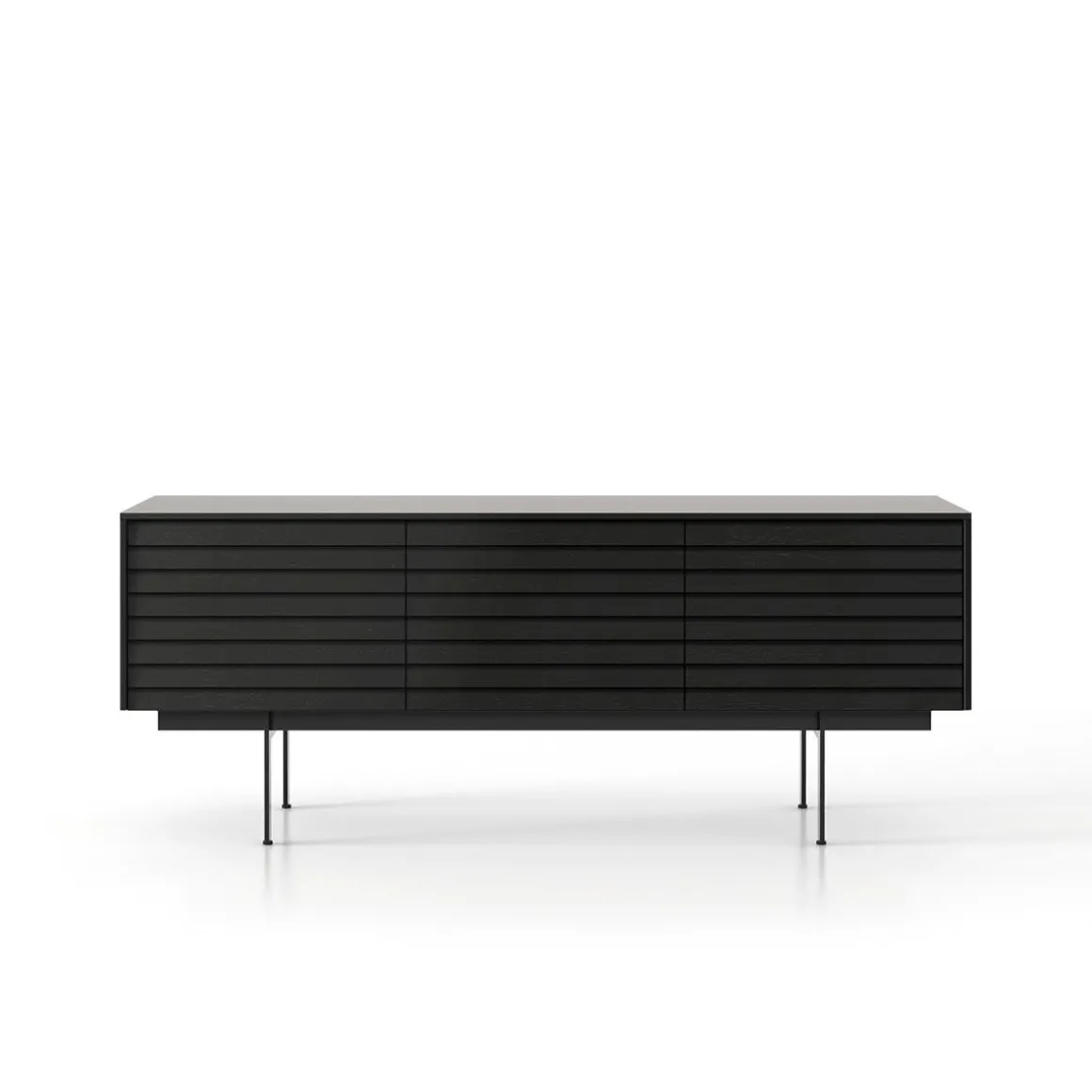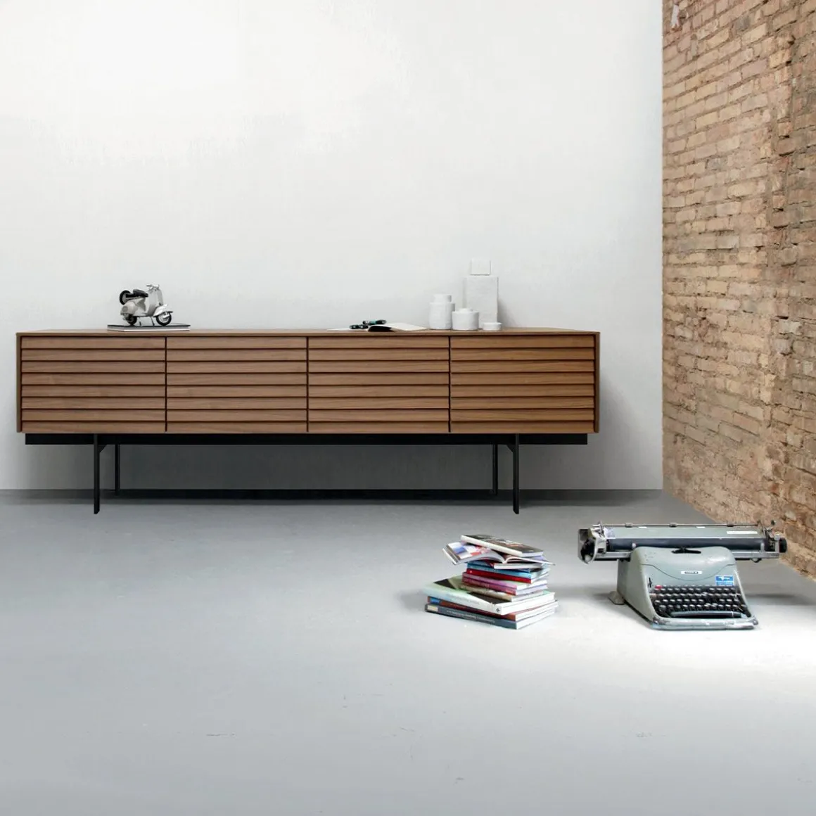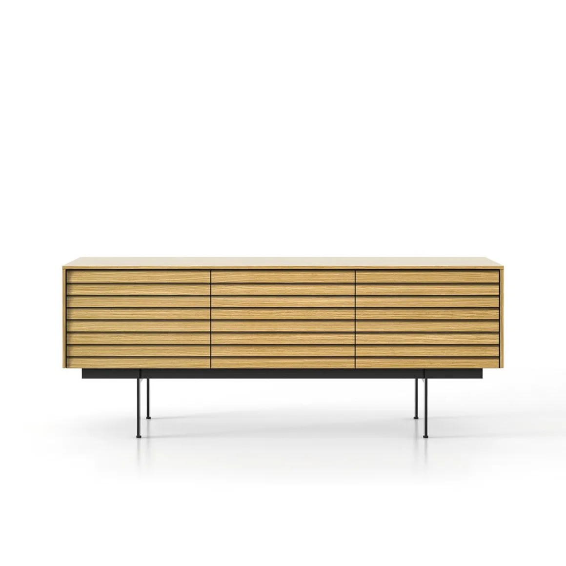 Collection de commodes et meubles de télévision au design original, avec des lames en partie frontale qui masquent les divisions et servent à la fois de poignées aux portes et tiroirs. Les éléments de porte incluent des étagères réglables en hauteur.