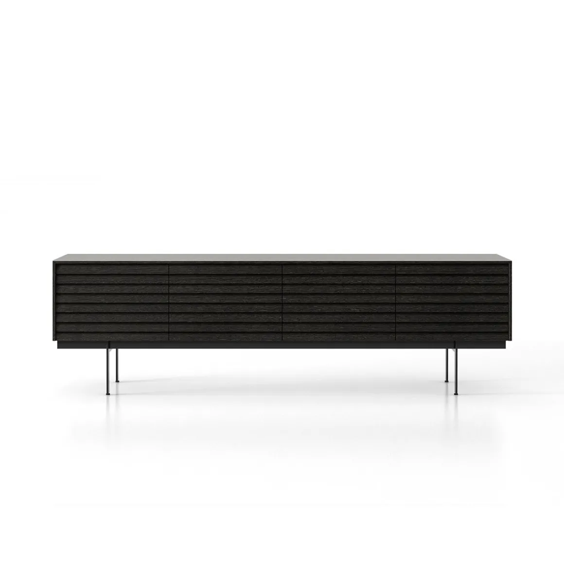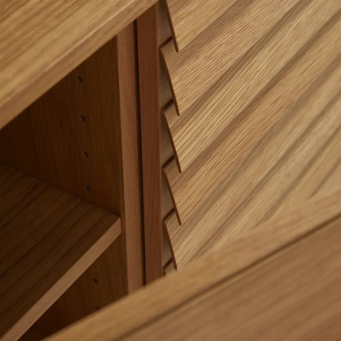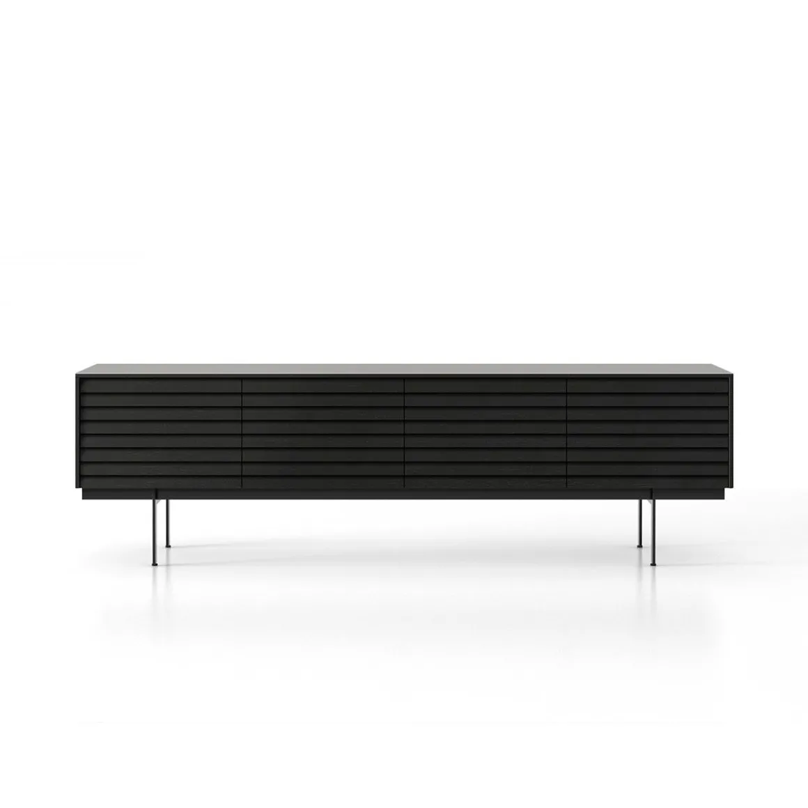 Collection de commodes et meubles de télévision au design original, avec des lames en partie frontale qui masquent les divisions et servent à la fois de poignées aux portes et tiroirs. Les éléments de porte incluent des étagères réglables en hauteur.