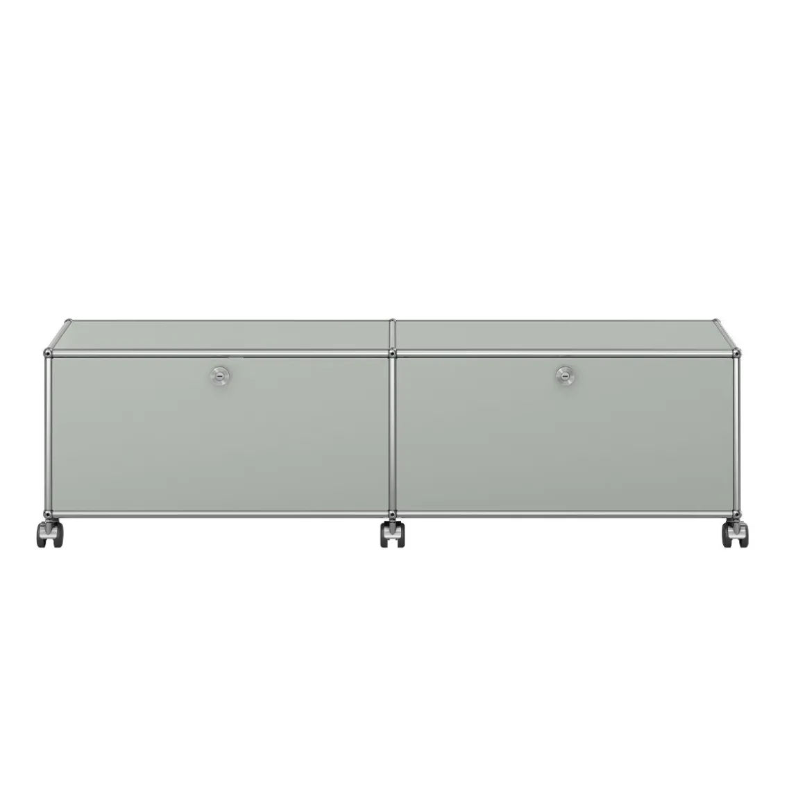 Meuble bas composé de 2 modules équipés de portes abattantes (poignées sans serrure), 1 rayon intermédiaire et 1 découpe passe-câbles.