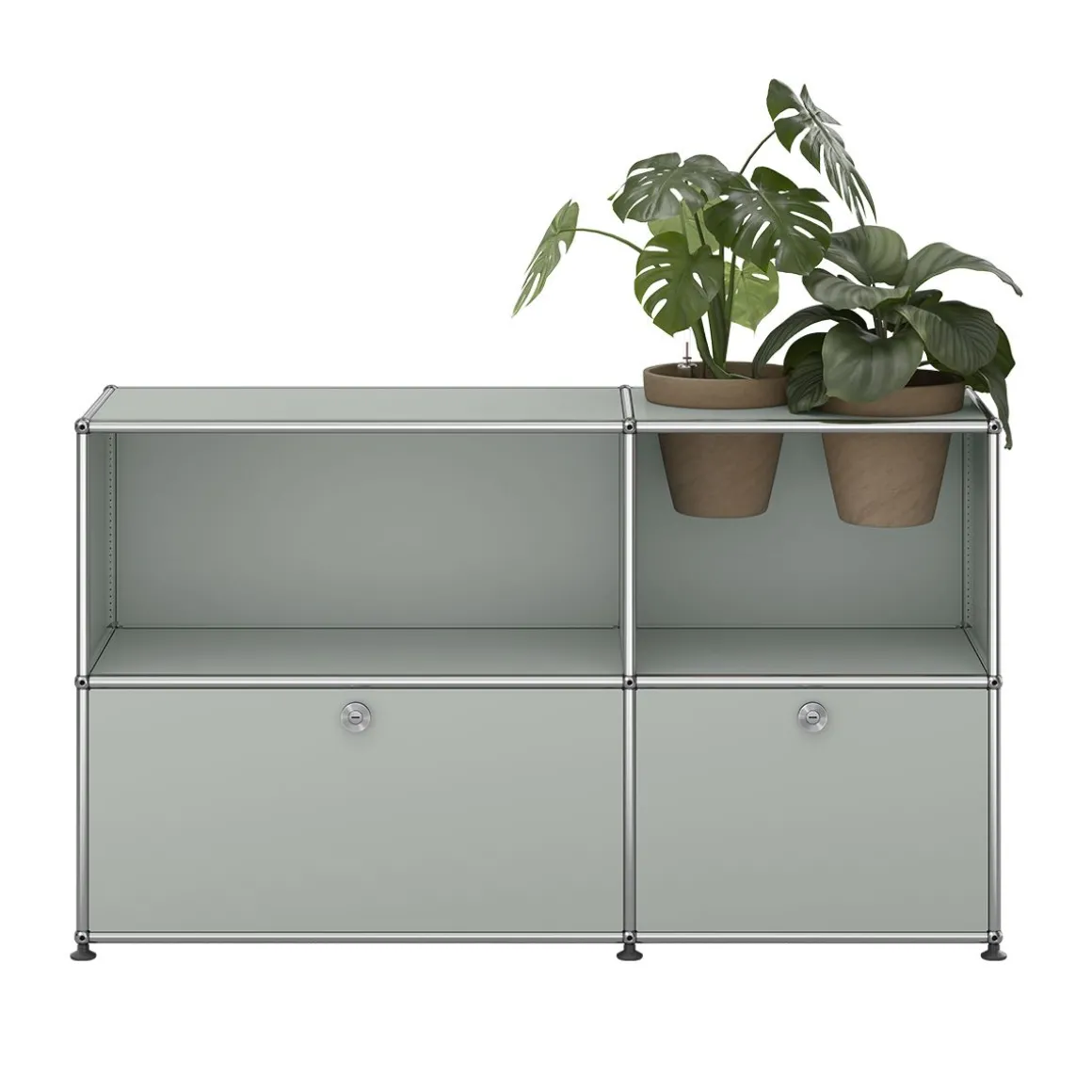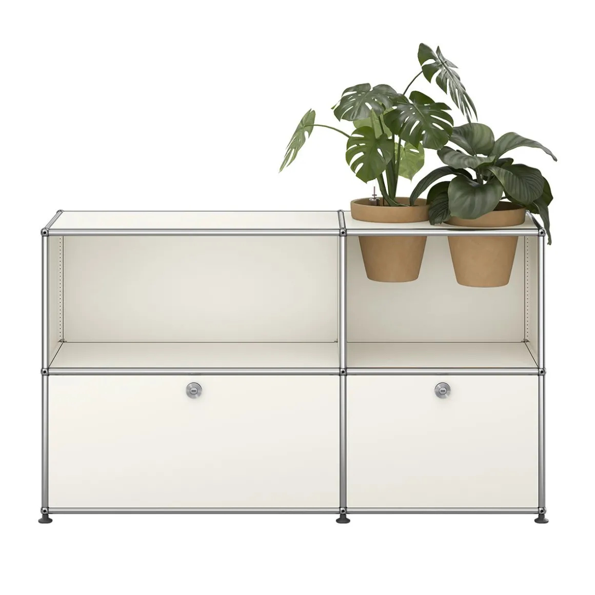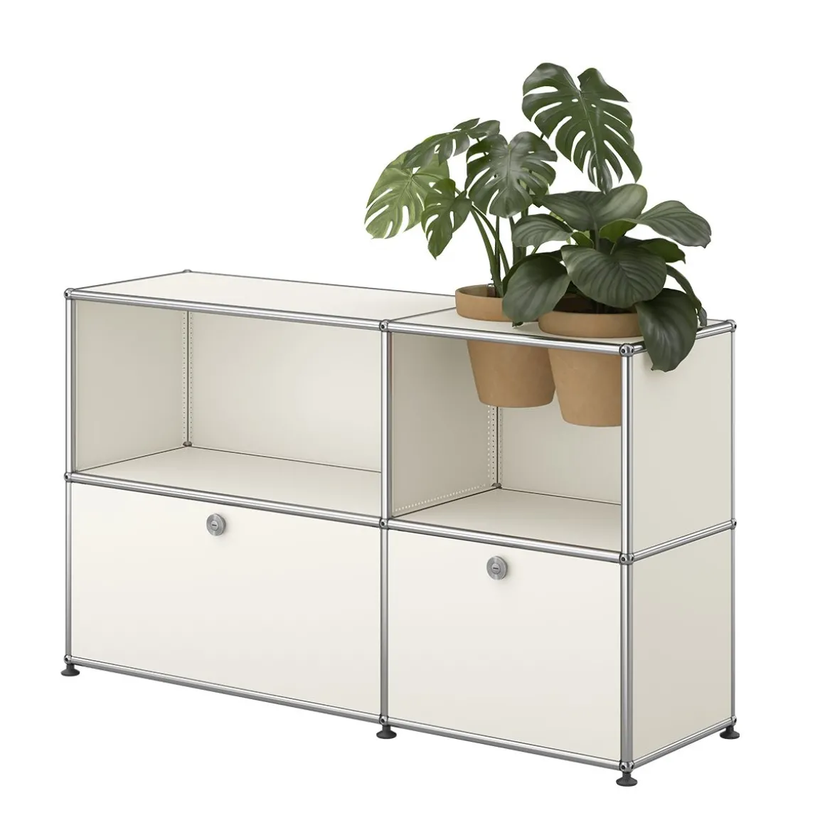 Bien plus qu’un système de rangement, ce meuble USM Haller est un classique du design qui intègre des accessoires pour plantes vous permettant de créer une oasis de verdure chez vous. Ce meuble de rangement USM Haller est fourni avec 2 pots* pour vos plantes d’intérieur, ainsi qu’un kit d’arrosage par pot. Le kit garantit un arrosage régulier de vos plantes. Les plantes et le substrat ne sont pas fournis. Avec deux portes abattantes.