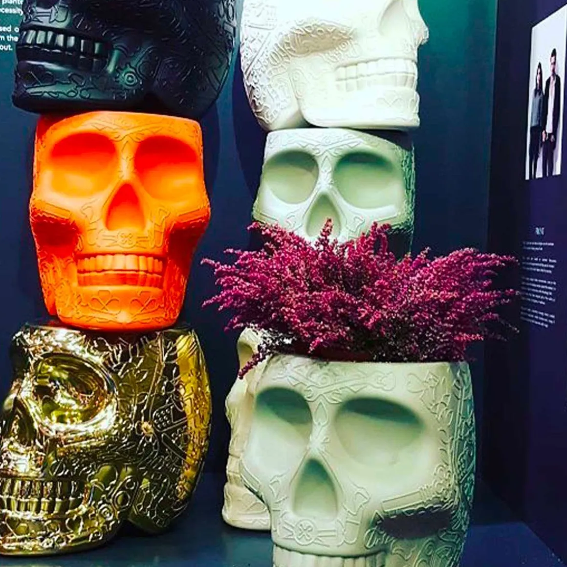 Mexico planter and champagne cooler de Qeeboo par Studio Job. Mexico, conçu par Studio Job, est un objet design en forme de crâne avec un motif graphique en surface, fonctionnant à la fois comme jardinière et comme seau à champagne. Rappelant les crânes peints traditionnels du pays du même nom, le Mexique est un rappel fantaisiste du caractère cyclique de notre présence sur Terre, pour exorciser la mort et célébrer la vie. Parfait pour les salons, les salles à manger et les espaces extérieurs.
