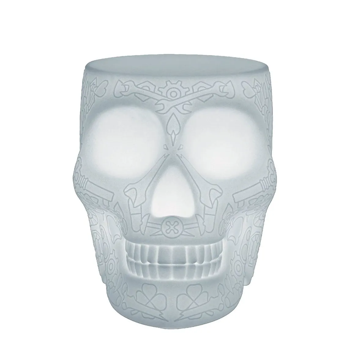 Mexico de Qeeboo par Studio Job. Mexico, conçue par Studio Job, est une lampe en forme de crâne avec un motif graphique sur la surface, fonctionnant également comme tabouret et table d’appoint. Rappelant les crânes peints traditionnels du pays du même nom, le Mexique est un rappel fantaisiste du caractère cyclique de notre présence sur Terre, pour exorciser la mort et célébrer la vie. Convient aux salons, aux salles à manger et aux espaces extérieurs. Sans fil, doté d’une batterie rechargeable, d’une lumière LED et de 16 couleurs RVB interchangeables différentes, il peut être régulé à distance par télécommande.