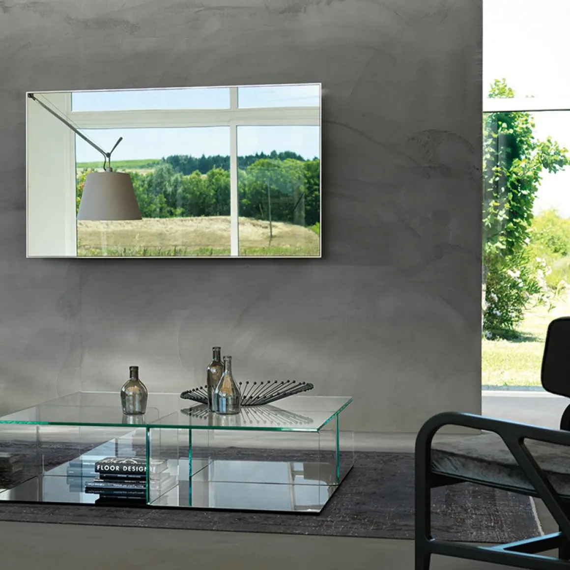 Miroir avec poste pour téléviseur. Miroir à accrocher en verre semi-réfléchissant de 5mm couleur titane avec cadre arrière en aluminium finition brillante. Cadre en métal verni noir mat. Téléviseur non fourni.