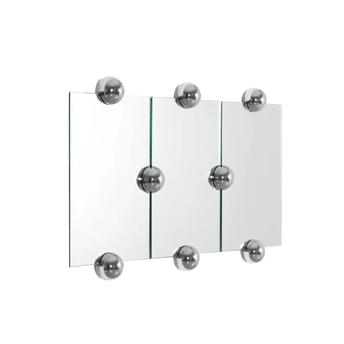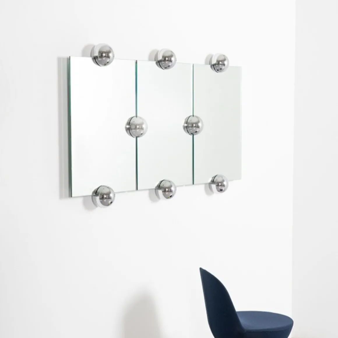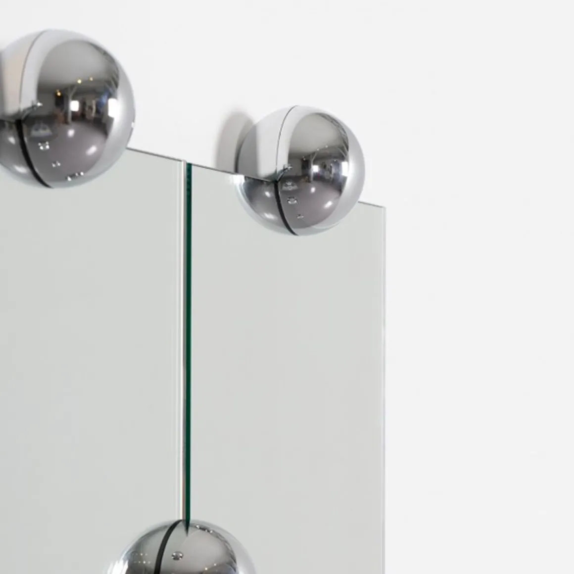 La collection de miroirs Sphera de Jean-Baptiste Fastrez est une interprétation contemporaine d’un dispositif technique pour créer des murs miroirs. Très en vogue dans la première moitié du 20 ième siècle la patte de miroir a depuis été réduite à sa seule fonction pour n’être plus aujourd’hui qu’une sorte de fixation à miroir vendu au rayon salle de bain des magasins de bricolage. Véritable système Sphera propose de renouer avec la tradition décorative de cet élément technique invisibilisé en lui offrant une dimension sculpturale inattendue et une flexibilité hors normes.