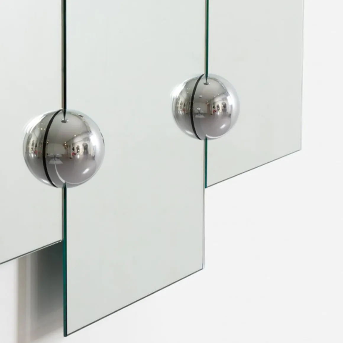 La collection de miroirs Sphera de Jean-Baptiste Fastrez est une interprétation contemporaine d’un dispositif technique pour créer des murs miroirs. Très en vogue dans la première moitié du 20 ième siècle la patte de miroir a depuis été réduite à sa seule fonction pour n’être plus aujourd’hui qu’une sorte de fixation à miroir vendu au rayon salle de bain des magasins de bricolage. Véritable système Sphera propose de renouer avec la tradition décorative de cet élément technique invisibilisé en lui offrant une dimension sculpturale inattendue et une flexibilité hors normes.
