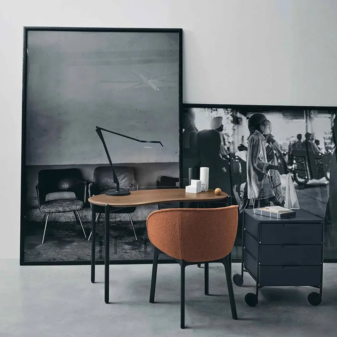 Réalisé dans un matériau recyclé, il est disponible dans une finition Mat en noir et blanc et dans les coloris inédits prune, vert et bleu ciel. Le tiroir, élément de base de ce système de rangement, est alterné à des étagères et plateaux supérieurs reliés par une structure en aluminium. Initialement pensé pour le bureau, Mobil saura s’intégrer dans toutes les pièces de la maison, que cela soit la chambre à coucher, le séjour ou la salle de bains.