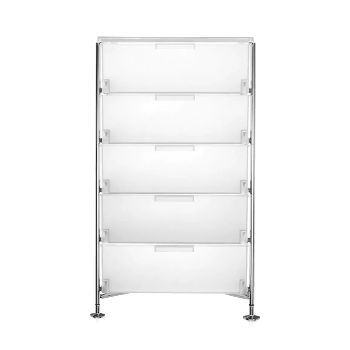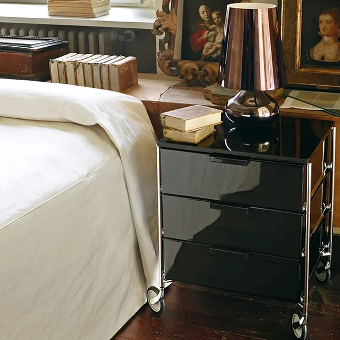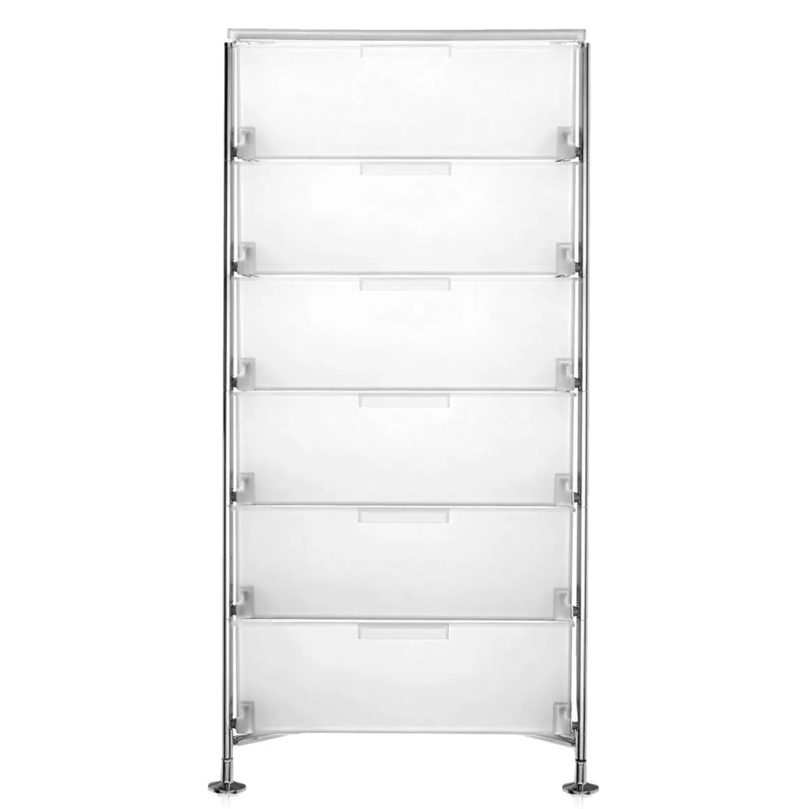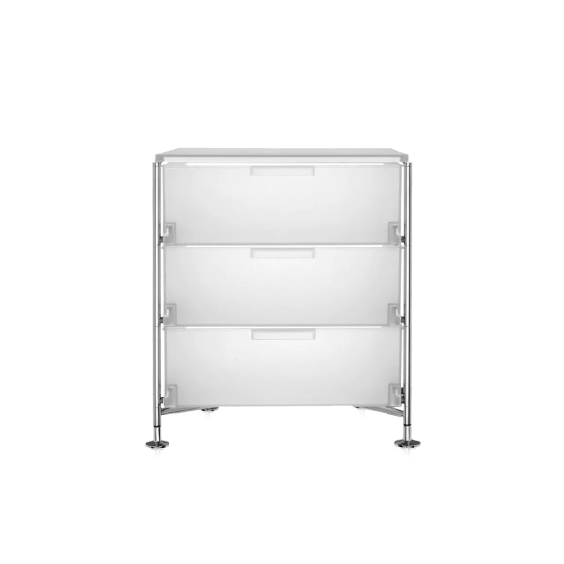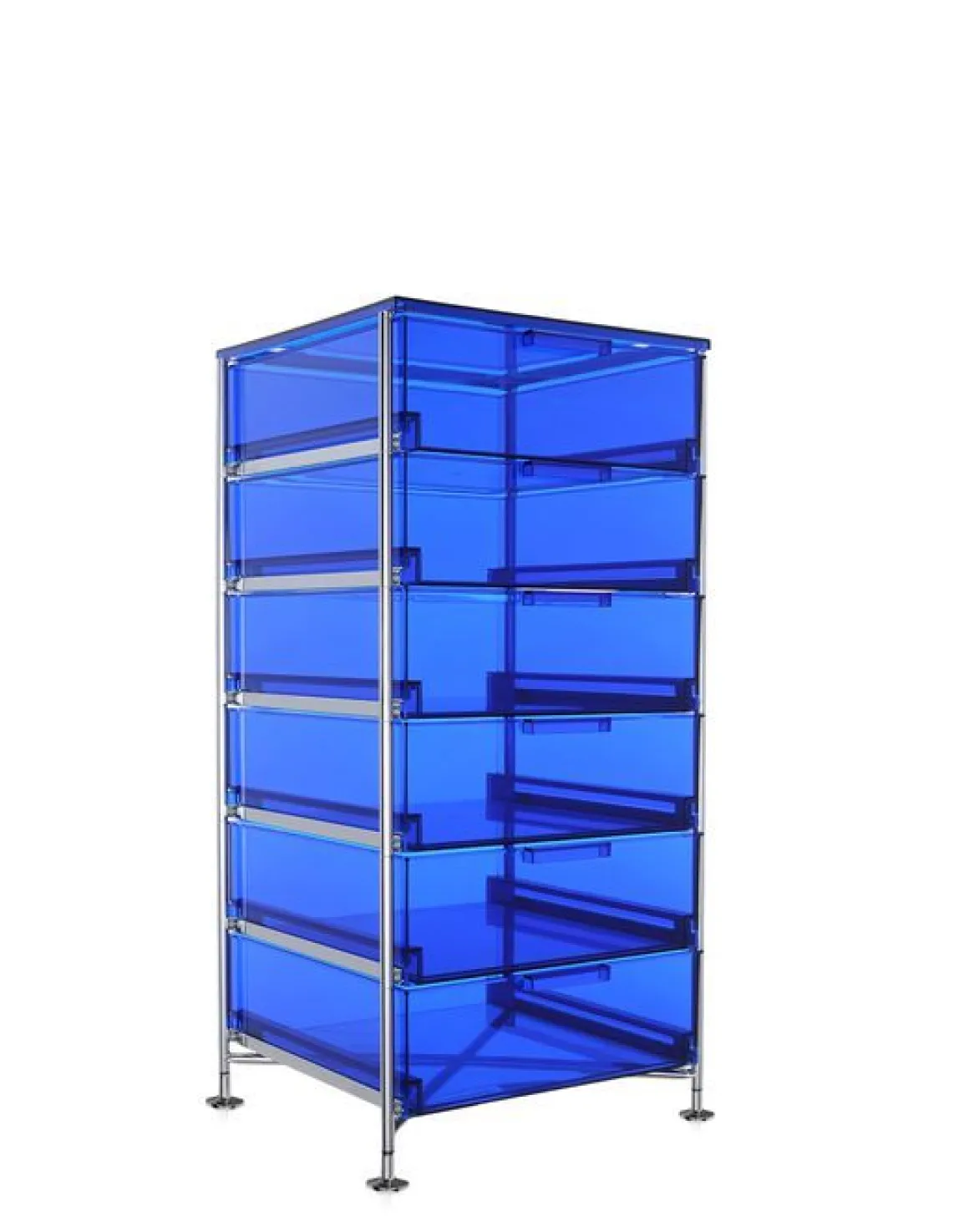 Mobil est un système d’éléments de rangement alliant légèreté, mobilité, fonctionnalité, résistance et durabilité. Par leur design et le glamour des coloris proposés, ces éléments s’intègrent dans toutes les pièces de la maison et des lieux de travail, répondant à diverses fonctions d’utilisation. Les étagères et les tiroirs sont disponibles en trois finitions : avec un heureux effet de semi-transparence, mats et brillants dans la version en PMMA transparent. S’insérant entre les étagères, le tiroir est l’élément de base du système. Mobil peut être un simple bloc de 2 à 6 tiroirs, être doté de poignées et se composer de deux modules accolés, disponibles en diverses hauteurs. Les configurations possibles reposent sur roulettes ou pieds fixes permettant l’utilisation de Mobil dans différents types de lieux : de la chambre à coucher au séjour où il pourra servir comme base pour chaîne Hi-Fi, au cabinet de travail ou au bureau comme bloc-tiroirs pour ranger fournitures et documents.