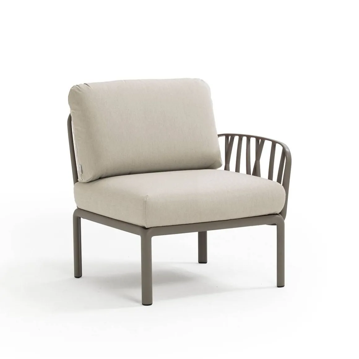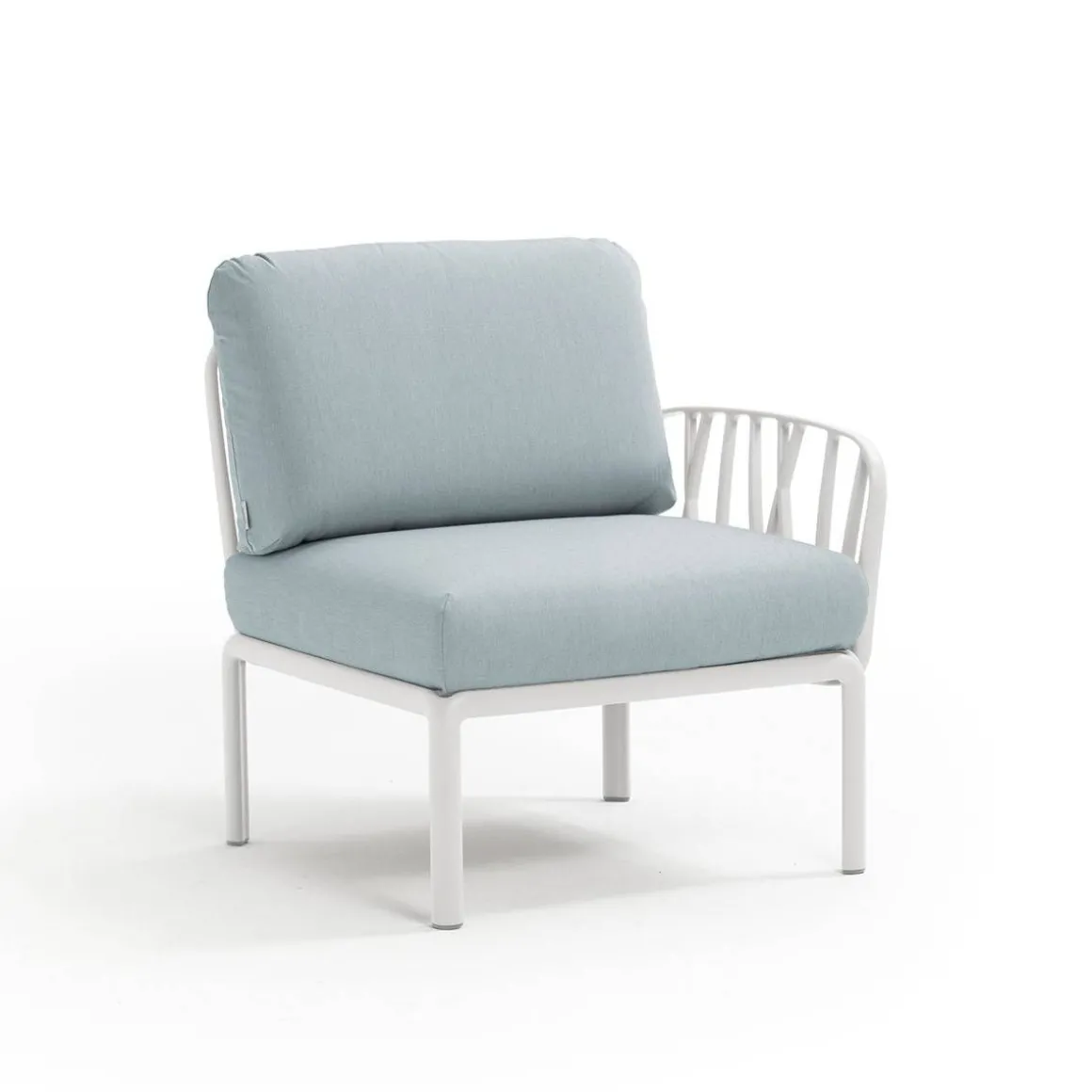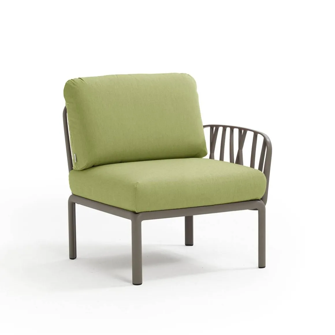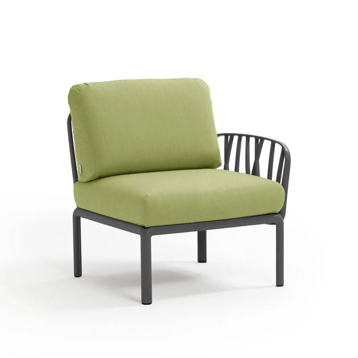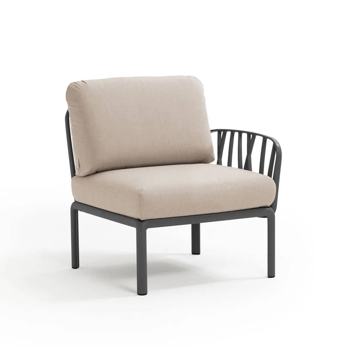 Fauteuil à accoudoir (droite ou gauche) en résine fibre de verre et élément rembourrés pouvant être configuré comme élément initial ou final dans une composition d’assises modulaires de la collection Komodo.
