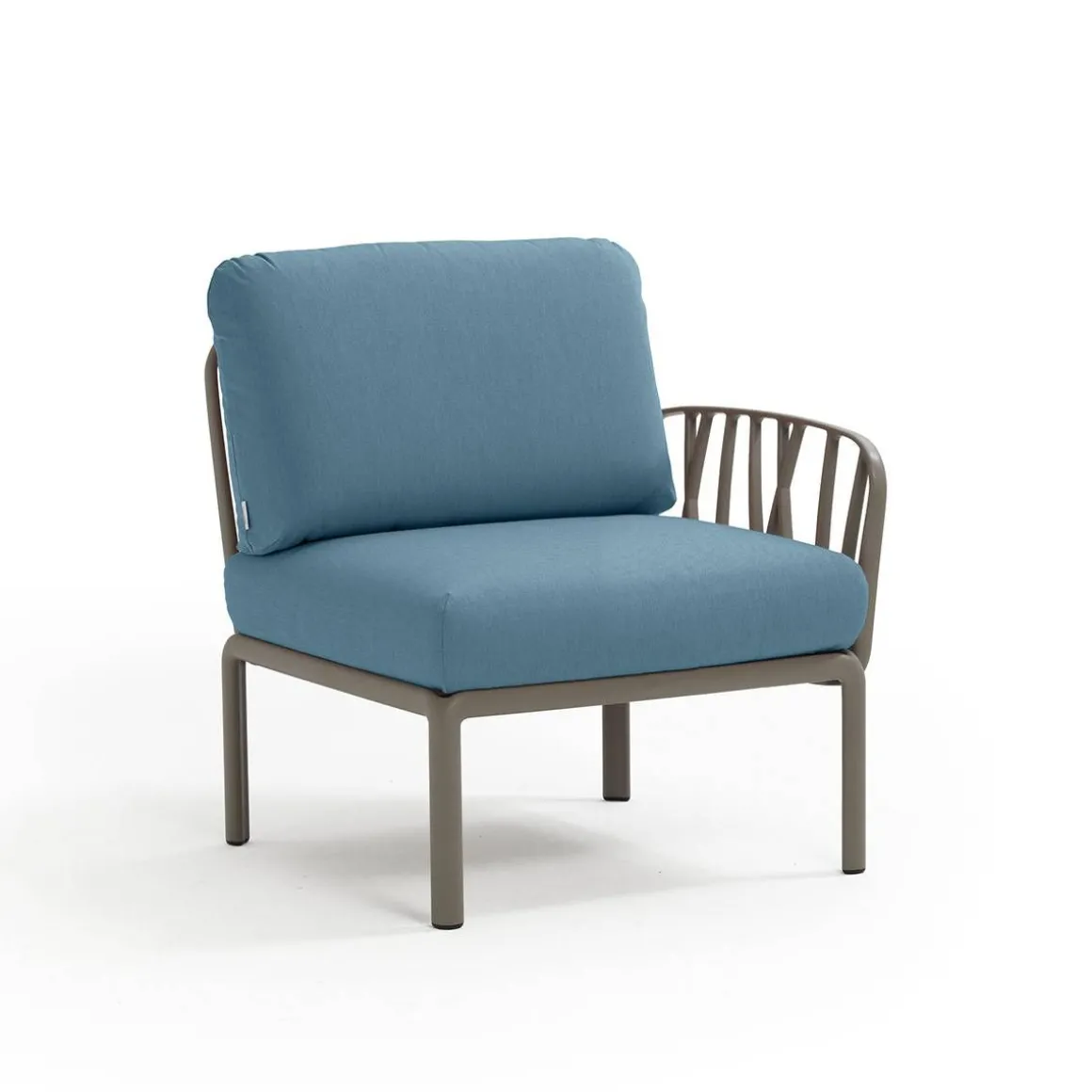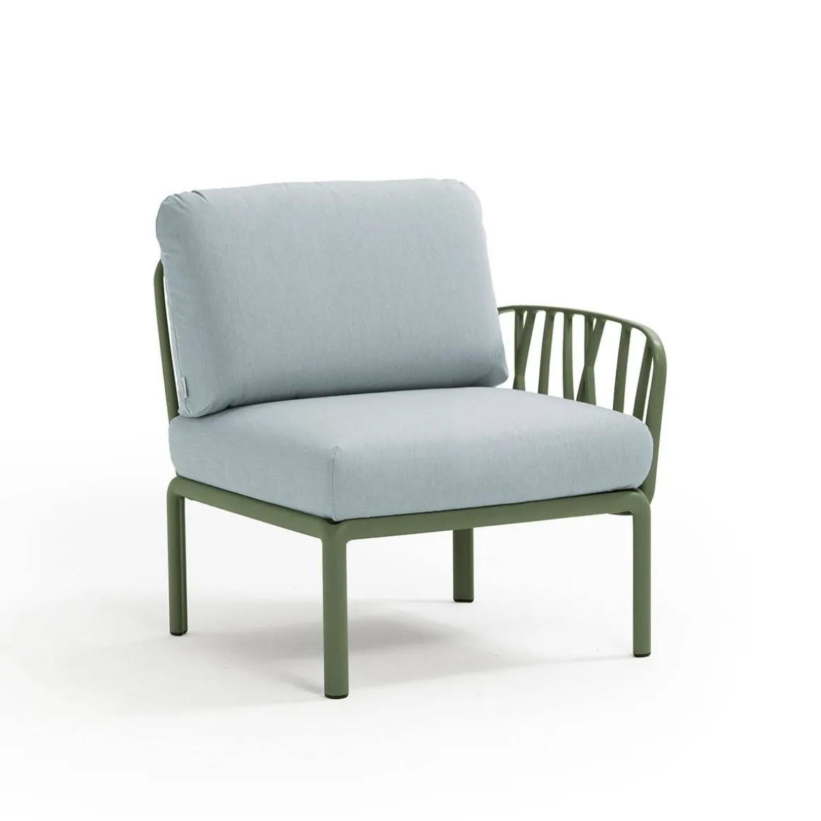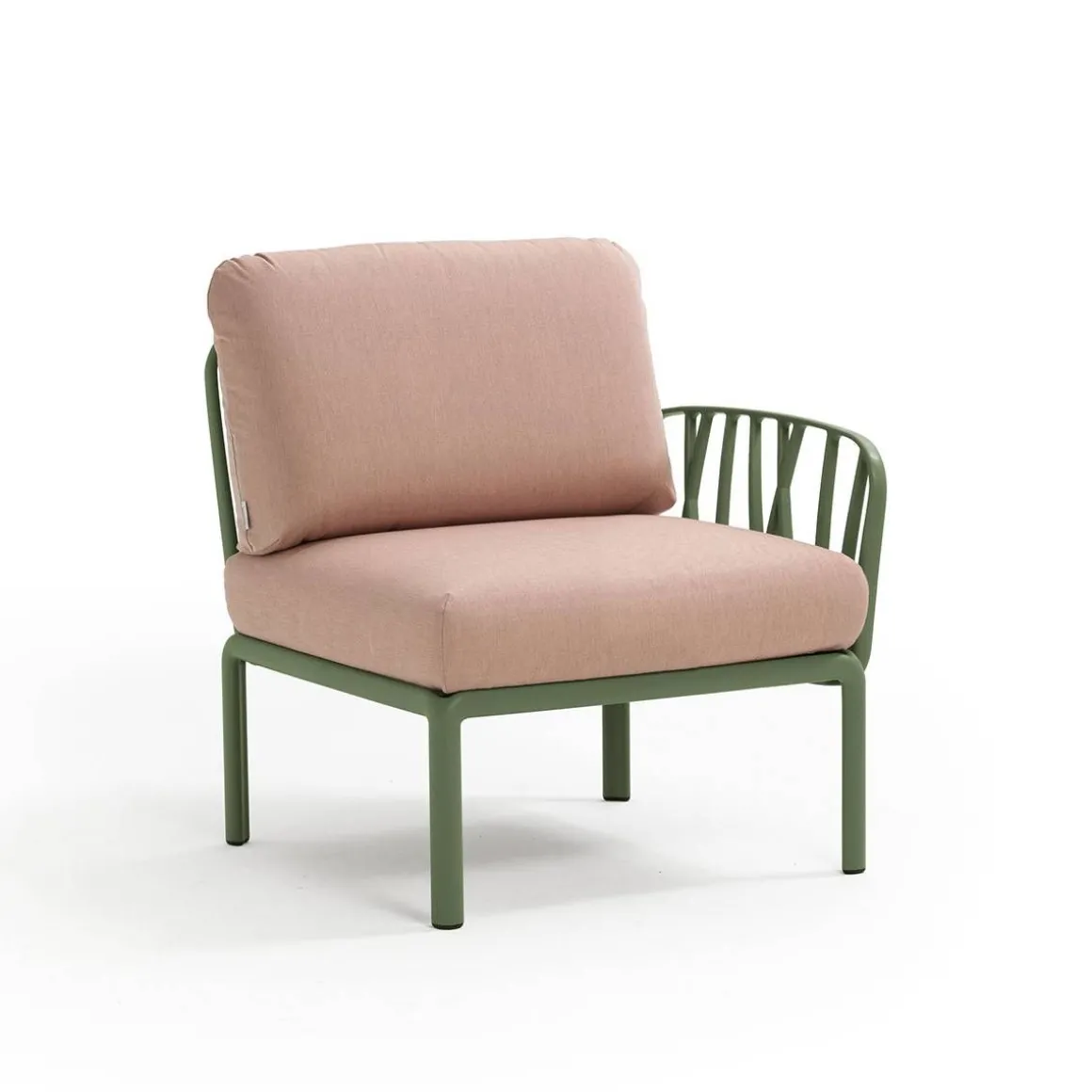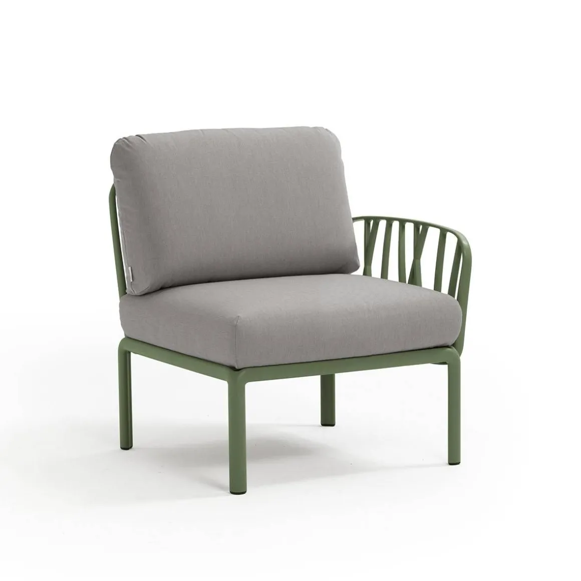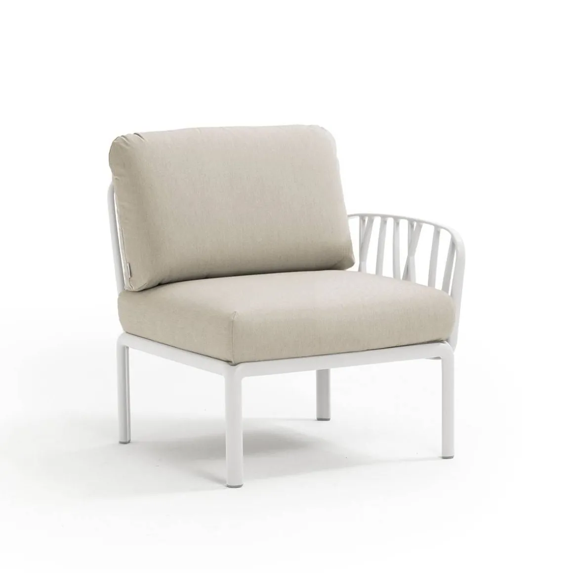 Fauteuil à accoudoir (droite ou gauche) en résine fibre de verre et élément rembourrés pouvant être configuré comme élément initial ou final dans une composition d’assises modulaires de la collection Komodo.