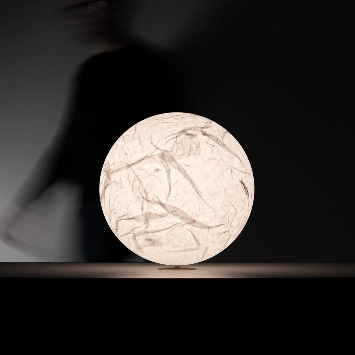 Moon T de Davide Groppi. C’est magique. Et cela fonctionne toujours, comme tous les tours de magie. Vue d’ici bas la lune présente mille nuances. Et chaque fois qu’elle revient, parfaitement pleine, elle provoque un petit sursaut chez ceux qui l’observe. Moon naît d’un rêve, celui de porter la lune dans les logements. La surface de papier japonais, fait à la main, rend chaque pièce unique.