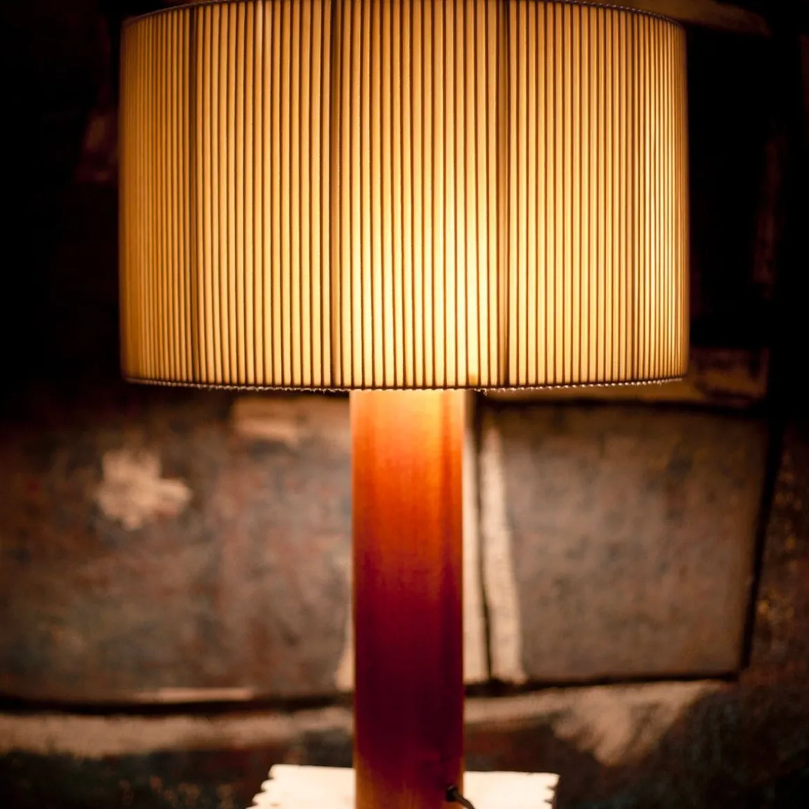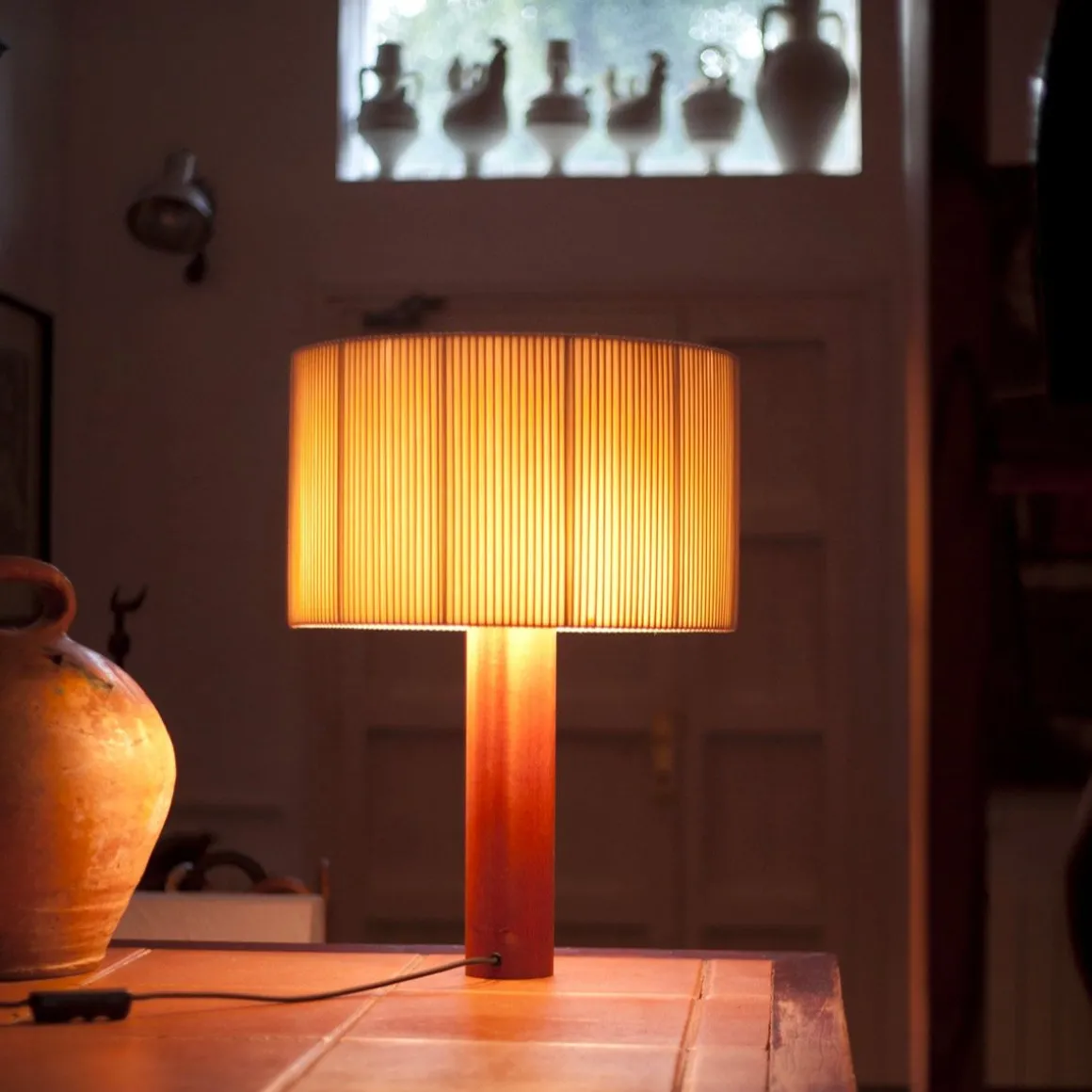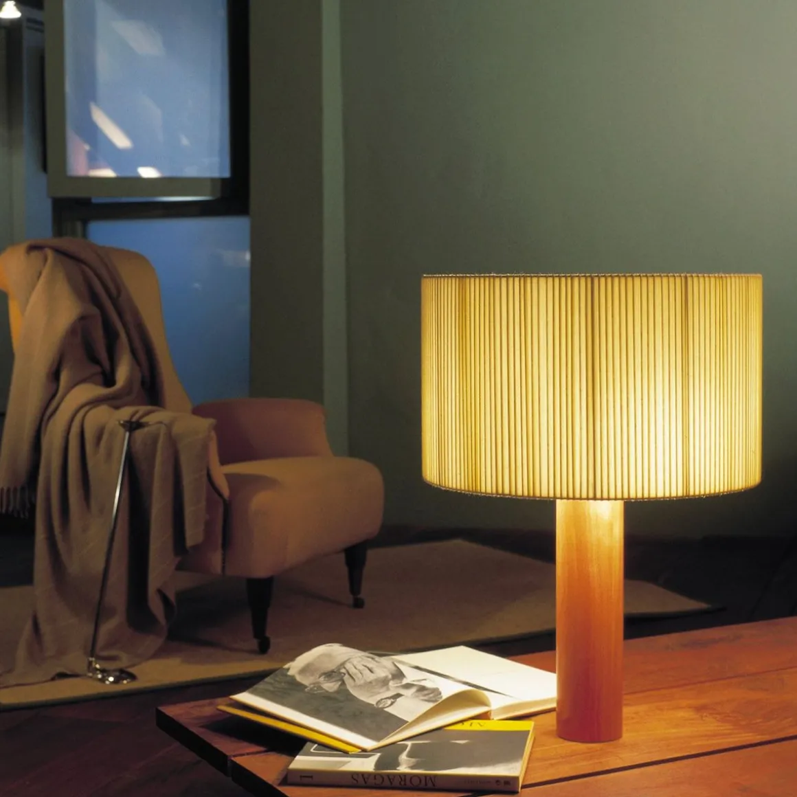 Lampe de table à l’allure sereine, pionnière d’une modernité qui exprime le tempérament pragmatique d’un grand pionnier espagnol. Un fût central de bois massif soutient un généreux abat-jour circulaire en galons de coton. Le ruban de reliure pour livres par son tissage asymétrique produit d’apaisants clairs-obscurs.
