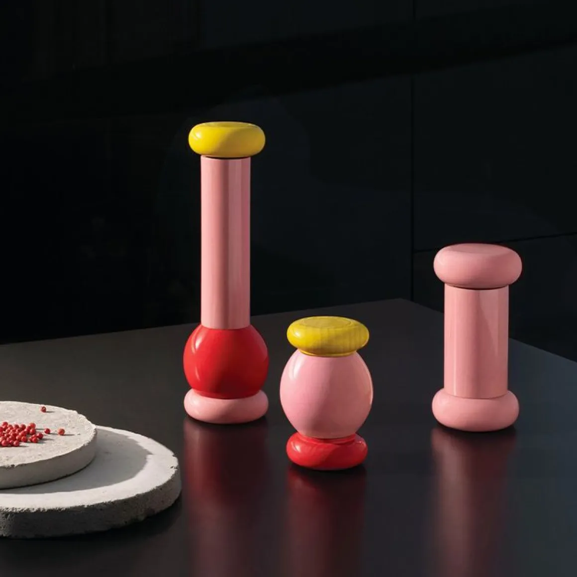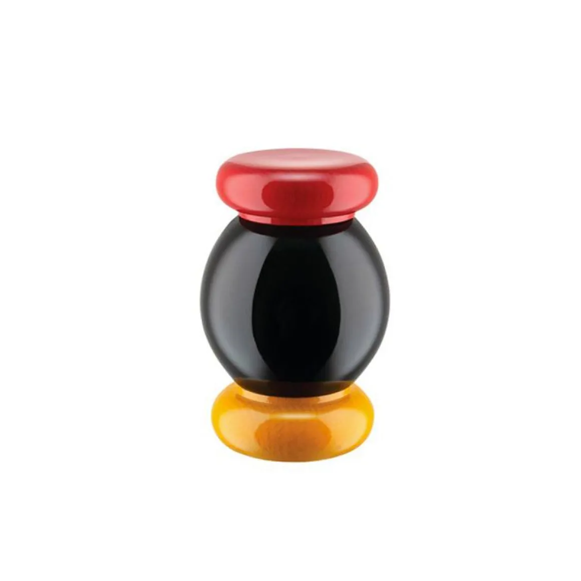 Moulin à sel de Alessi par Ettore Sottsass. Ce moulin à sel fait partie d’une collection d’objets inédites pour fêter 100 ans de recherche dans le domaine des arts appliqués et le début d’un nouveau siècle d’expérimentations. Indispensable dans toute cuisine et à table pour les repas quotidiens, ce moulin est imaginé par Ettore Sottsass, reprenant les volumes colorés superposés typiques de son style. Il est fabriqué en Italie, où Alessi a son siège, grâce à un processus de tournage en partie manuel. Les variations dans le grain, les noeuds et l’aspect du bois font de chaque moulin une pièce unique, à nulle autre pareille.