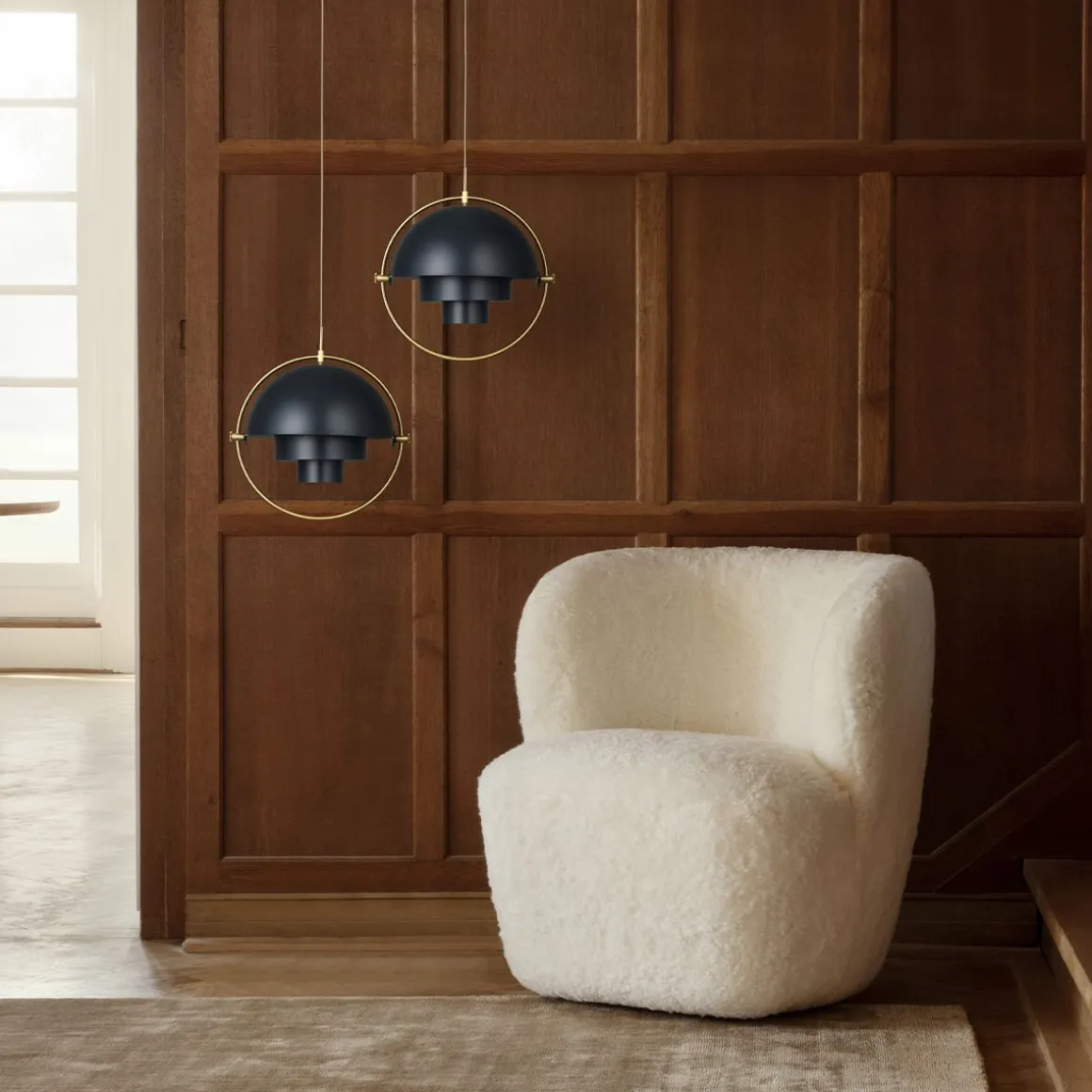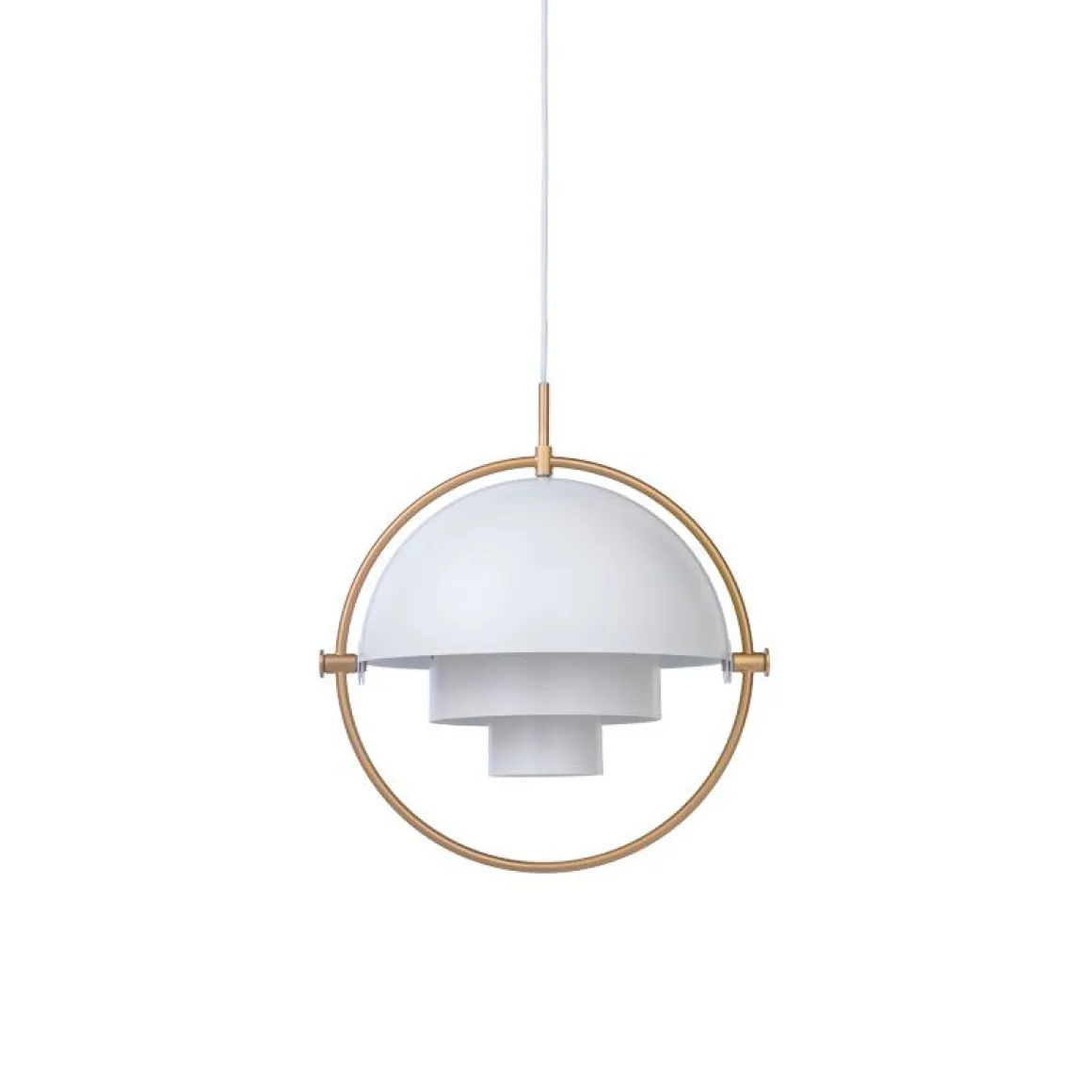 Le Multi-Lite a d’abord été dessiné en 1972 lorsque Louis Weisdorf a fait une exception à sa propre conception de l’utilisation de multiples éléments répétitifs. Il reflète plutôt sa passion pour la diversité. Deux formes cylindriques posent la base de la lampe et une bague métallique l’entoure et ancre les deux abat-jours quart-sphériques, qui finalement complètent une image d’un design iconique avec de multiples fins. La lampe suspendue Multi-Lite a une expression intemporelle qui s’adapte dans n’importe quel cadre domestique.
