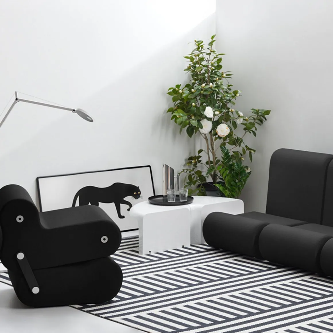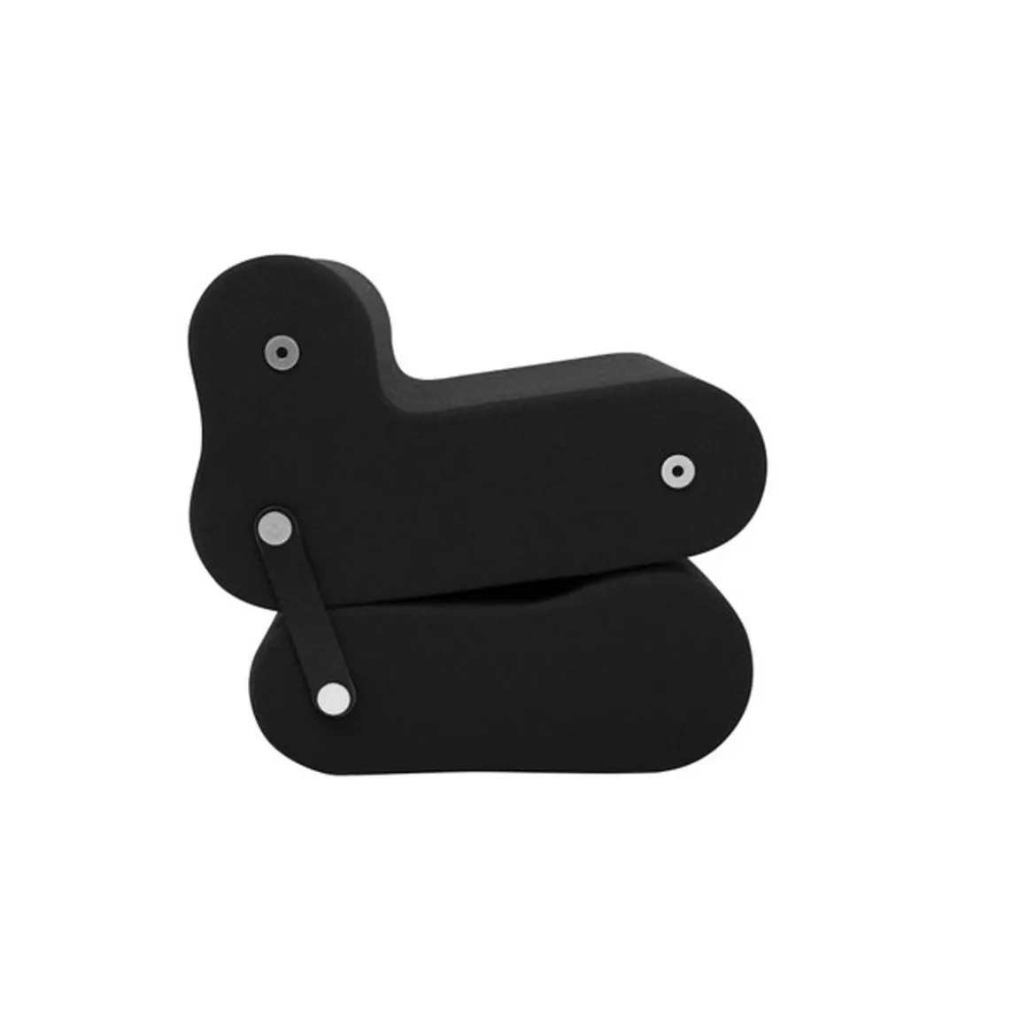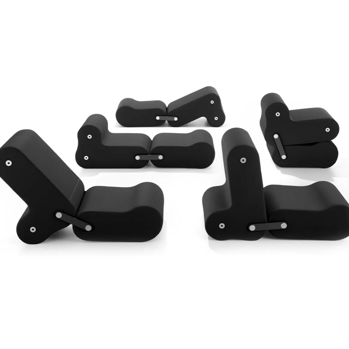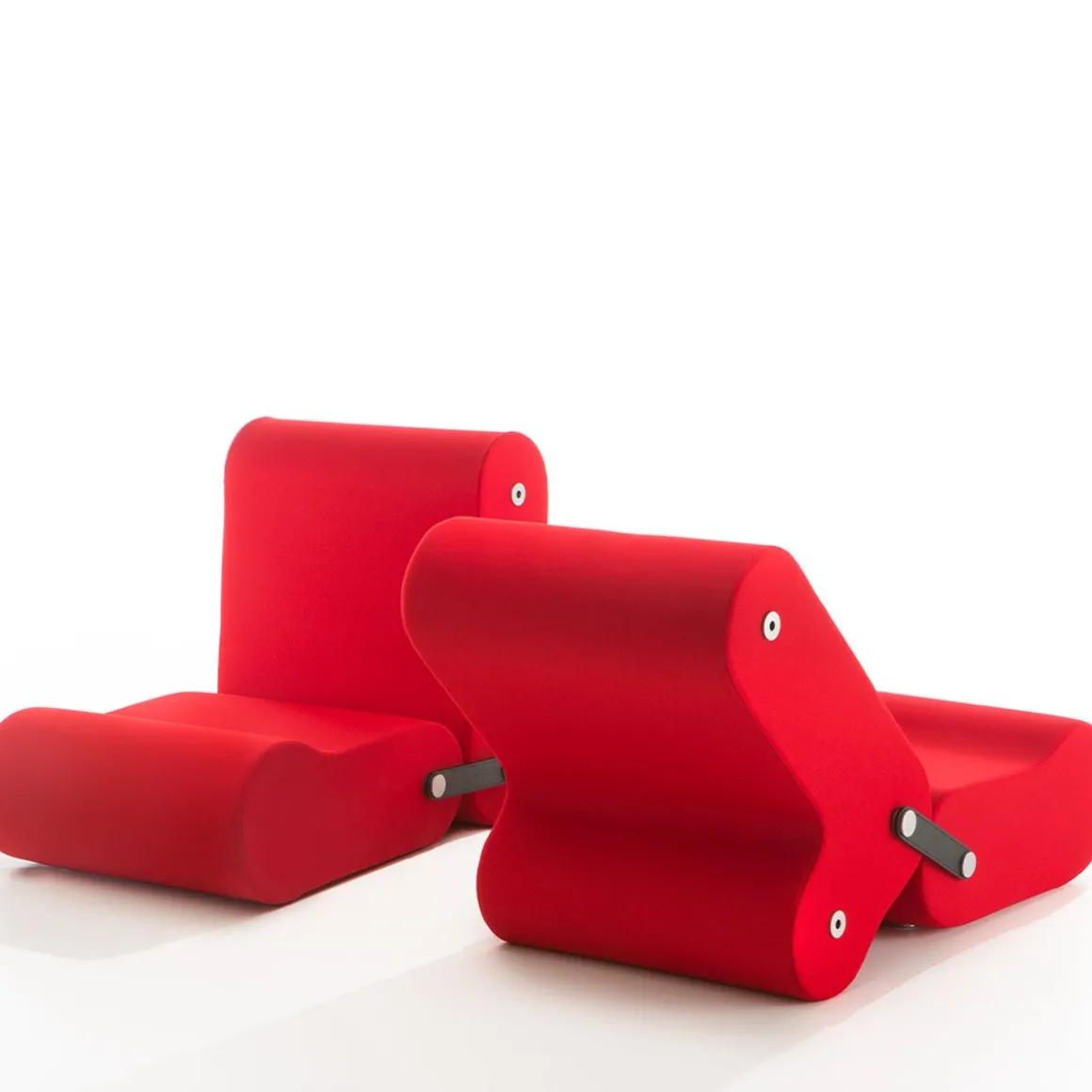 Multichair est un système convertible composé de deux éléments individuels qui peuvent facilement se transformer en chaise de conversation/relaxation. Il s’agit d’un produit conçu avec toute l’attention et le respect que mérite une véritable icône du design. Les deux coussins ont une structure interne en acier et sont recouverts de mousse de polyuréthane. Sur les bords, le tissu extensible du rembourrage est collé pour garder sa forme inchangée, tandis que les ceintures en cuir, à l’aide d’épingles et de boucles, maintiennent les éléments ensemble. Au-delà du contenu technique et de la qualité des matériaux, Multichair se caractérise également par un double esprit, un peu sérieux et un peu informel, dans un style pop parfait.
