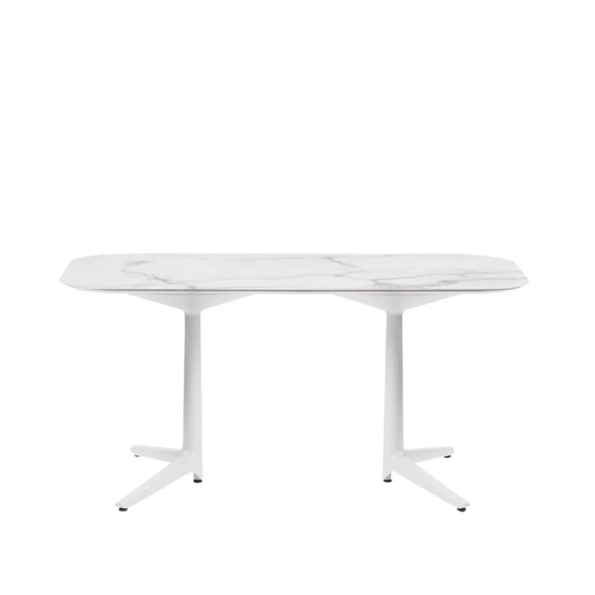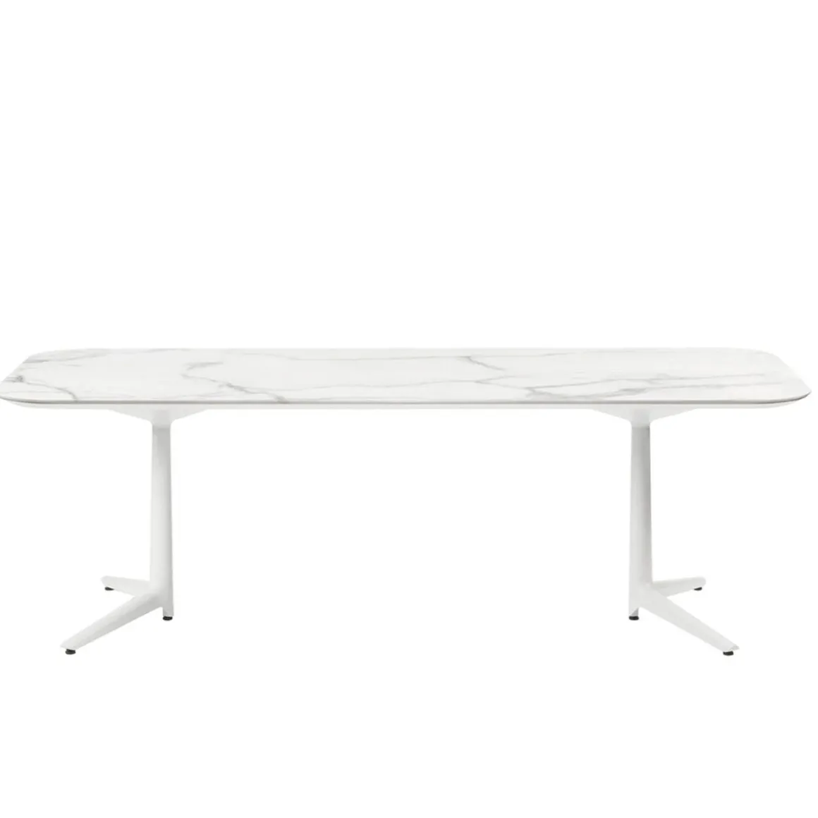 Multiplo XL rectangular Outdoor de Kartell par Antonio Citterio. Multiplo est une très large collection de tables, aux applications transversales, pensées pour être personnalisées, en jouant sur les formes (carrées aux coins arrondis, rondes et ovales) et la combinaison de piètements (piètement central, à deux, trois ou quatre branches) et de plateaux (en grès uni ou finition marbre et verre).